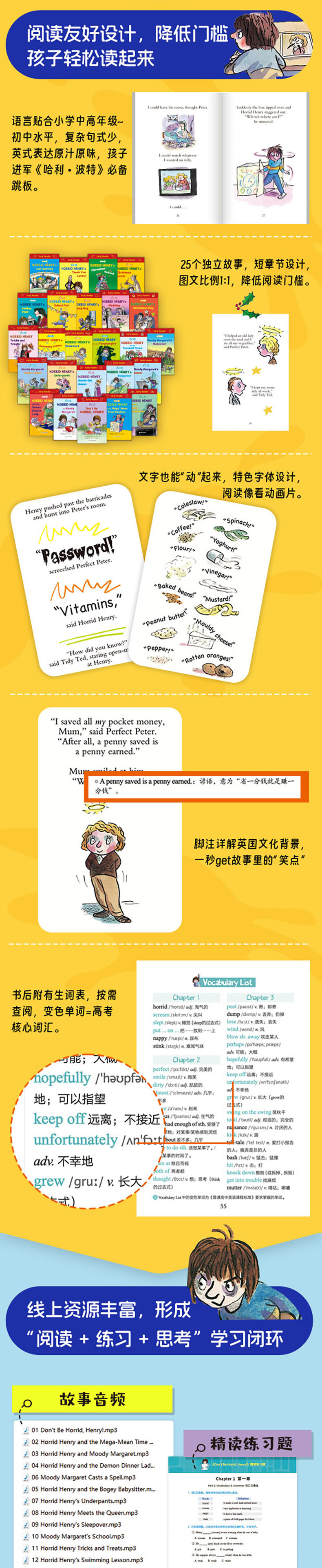 全书为四色全彩插画,图文比例1:1,搭配特色字体设计,阅读体验如同看动画片。每册书后附有生词表,高考核心词汇用变色标记,方便孩子查阅记忆;书中还设有脚注,详解英国文化背景,帮助孩子精准get故事“笑点”。