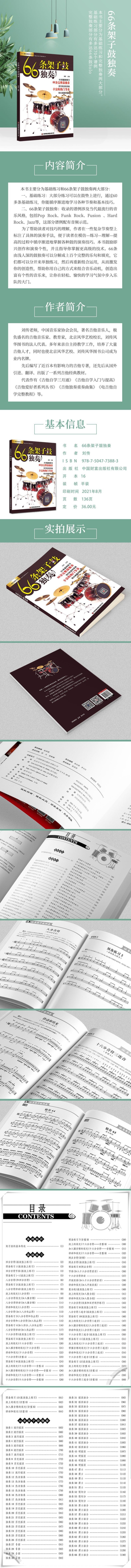 本书主要分为基础练习和66条架子鼓独奏两大部分:一、基础练习:大部分练习可以在鼓垫上进行,通过60多条基础练习,你能循序渐进地学习各种节奏和基本技巧。二、66条架子鼓独奏:收录的谱例涉及当代流行的音乐风格,包括Pop Rock、Funk Rock、Fusion、Hard Rock、Jazz等,这部分谱例配有音频示范。