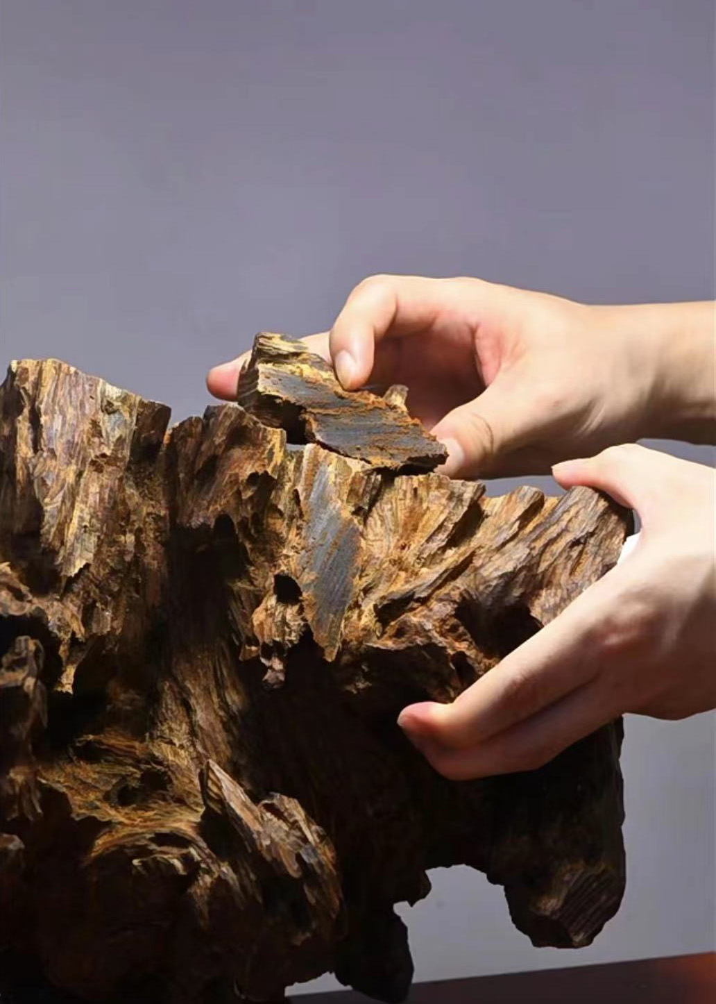 高等级的奇楠,醇化度非常高,不仅以指甲顺纹划过能感到粘软,如果真正推过时,还能如刨花般卷起。