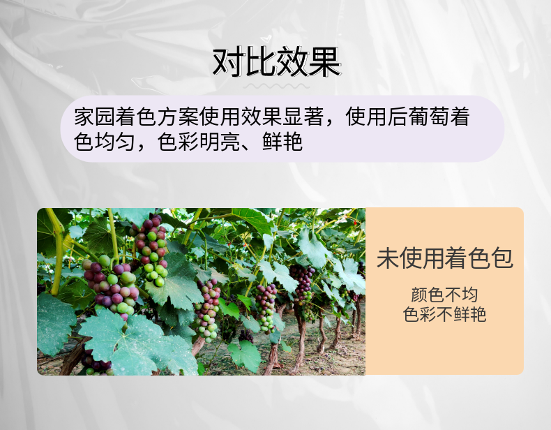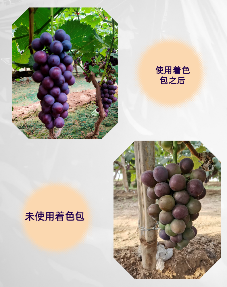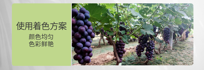 2.使用时期及方法:在葡萄转色初期,显色20%左右施用着色效果最佳,1套随水冲施1亩地,让葡萄根系吸收即可。