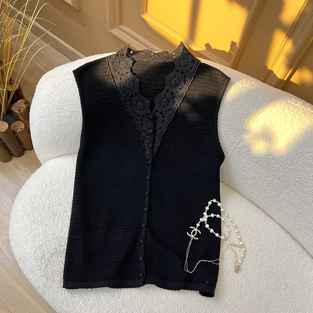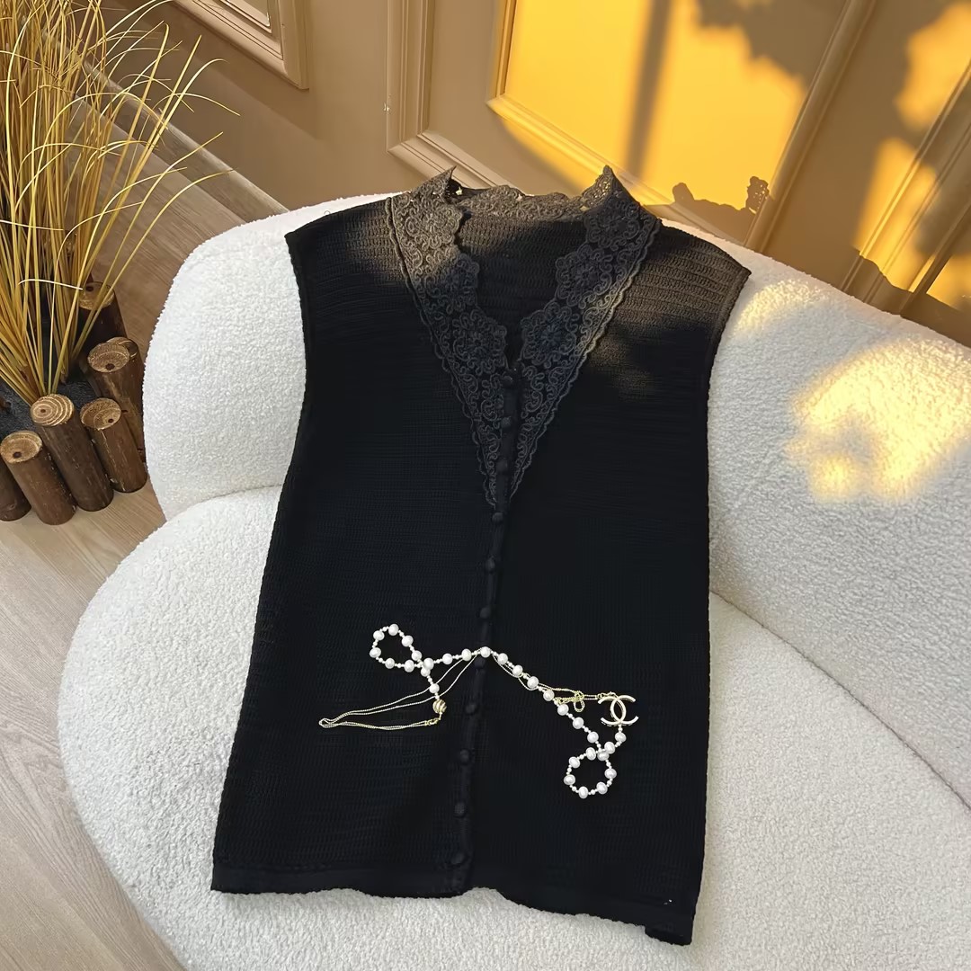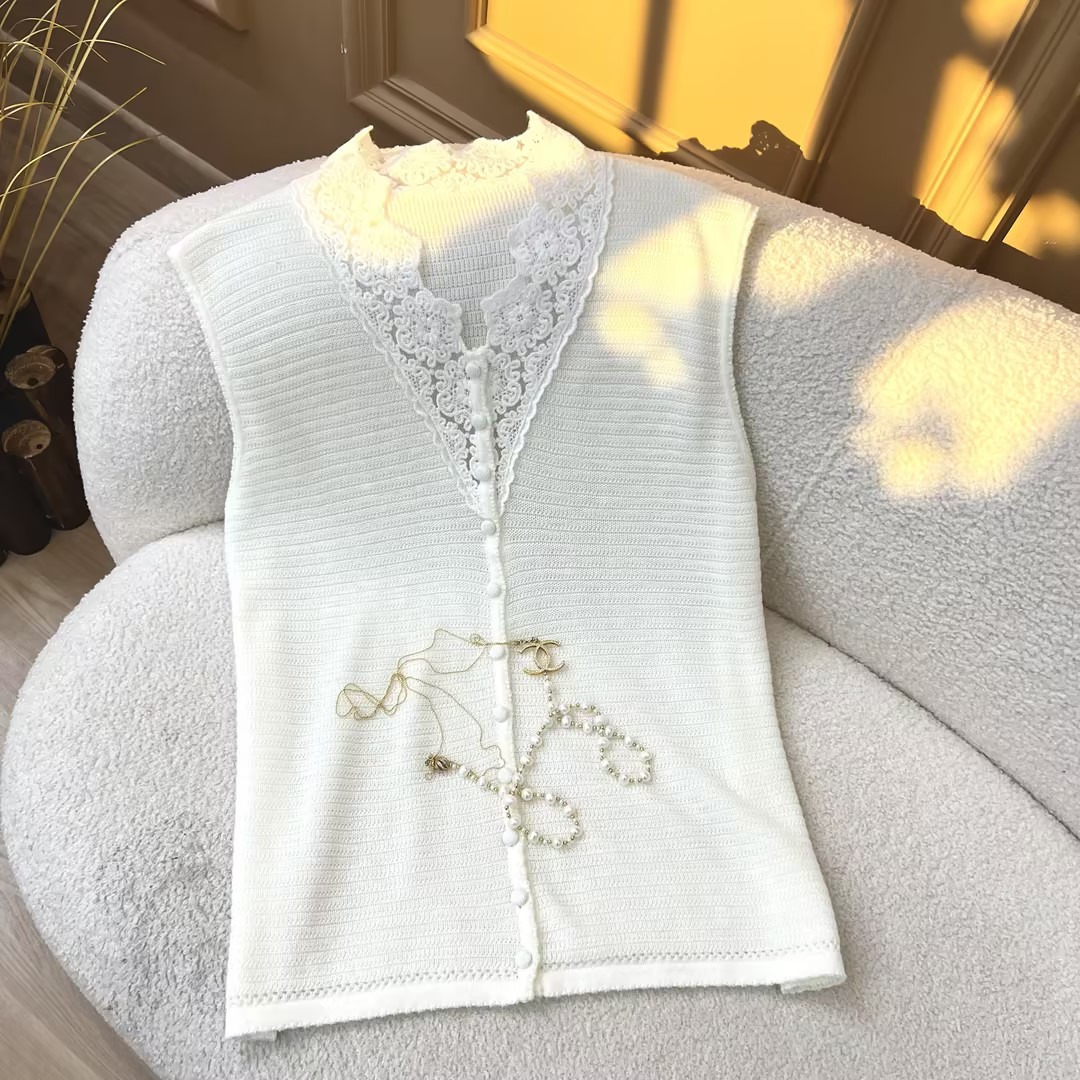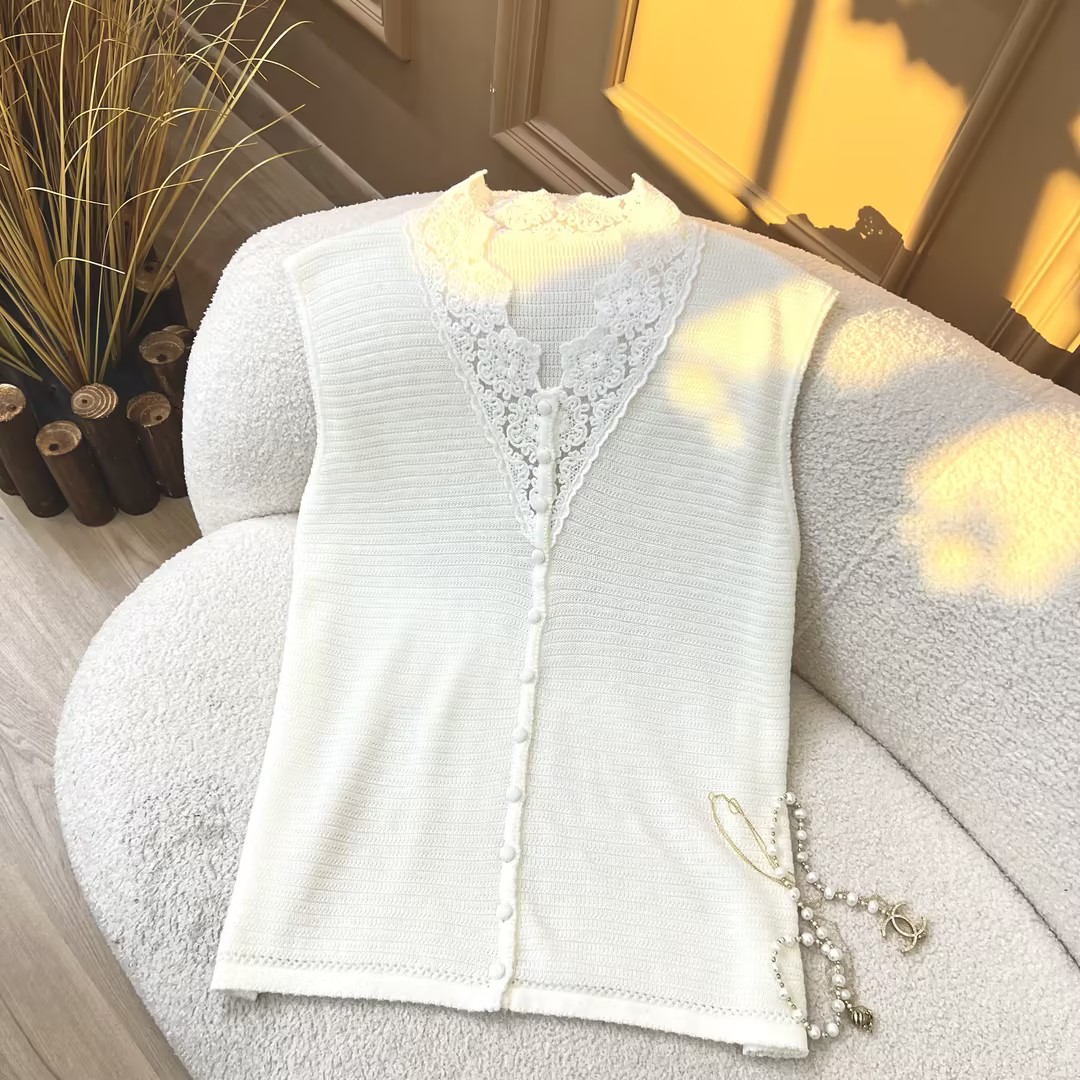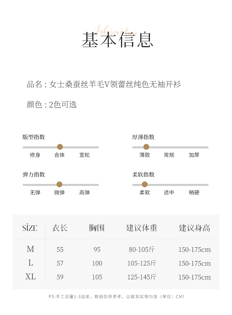 云纱清韵~桑蚕丝羊毛v领蕾丝纯色无袖开衫