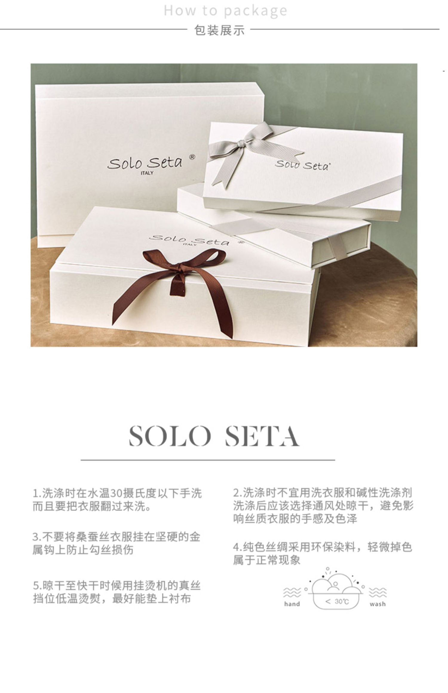 - soloseta专注于真丝织物,灵感源自意大利语,中文含义为“只做真丝”的意思。让睡衣变时尚,居家和外出瞬间切换,使其更具有出街,度假,参加宴会等功能。