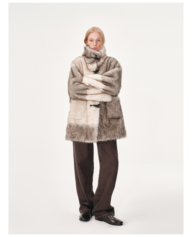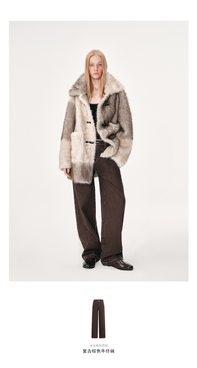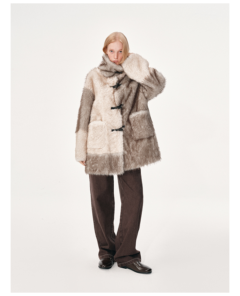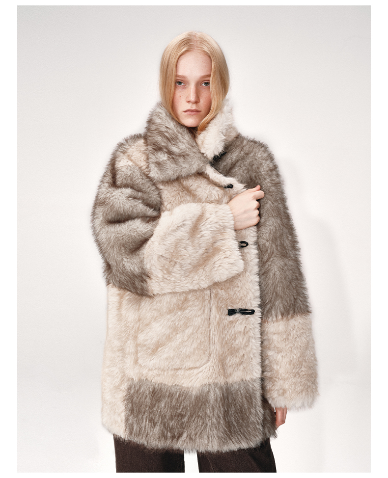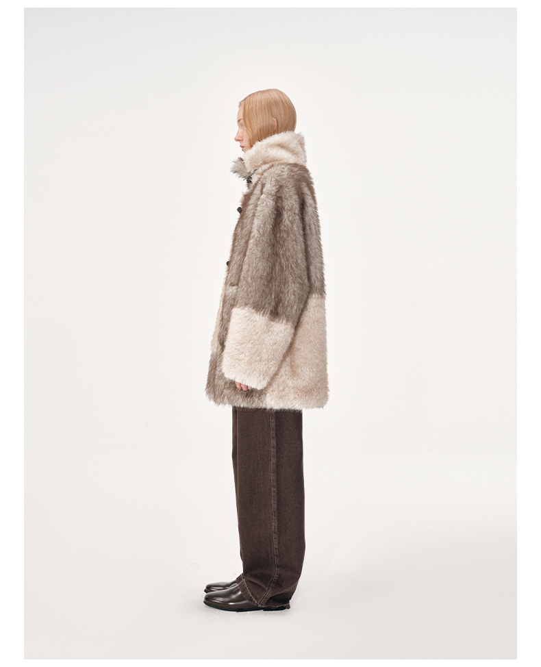 NUTH 人造皮草 牛角扣宽松中长款拼色皮草外套女(发货时间同步天猫)