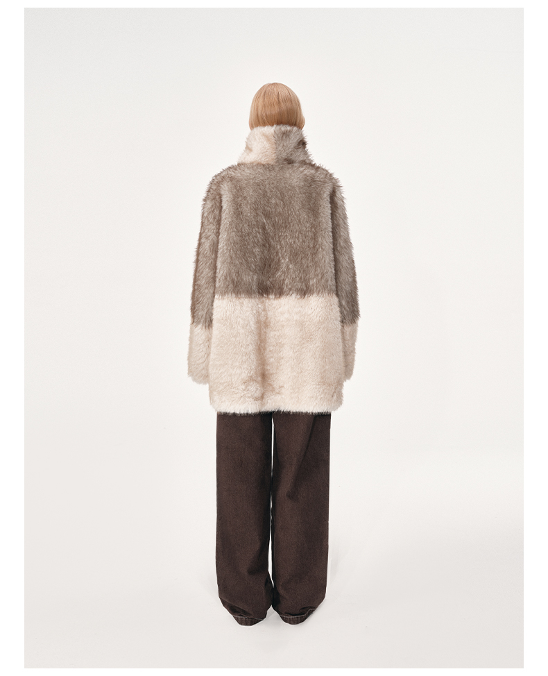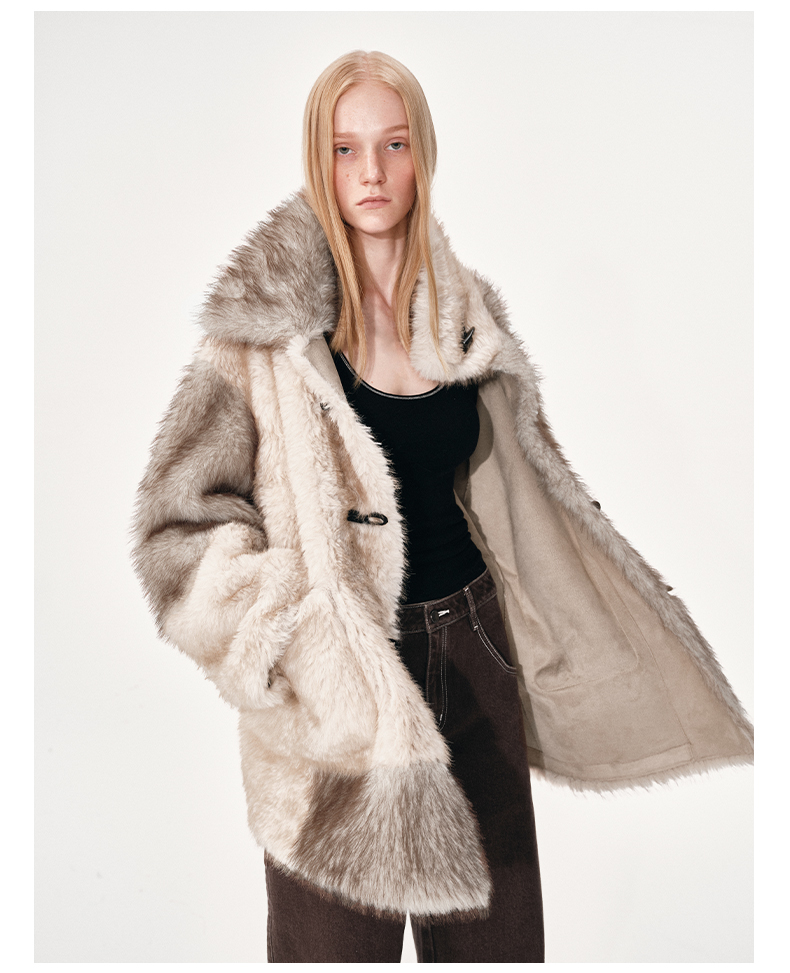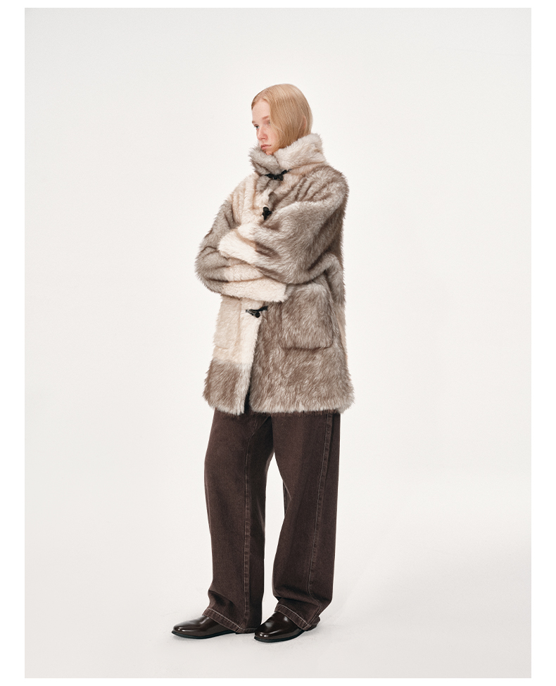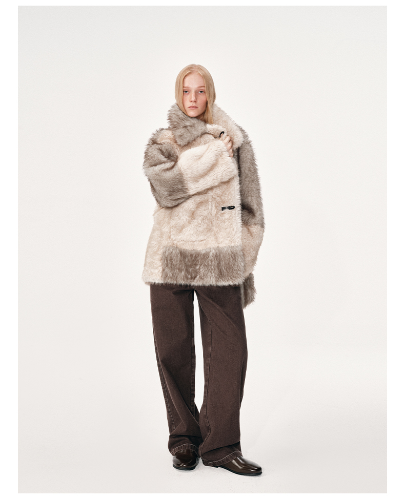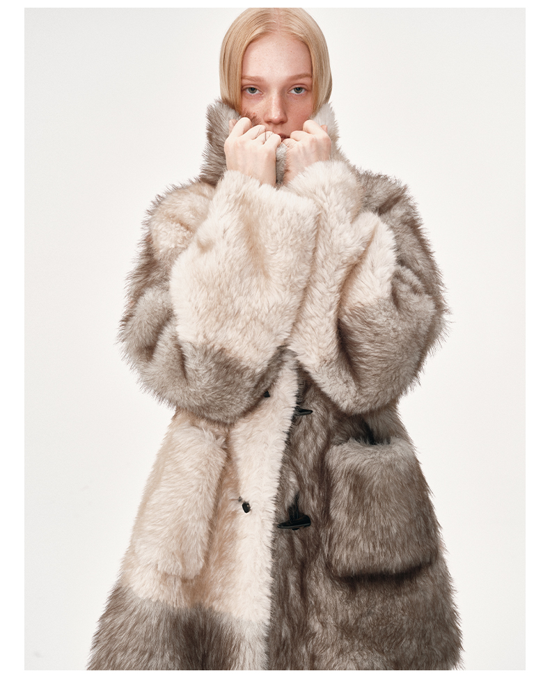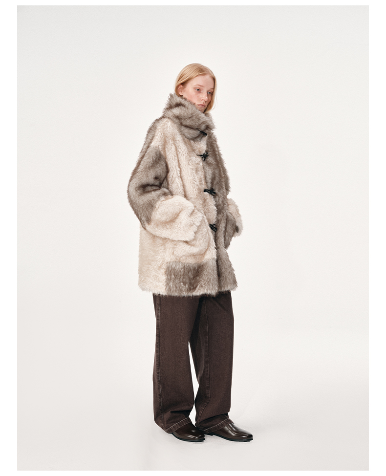 NUTH 人造皮草 牛角扣宽松中长款拼色皮草外套女(发货时间同步天猫)