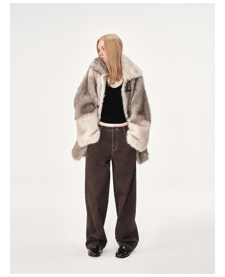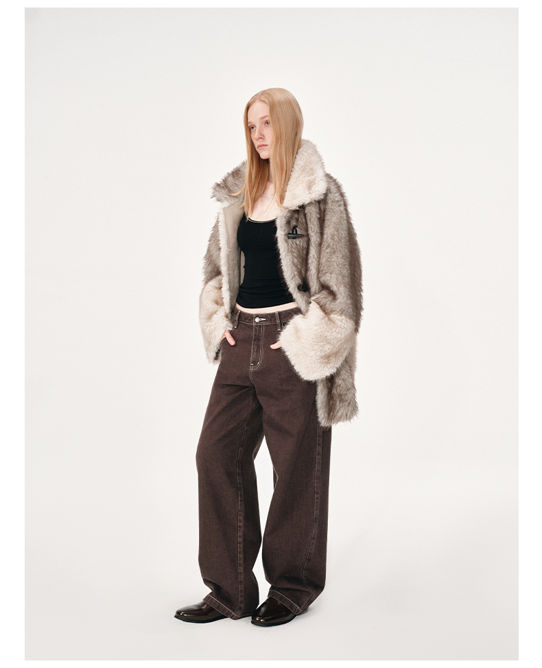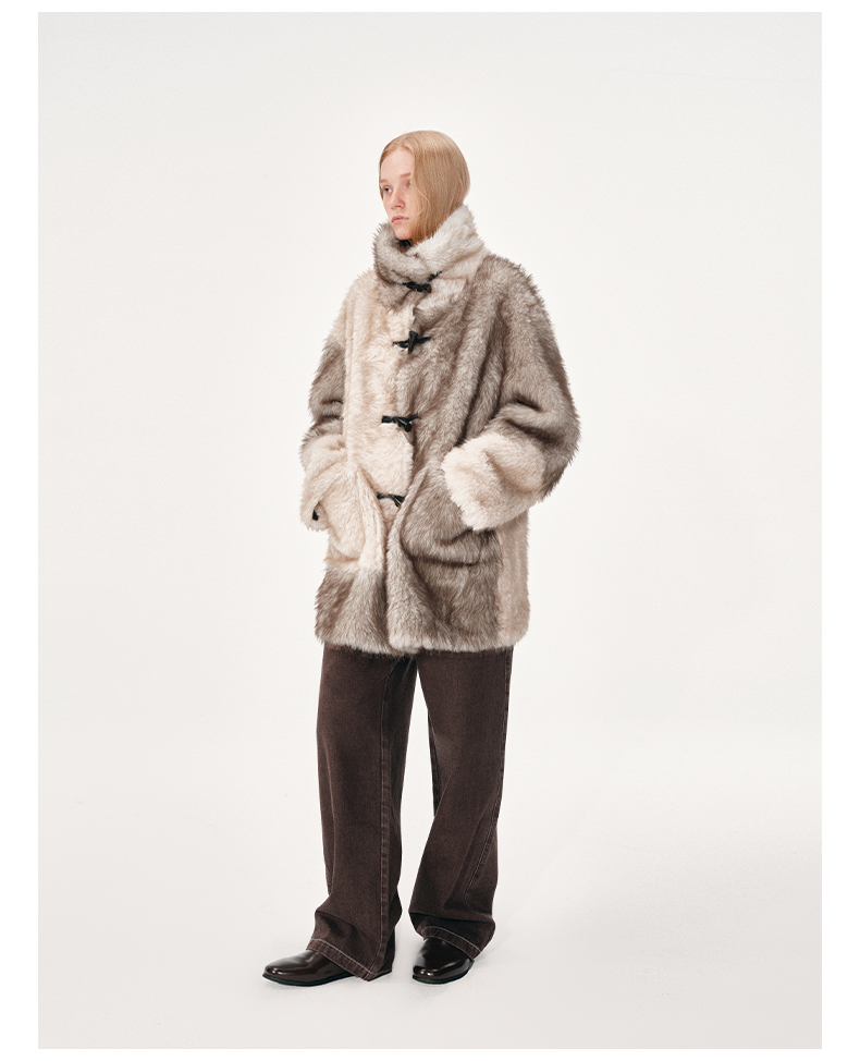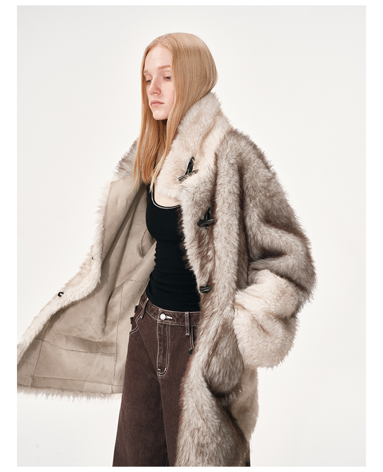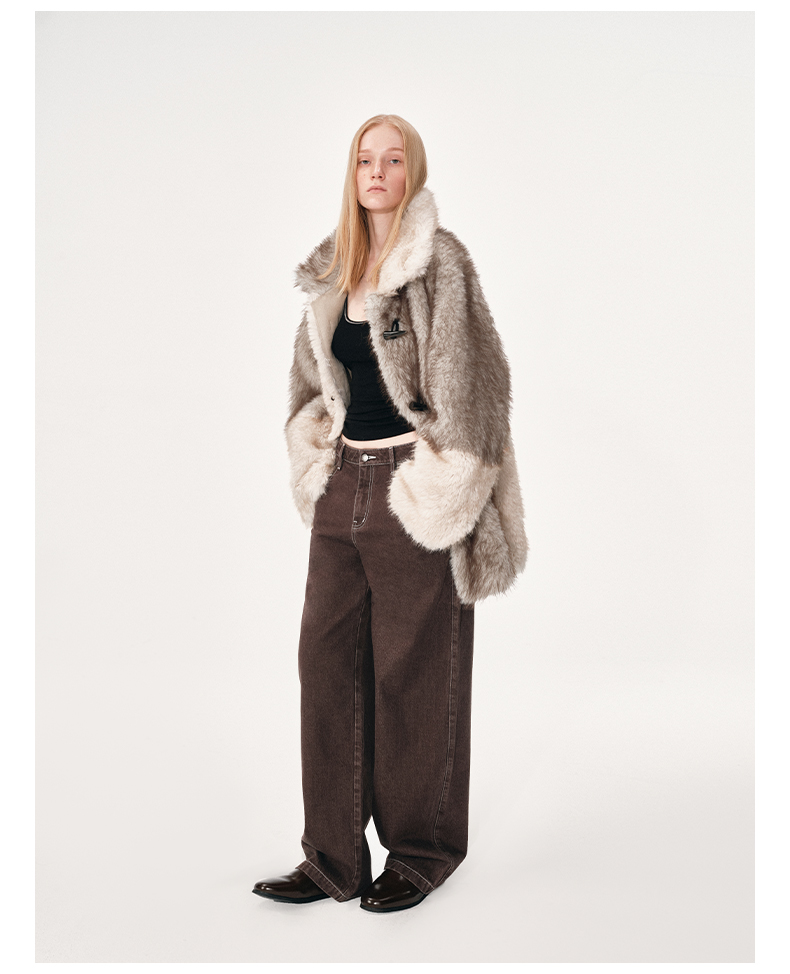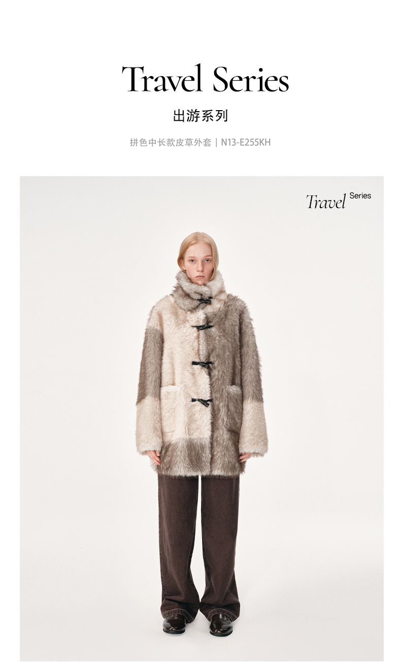NUTH 人造皮草 牛角扣宽松中长款拼色皮草外套女(发货时间同步天猫)