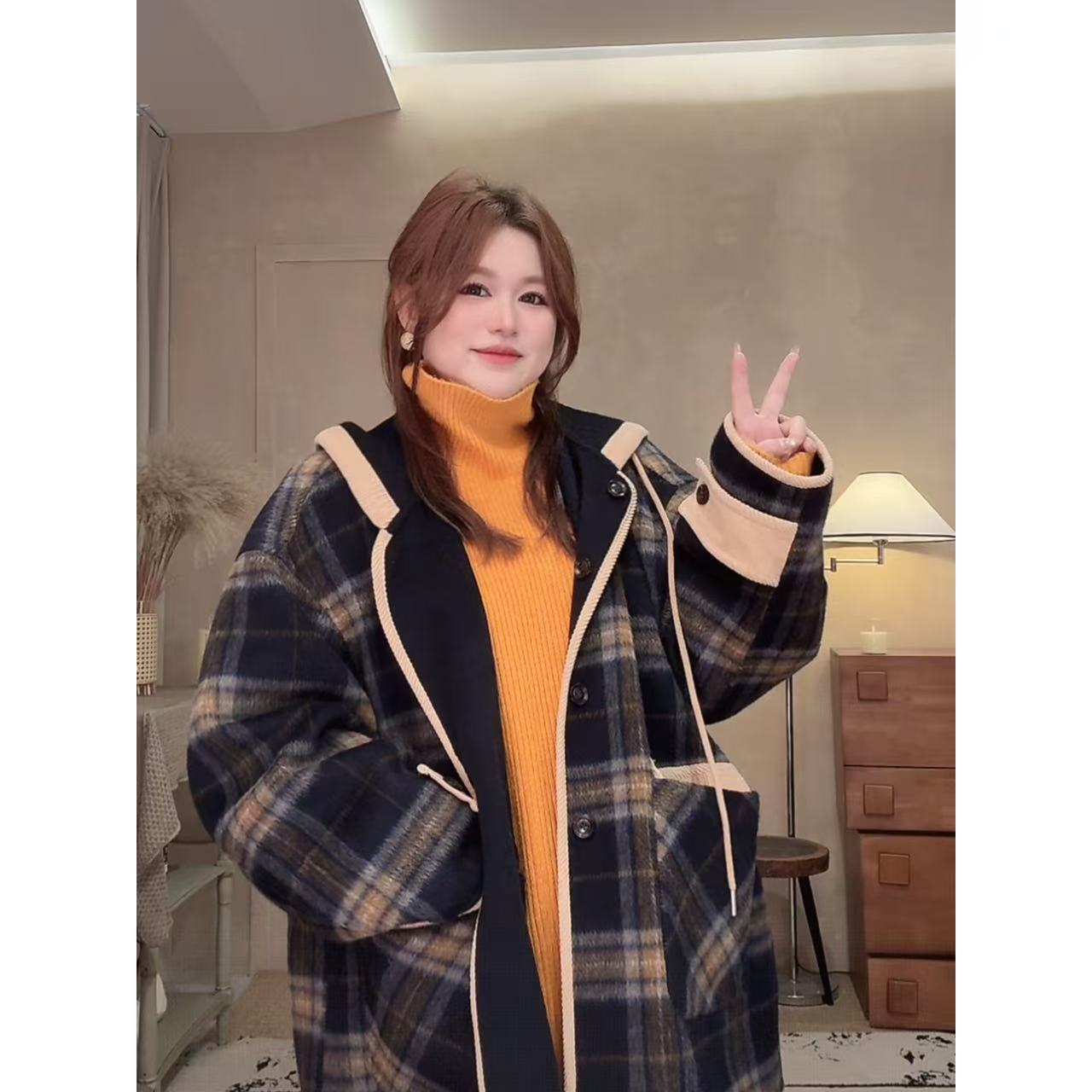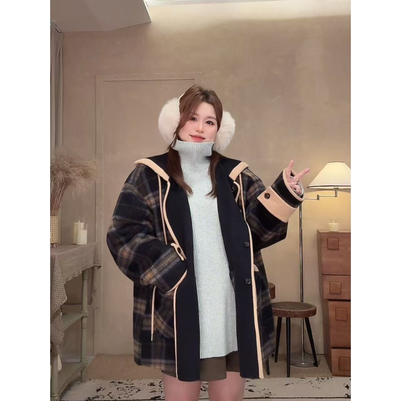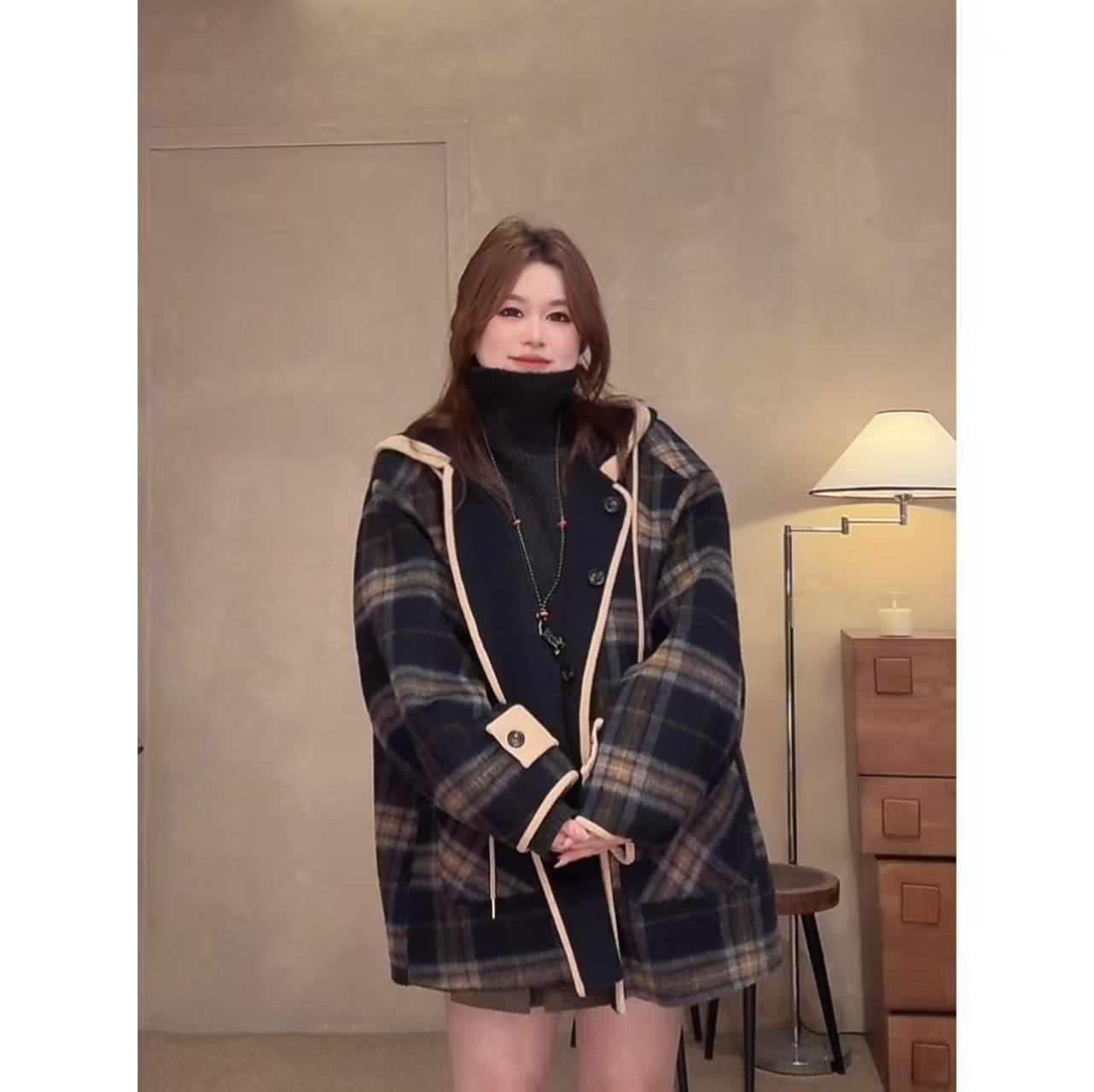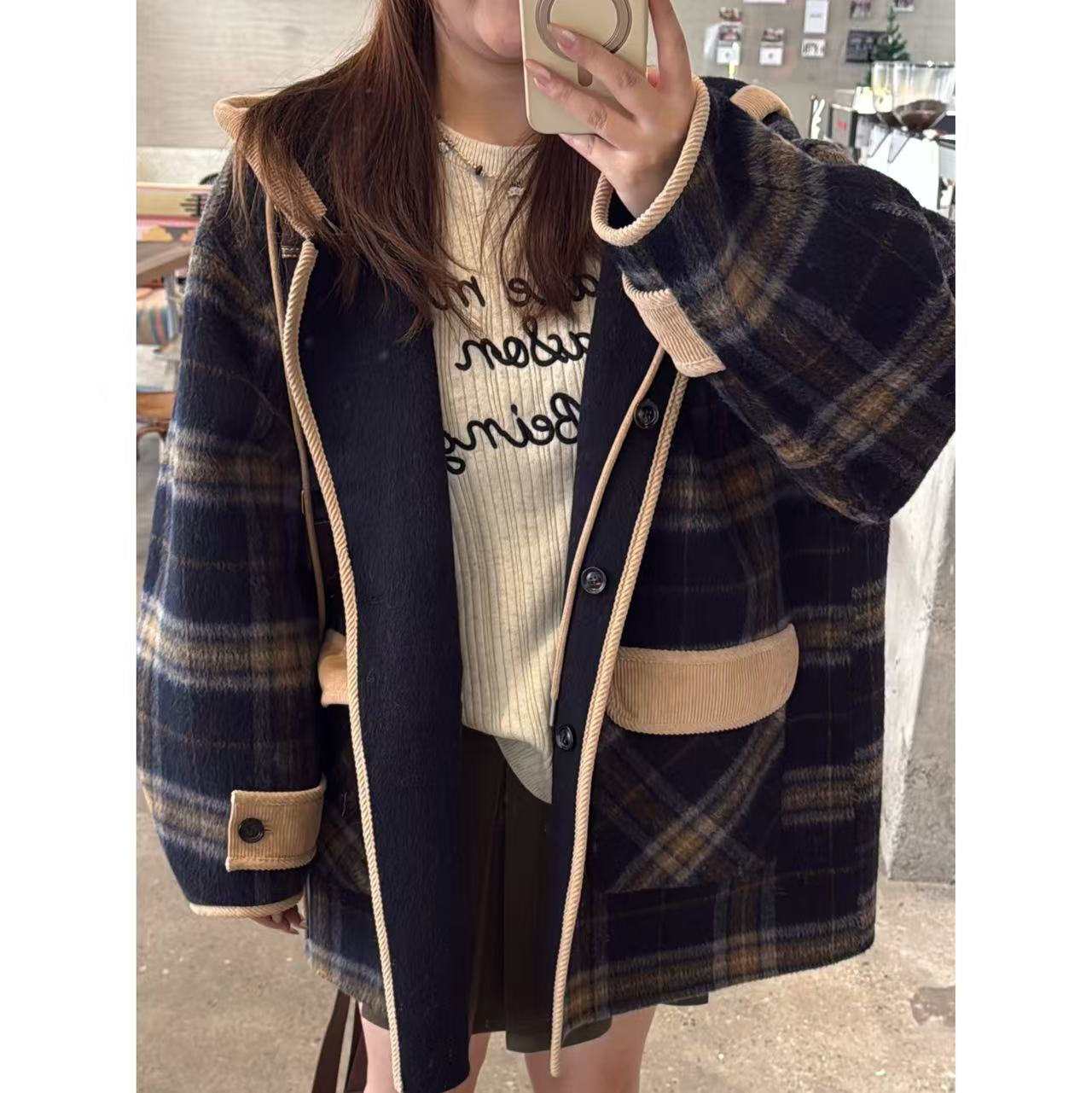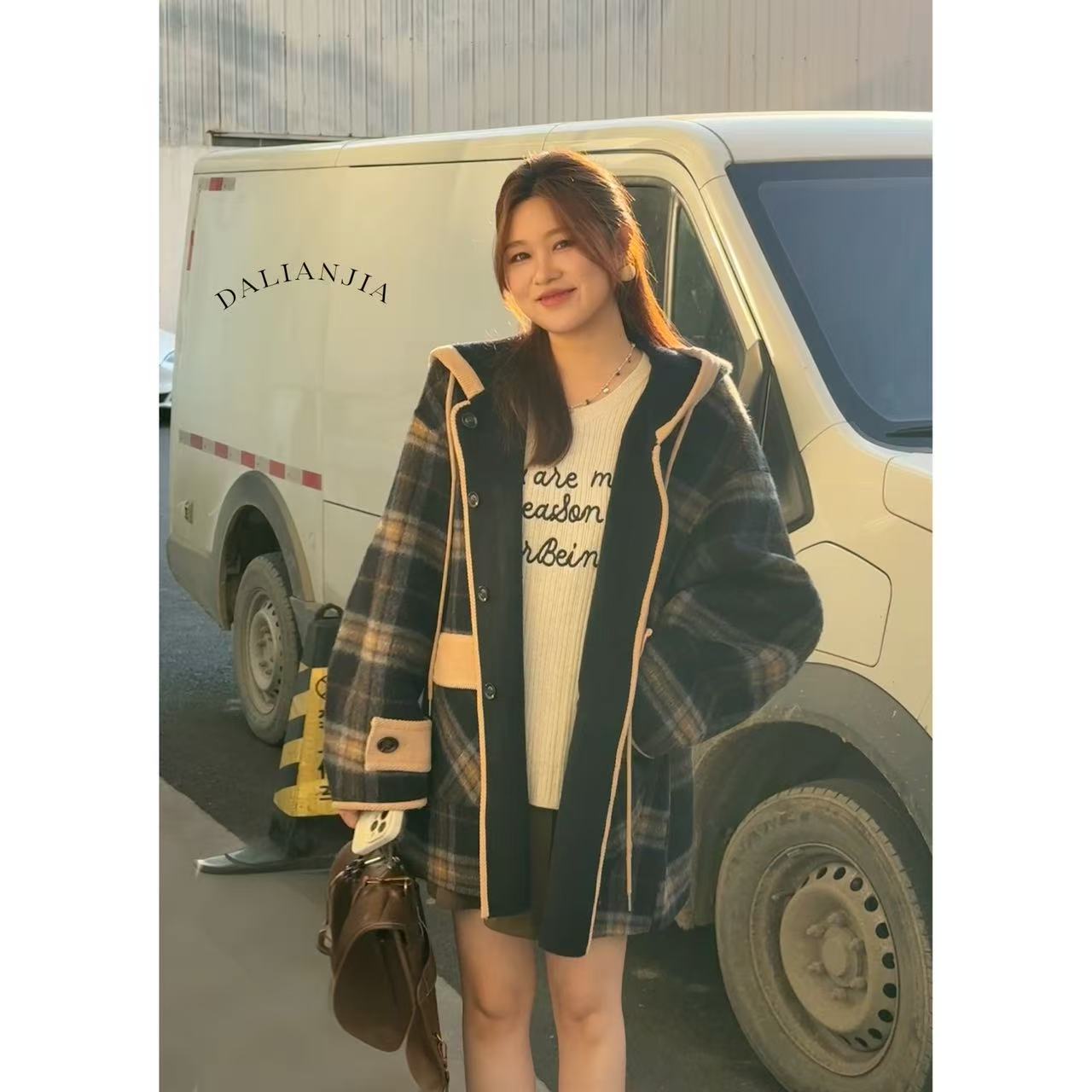 25AW上新 佳佳同款【芬兰周末】连帽双面可穿格纹呢子外套百搭宽松韩版