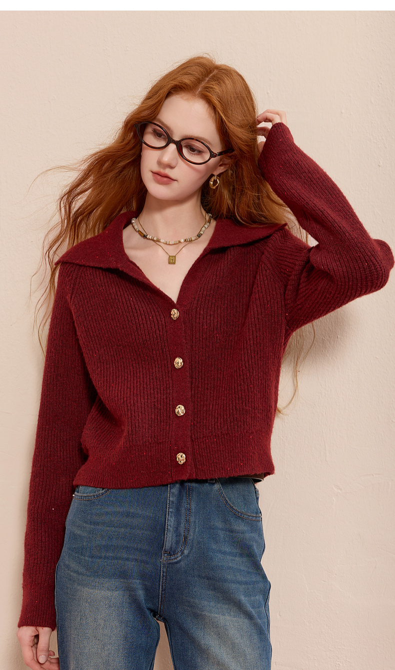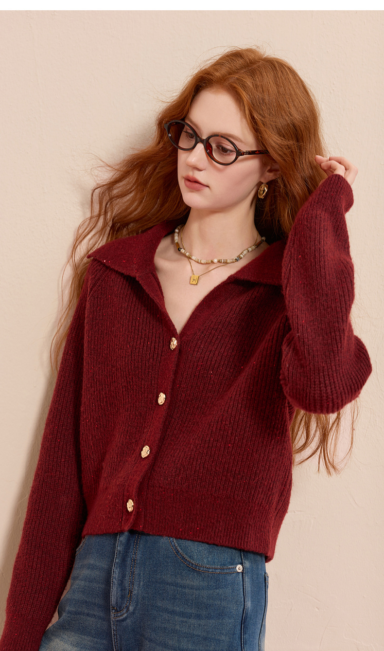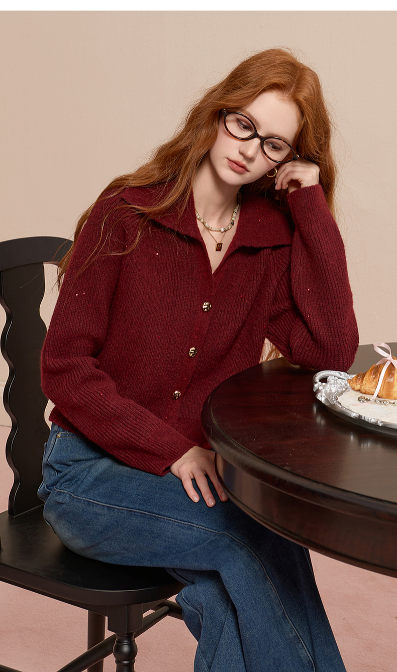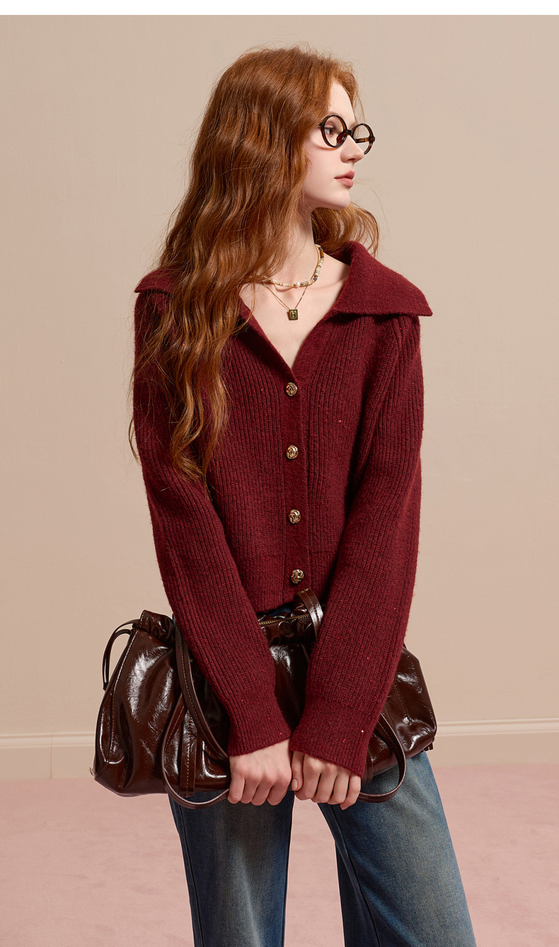 三彩2025冬季新款翻领针织衫亮片毛衫宽松短款开衫休闲M