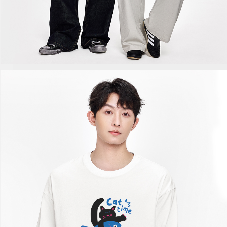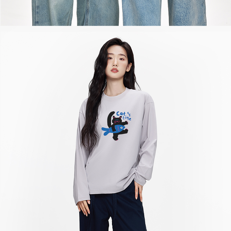 「棉的美学」萌趣白猫卡通印花打底长袖T恤宽松慵懒风ing纯棉上衣