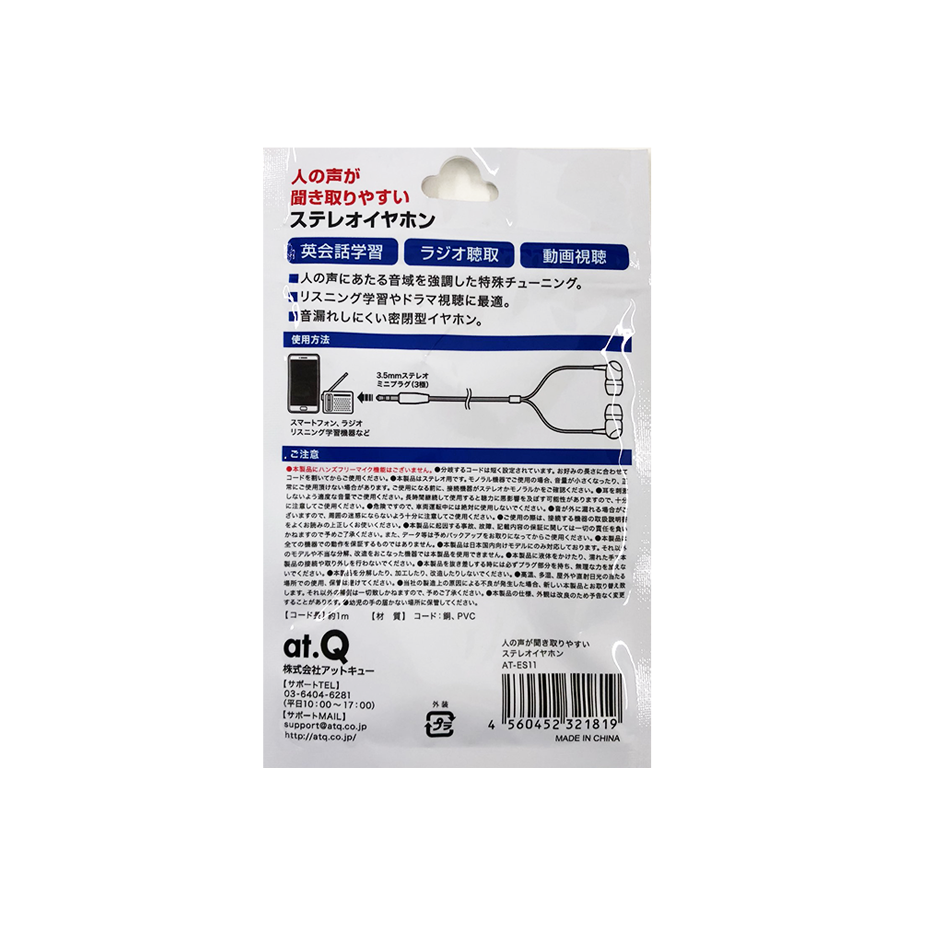 日本 at.Q 入耳式清晰人声立体声 有线耳机 3.5mm插口 AT-ES11(1米)