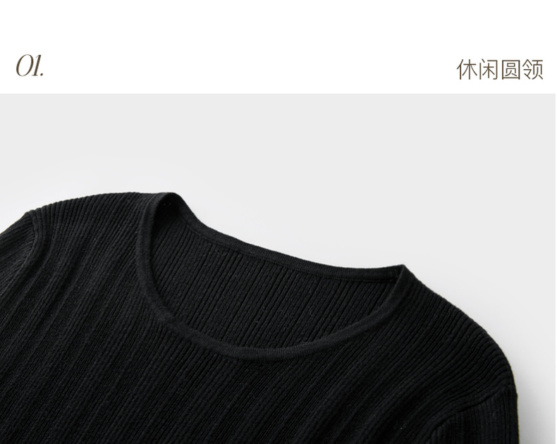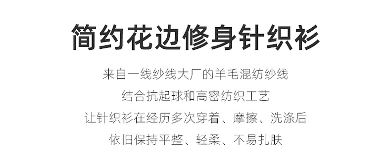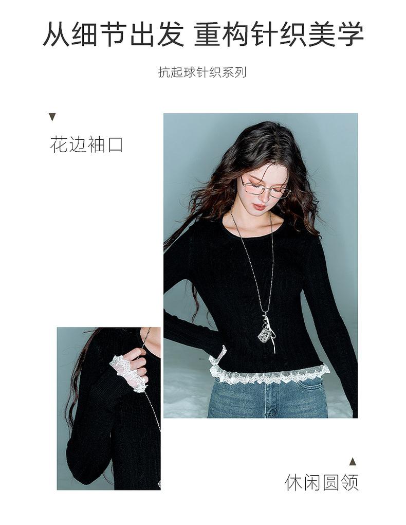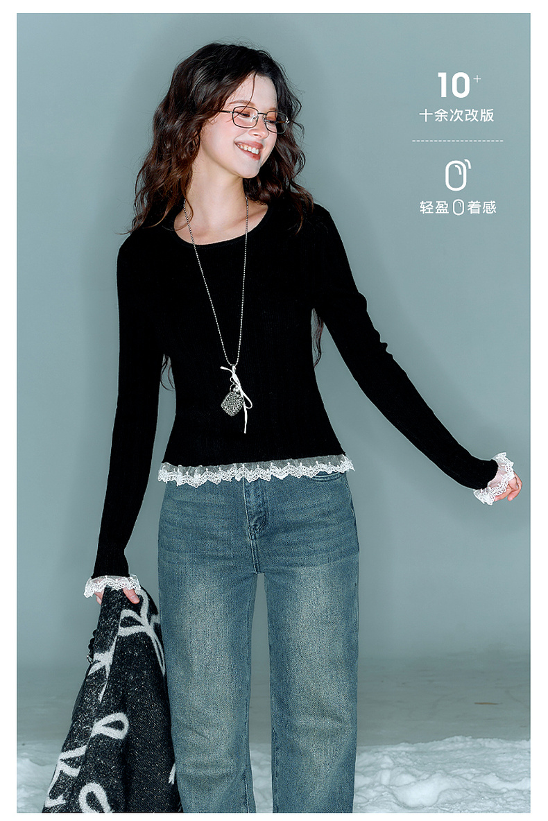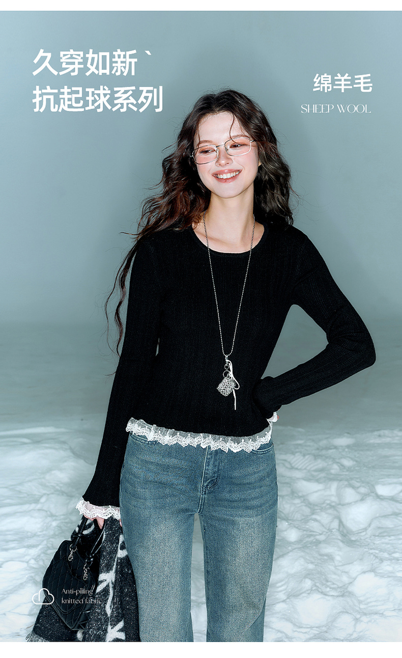 三彩2025冬季新款修身圆领针织衫花边打底衫长袖套头衫M