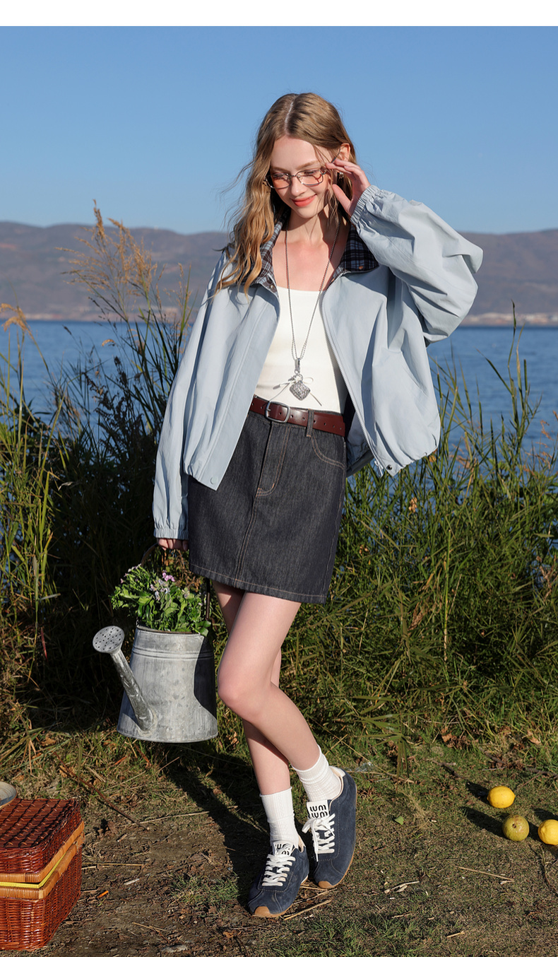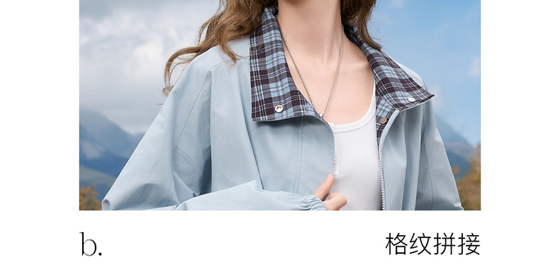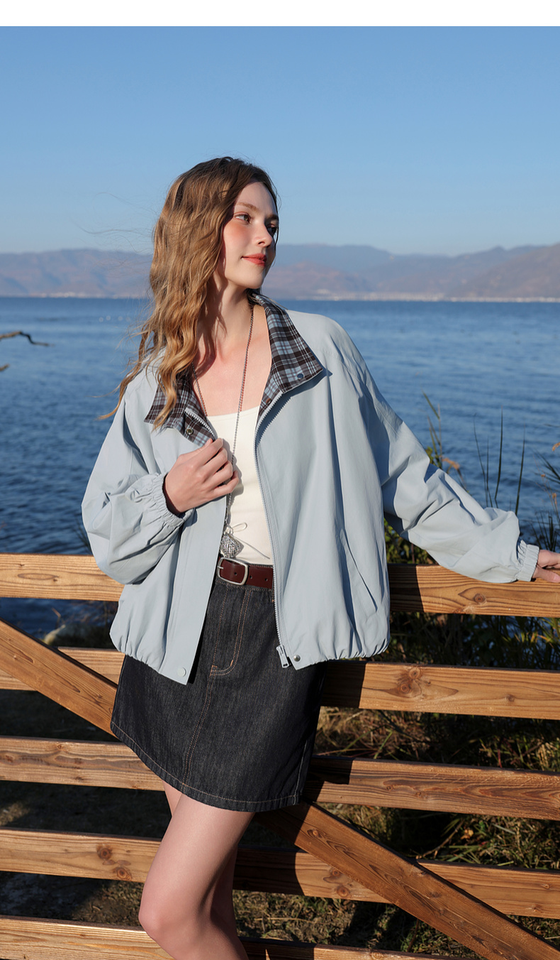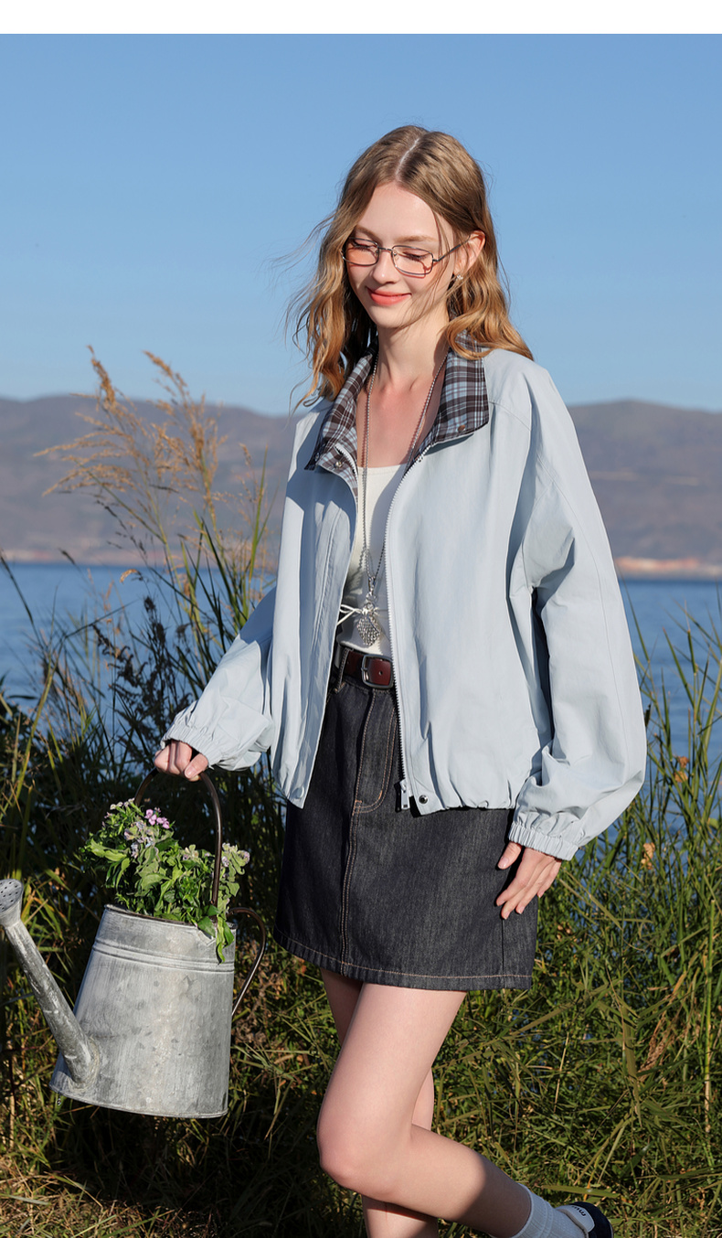 三彩2026春季新款格纹拼接立领长袖外套夹克拉链开衫宽松休闲M