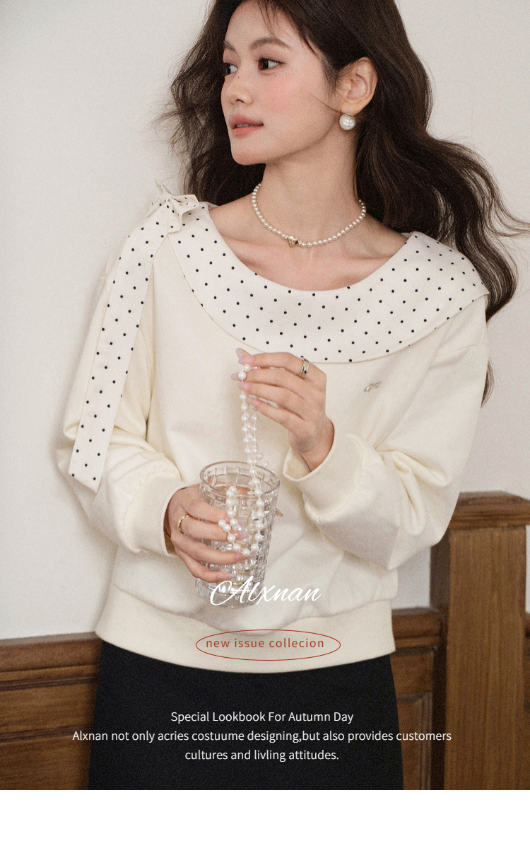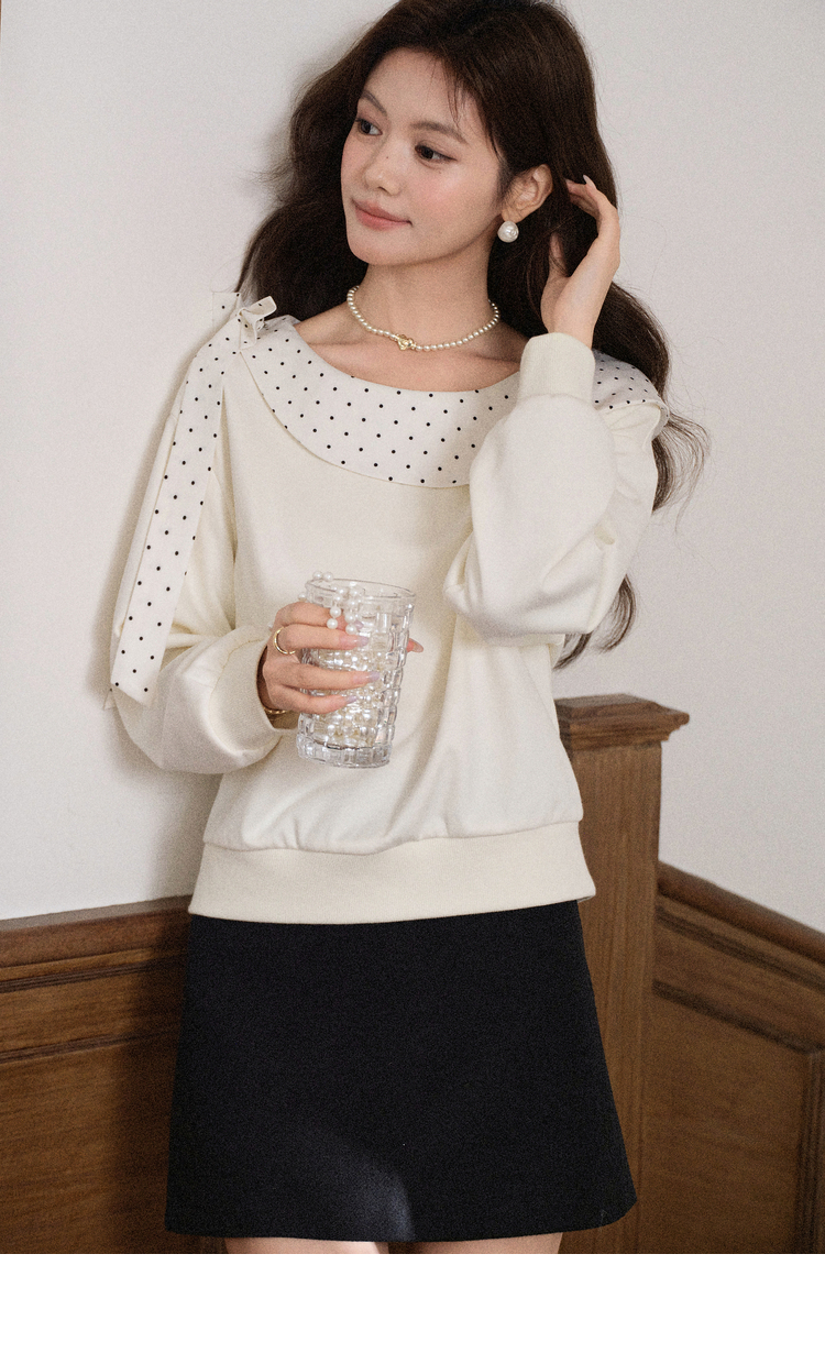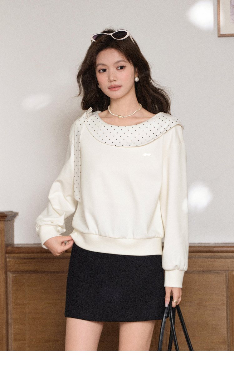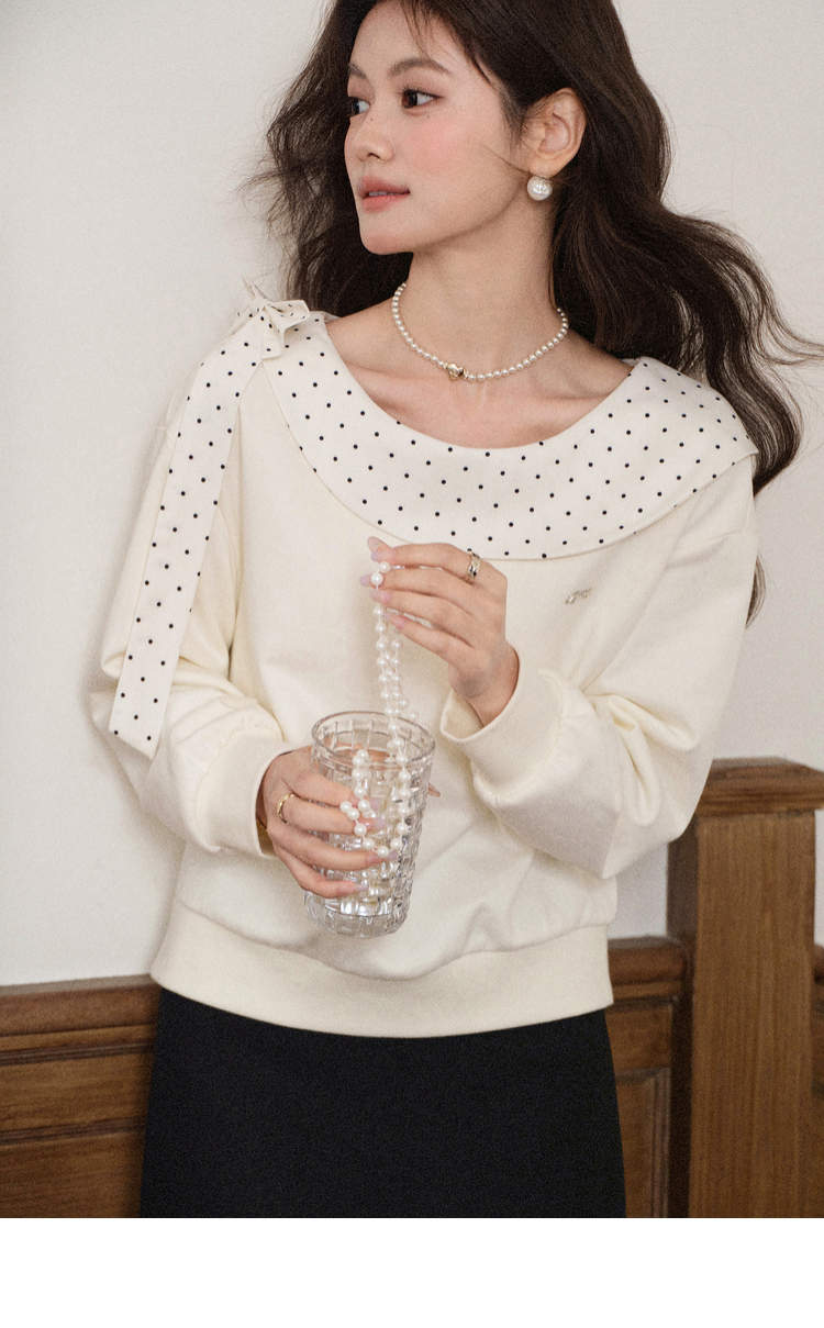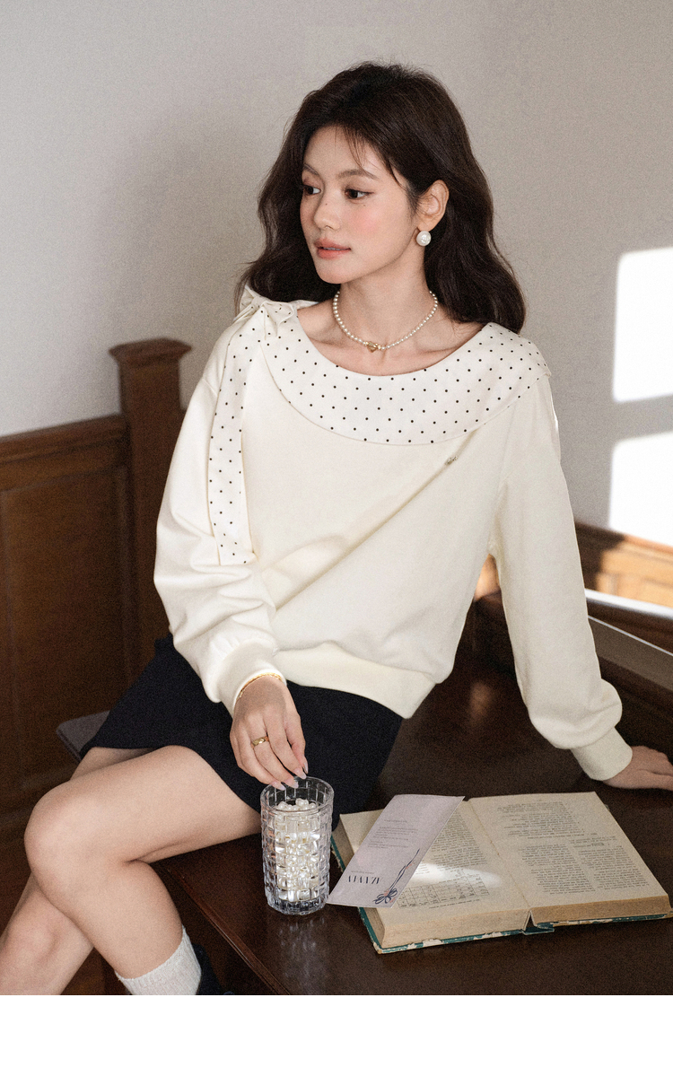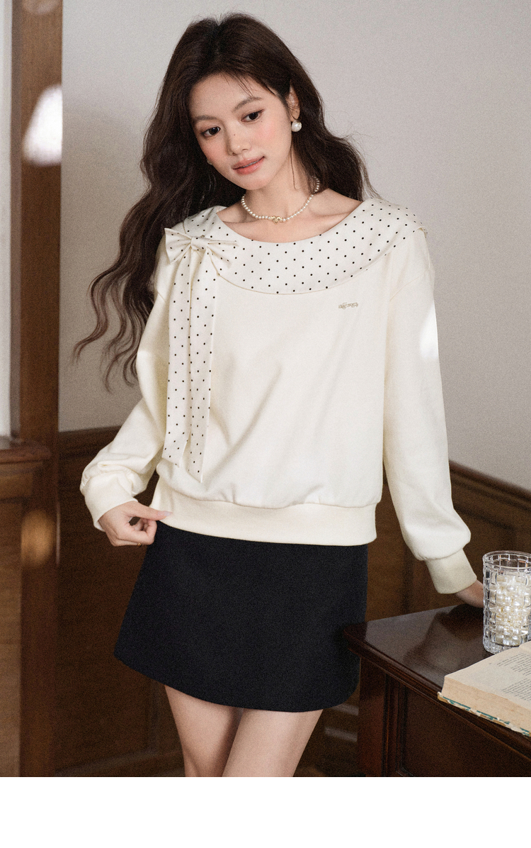 鹿向南「云朵山茶」设计感奶白色波点蝴蝶结卫衣显瘦长袖上衣女秋L58705