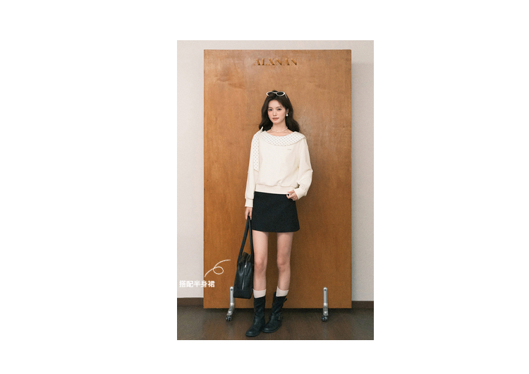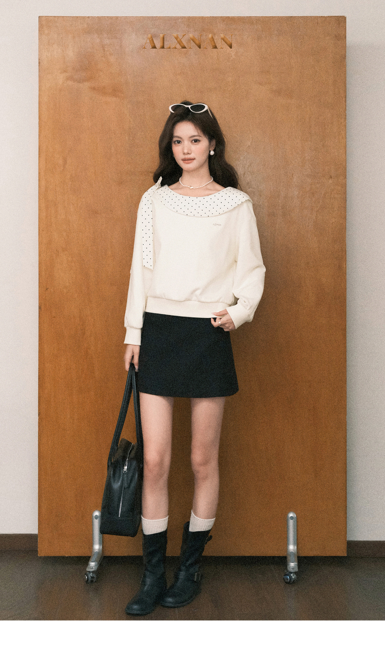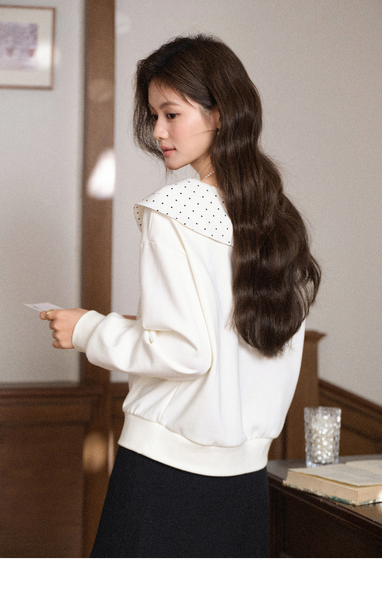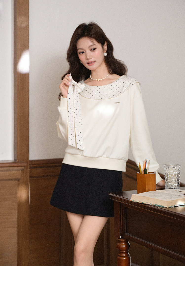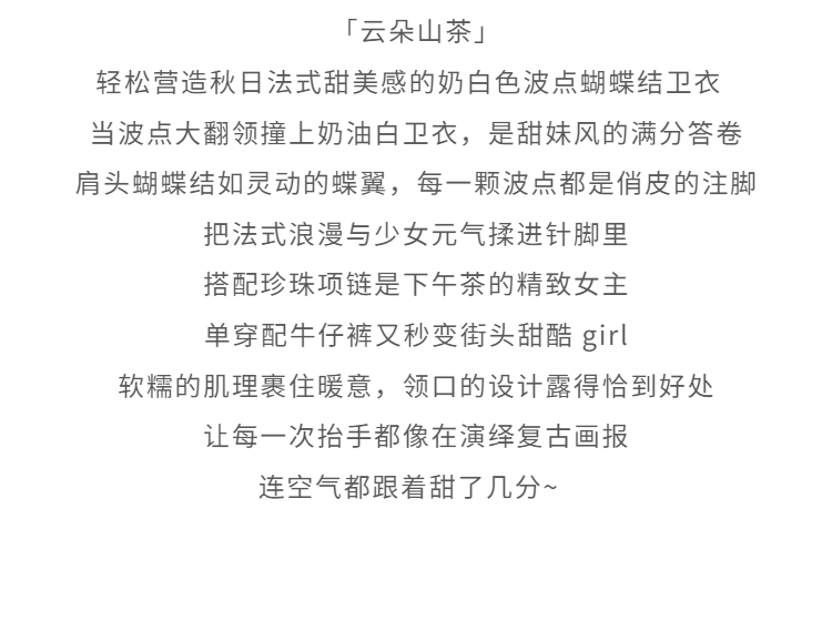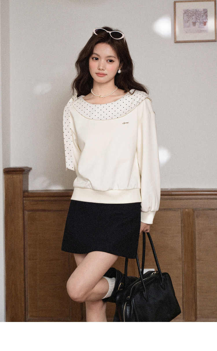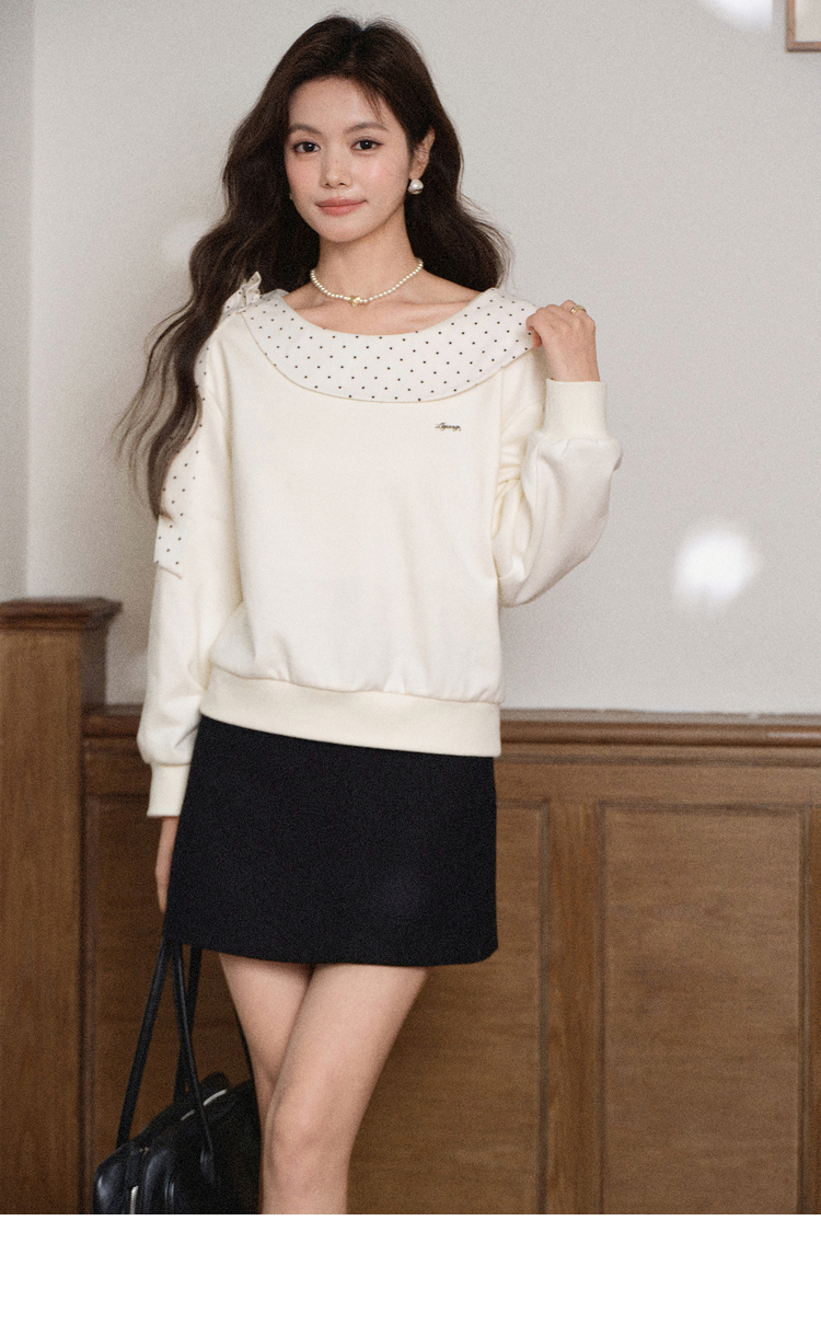 鹿向南「云朵山茶」设计感奶白色波点蝴蝶结卫衣显瘦长袖上衣女秋L58705