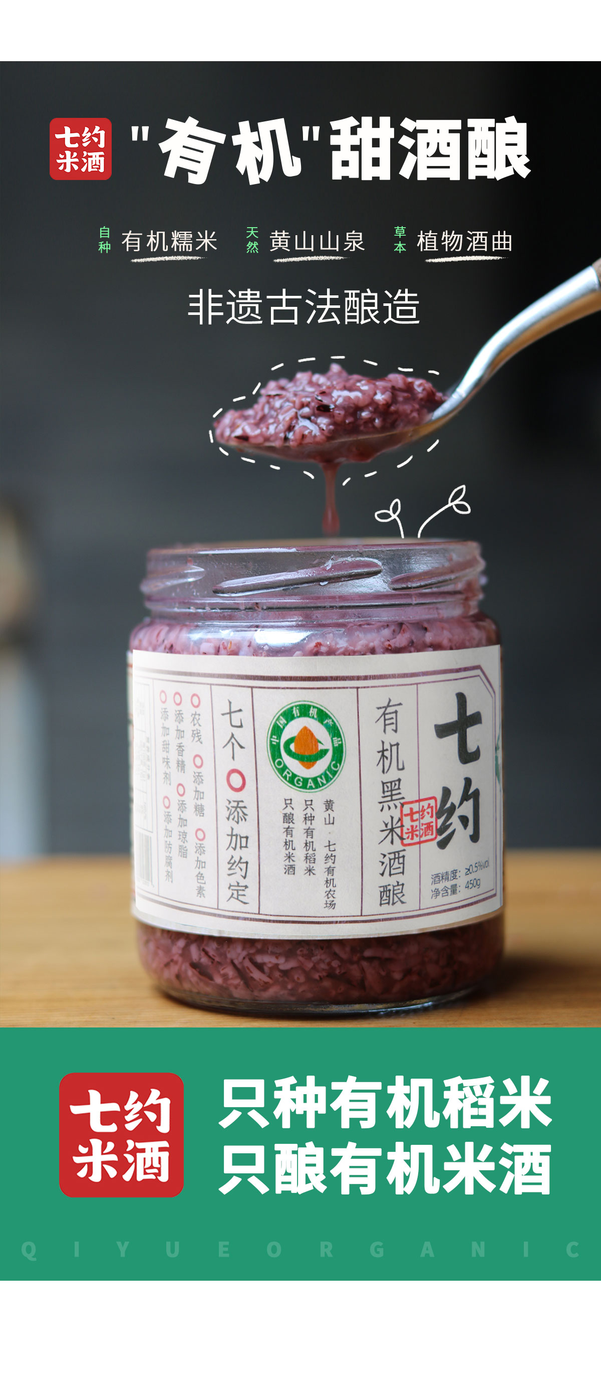 【七约米酒】有机米酒醪糟有机酒酿(450g*2罐)血糯米醪糟 月子米酒零添加自然发酵酒酿食用酒糟