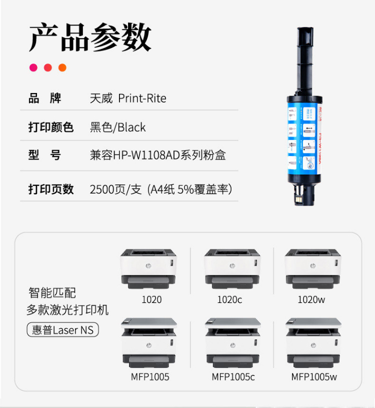 天威 W1108A智能闪充粉盒 108A适用惠普HP Laser NS MFP 1005 1005w 1005c NS1020 1020w 1020c W1109