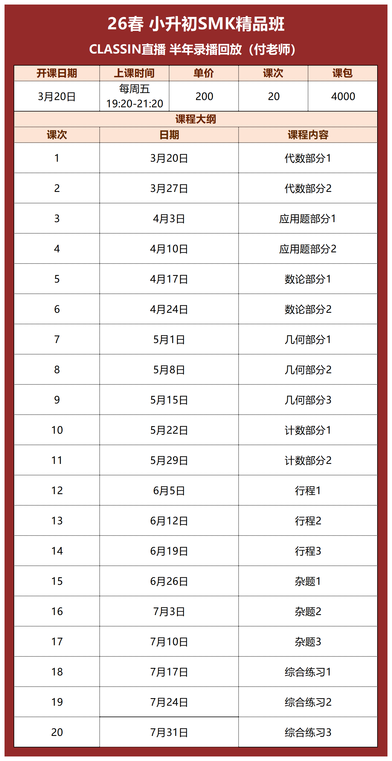 一共20讲,200元/120分钟/讲,课包4000