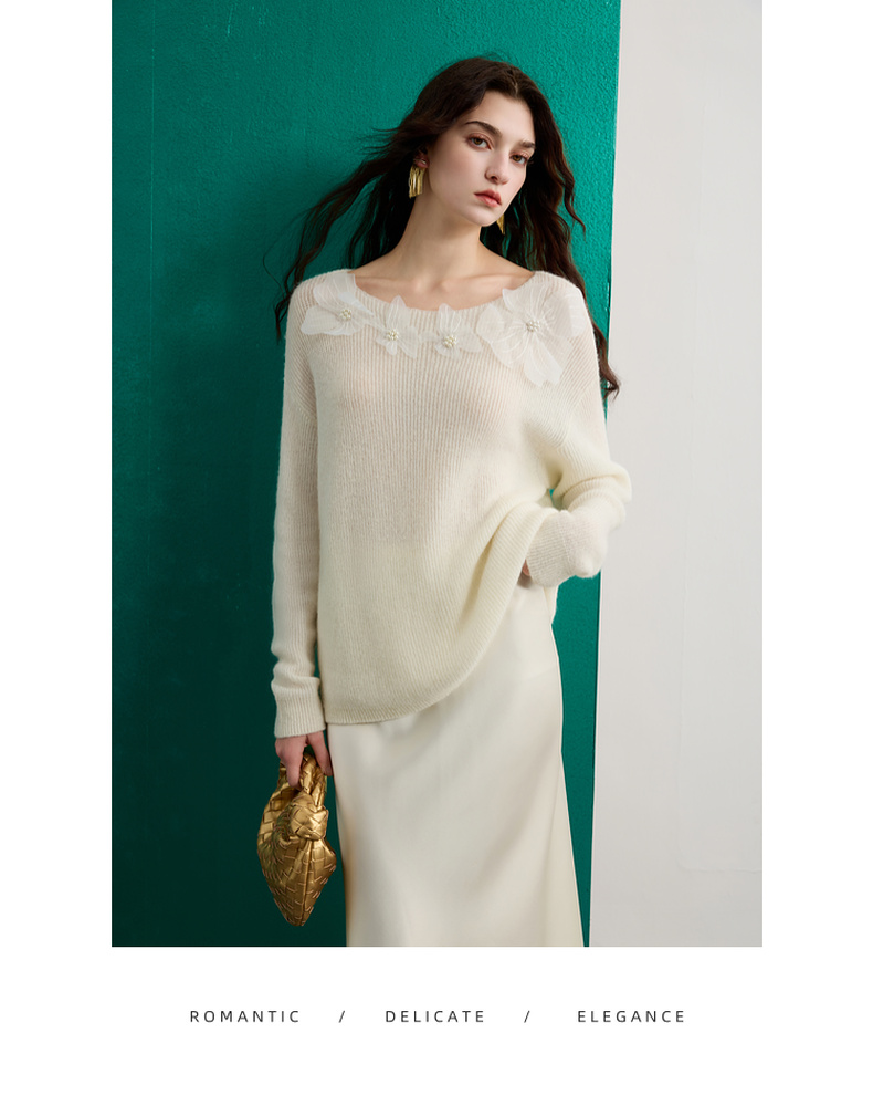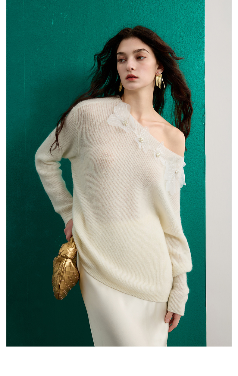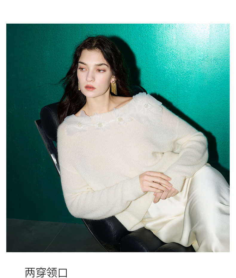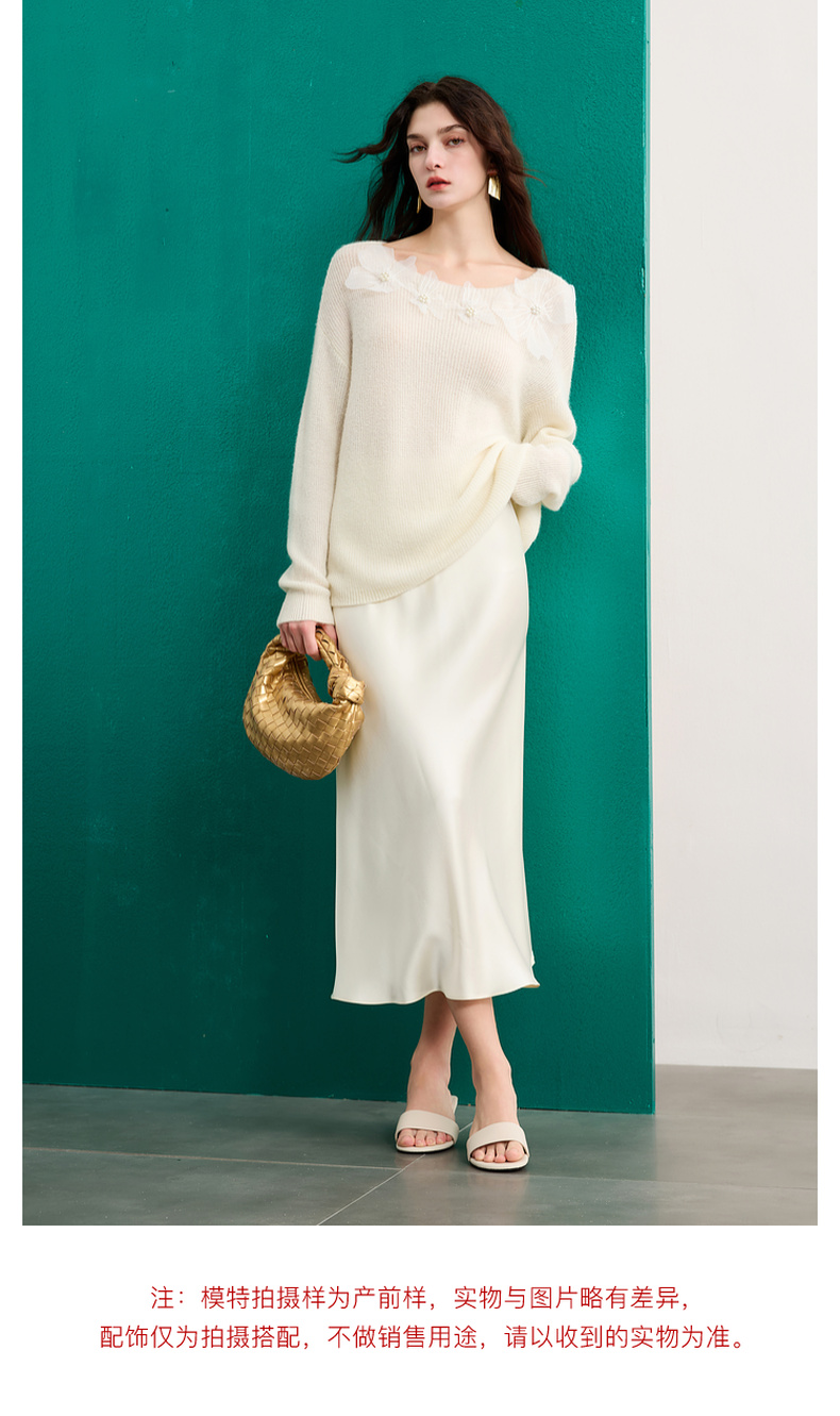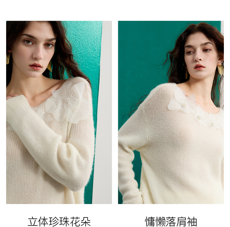 三彩2025春季新款立体花朵绵羊毛针织衫两穿一字领毛衫宽松优雅M