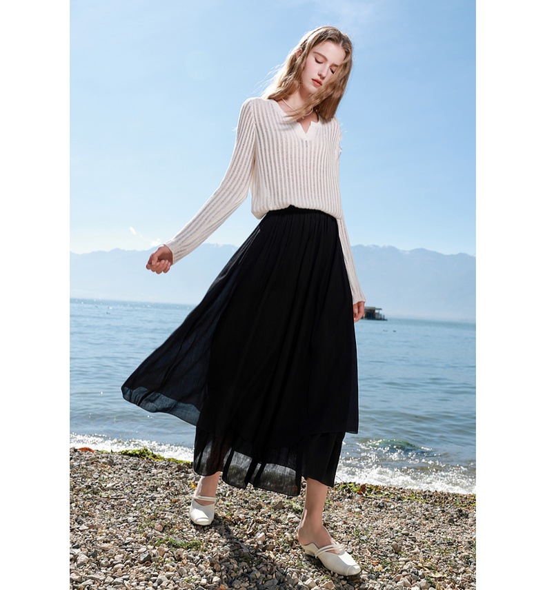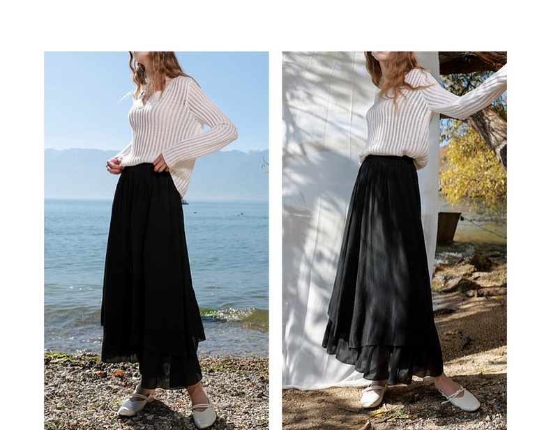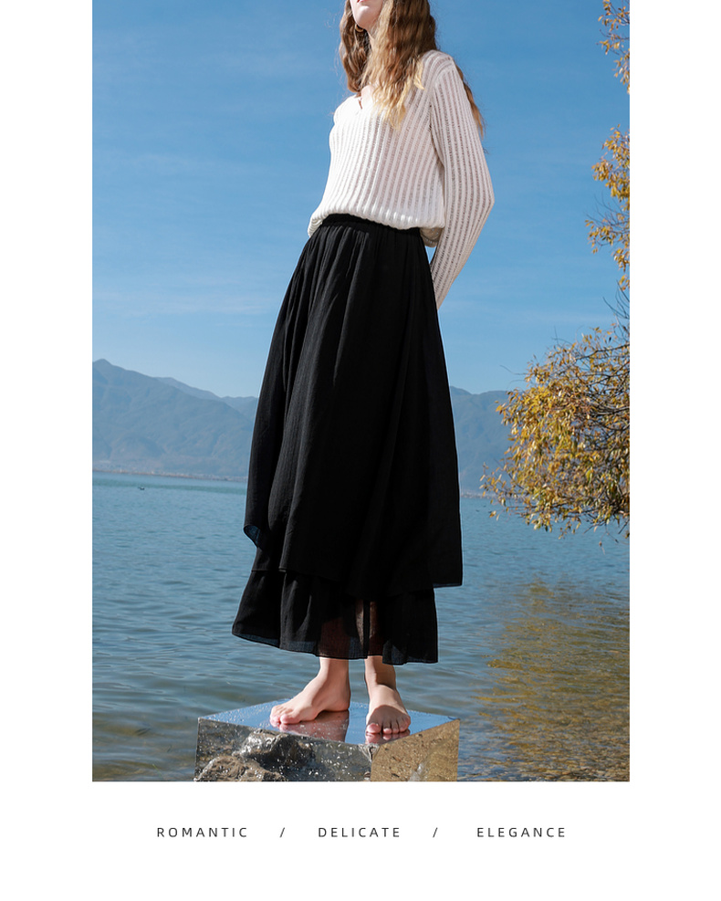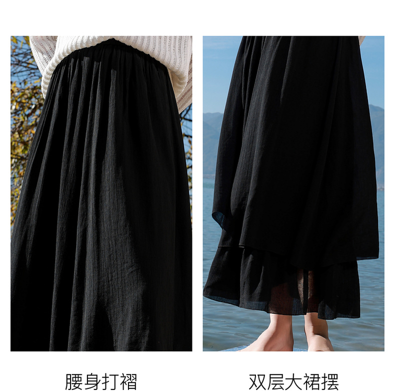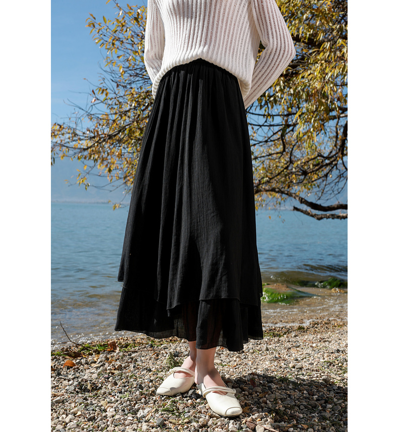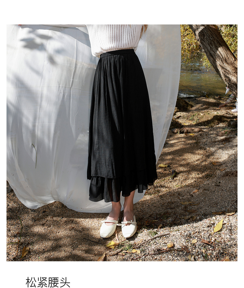三彩2025春季新款肌理感半身裙松紧腰A字裙双层飘逸长裙M