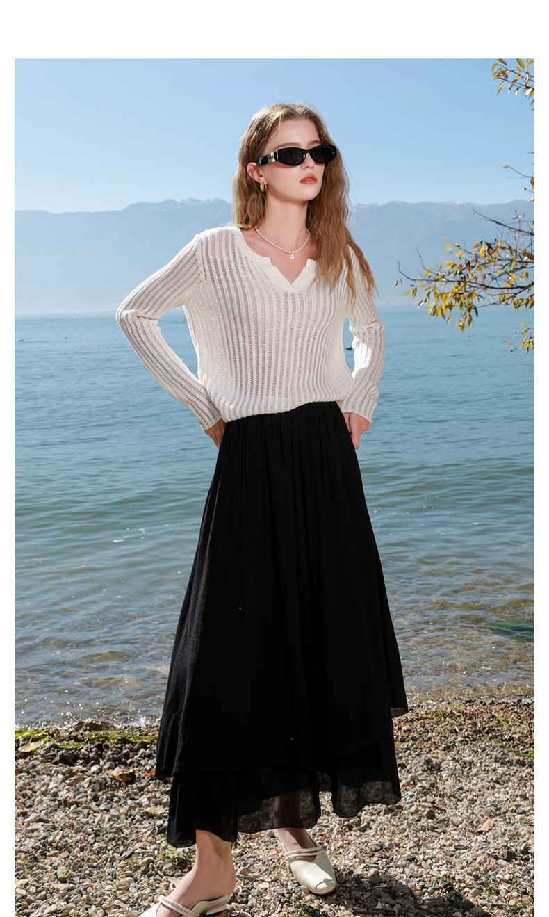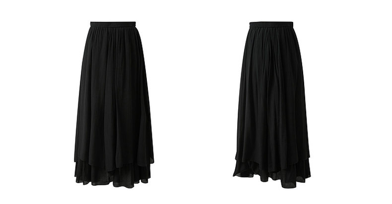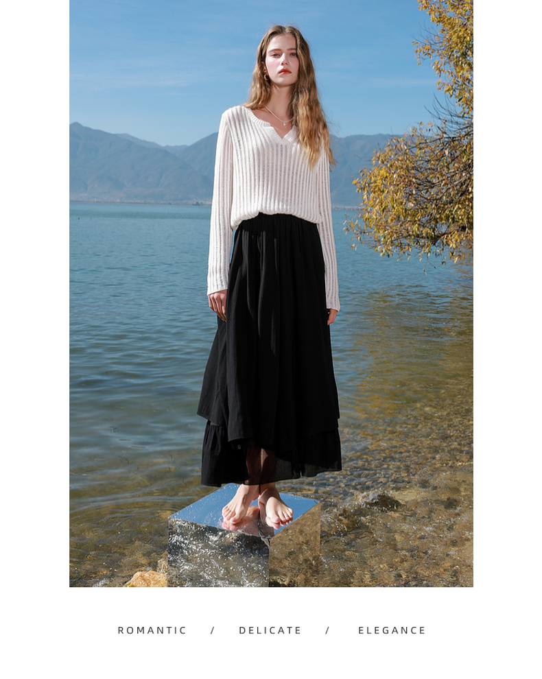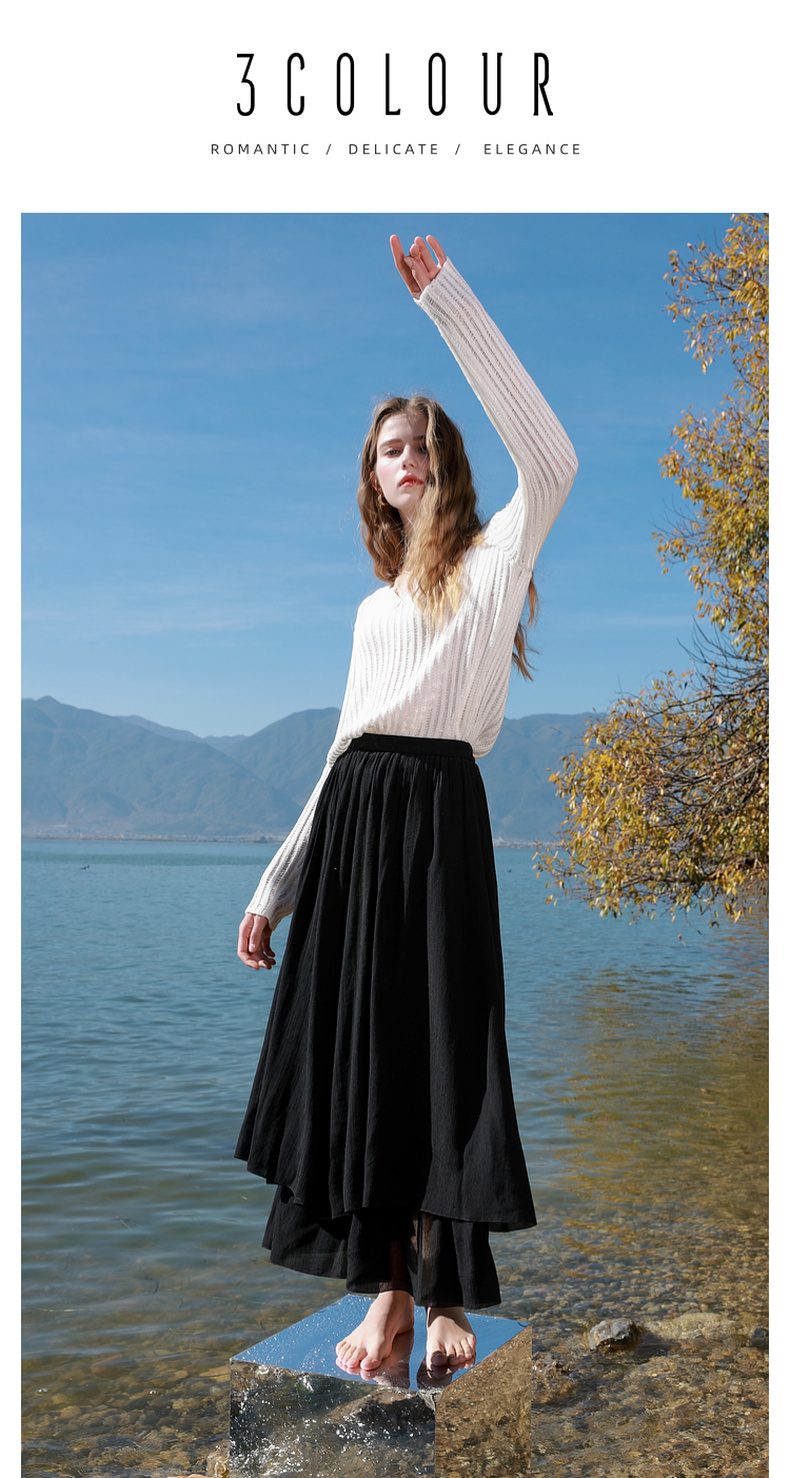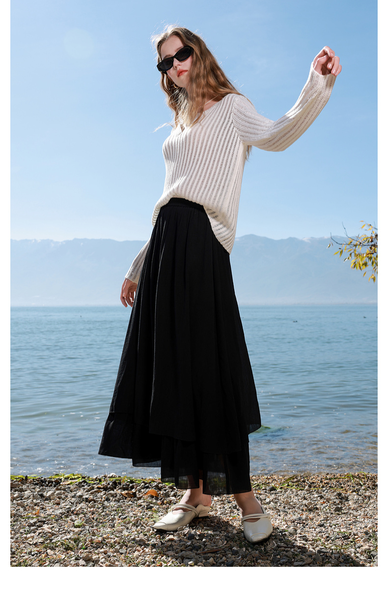 三彩2025春季新款肌理感半身裙松紧腰A字裙双层飘逸长裙M