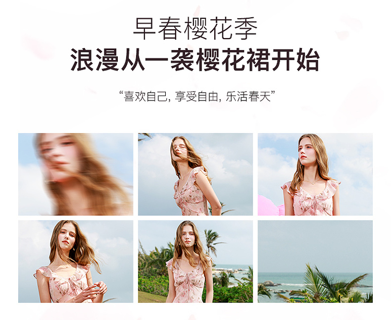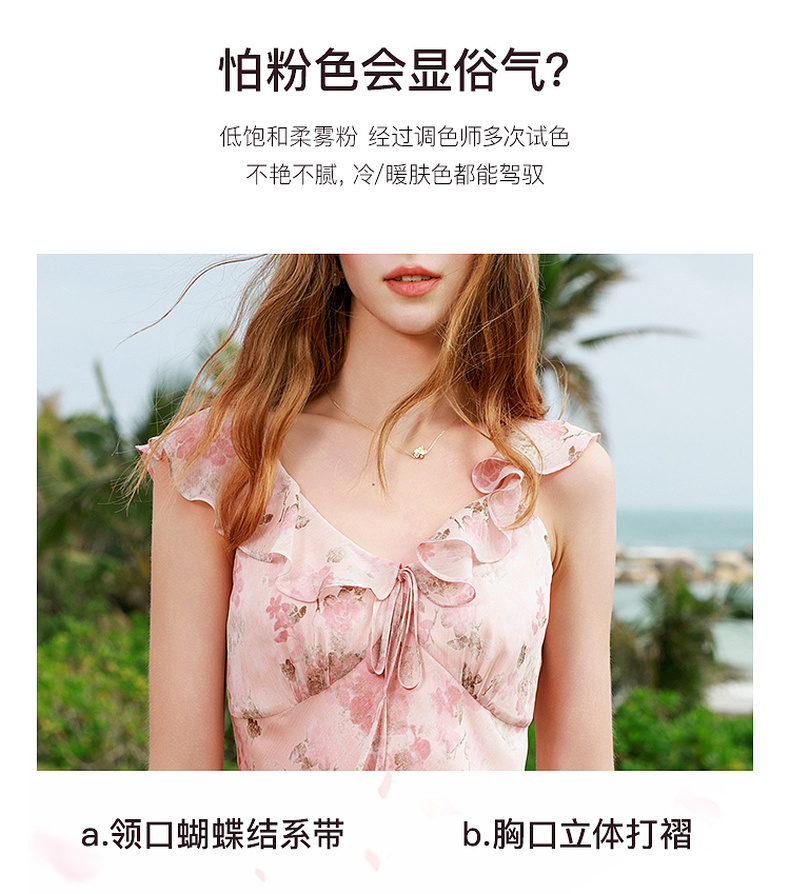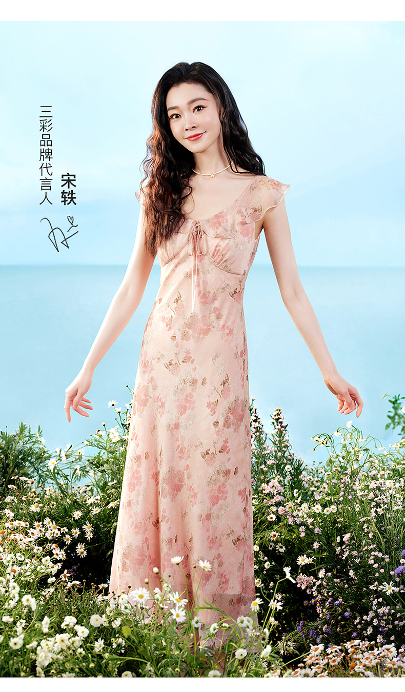 【宋轶同款】三彩2025春季新款荷叶边连衣裙碎花裙斜裁长裙V领浪漫M