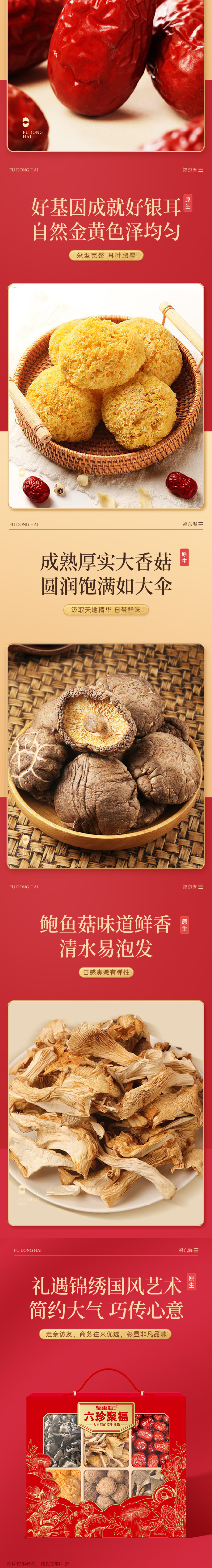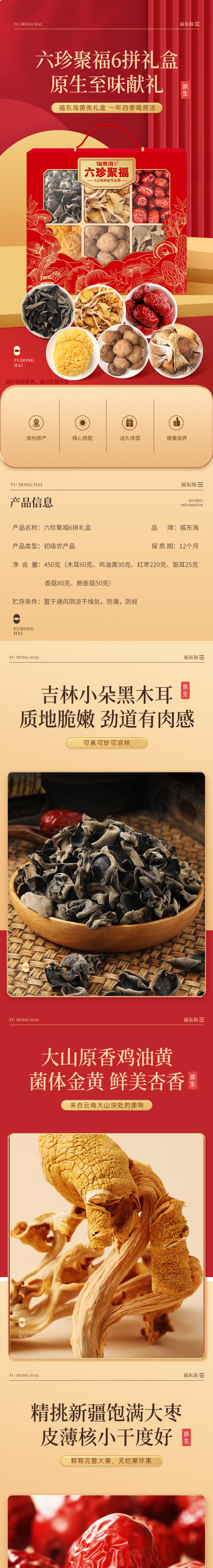 福东海 六珍聚福礼盒450克 木耳鸡油黄红枣银耳鹿茸菇鲍鱼菇