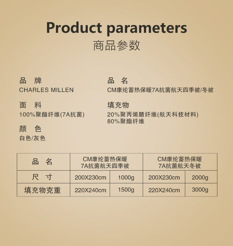 【产品名称】CM康伦蓄热保暖7A抗菌航天四季被/冬厚被