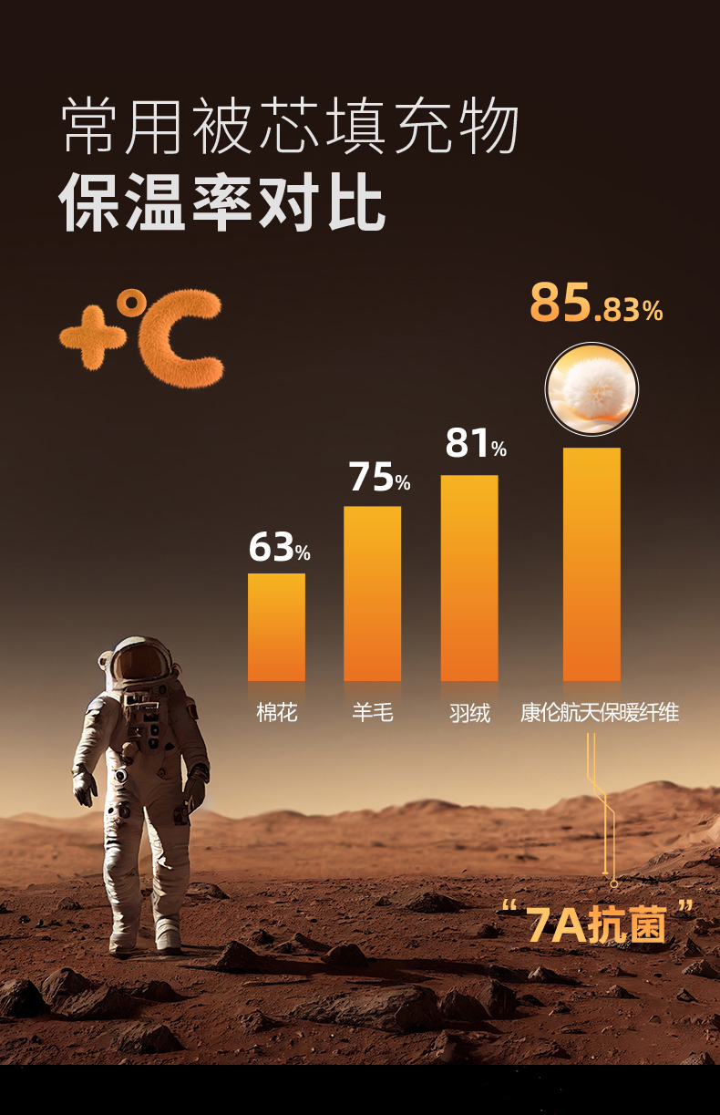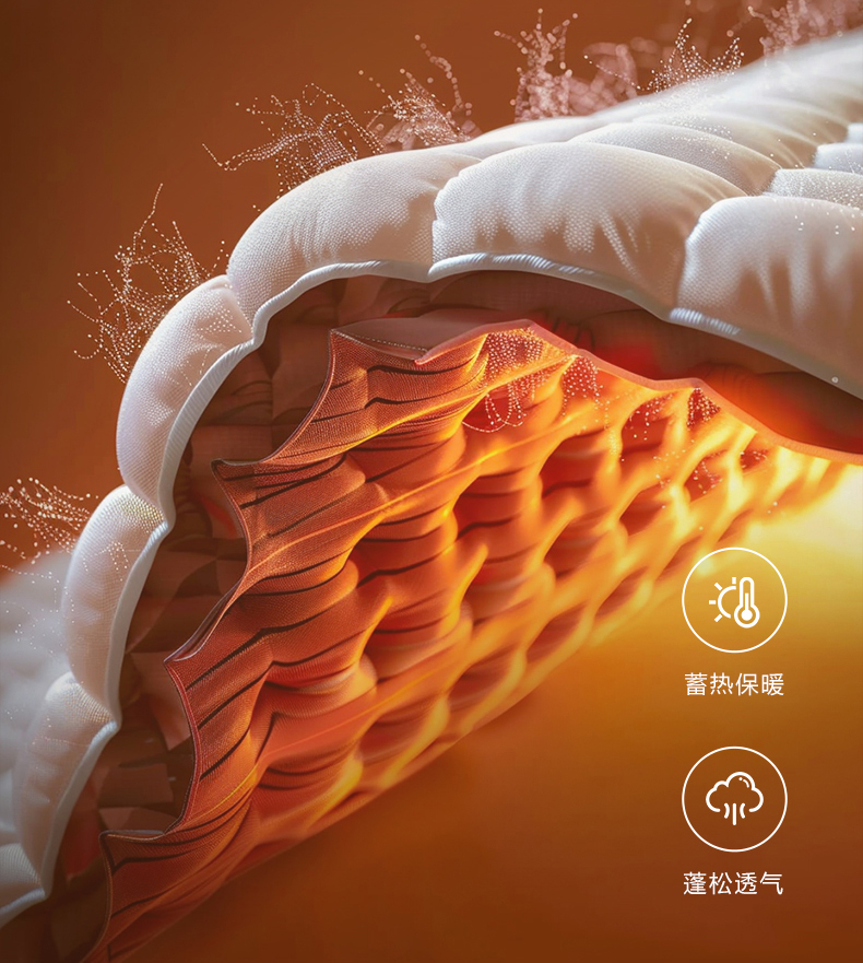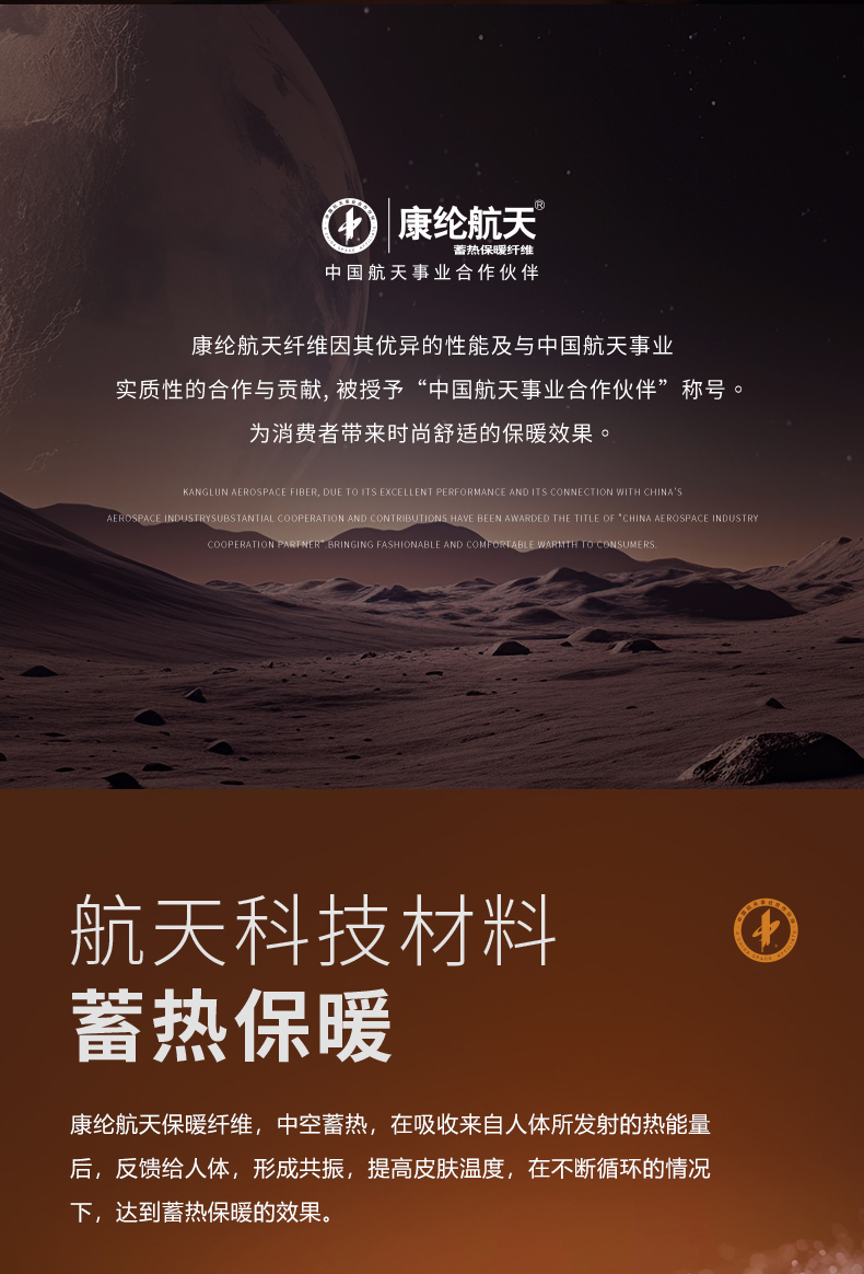 康纶航天保暖纤维,是应用在军工、航天领域的科技纤维,纤维中空蓄热,能够吸收来自人体的热能量,再反馈给人体。