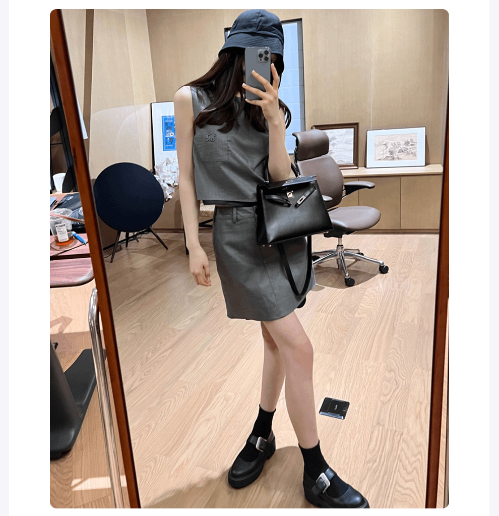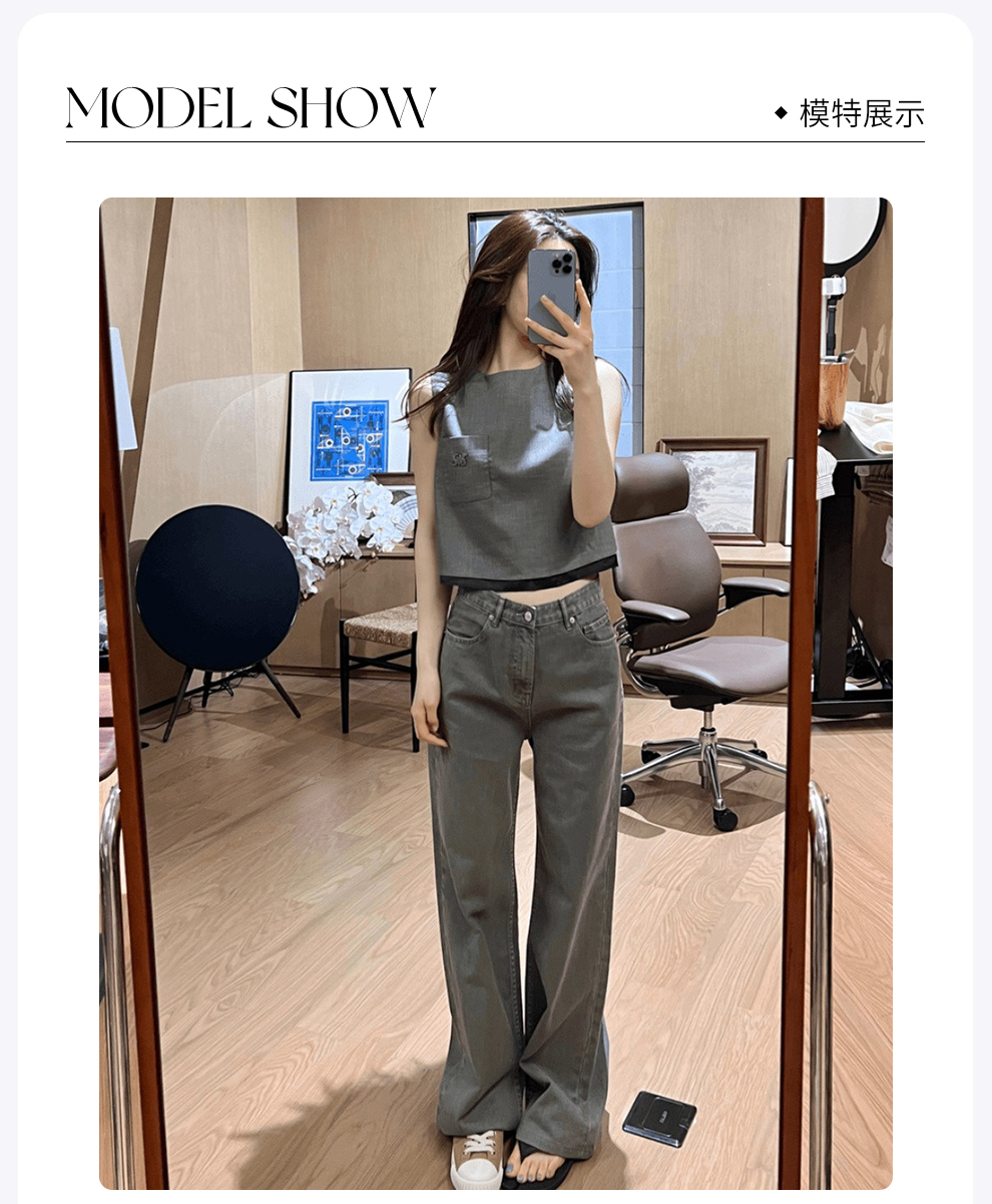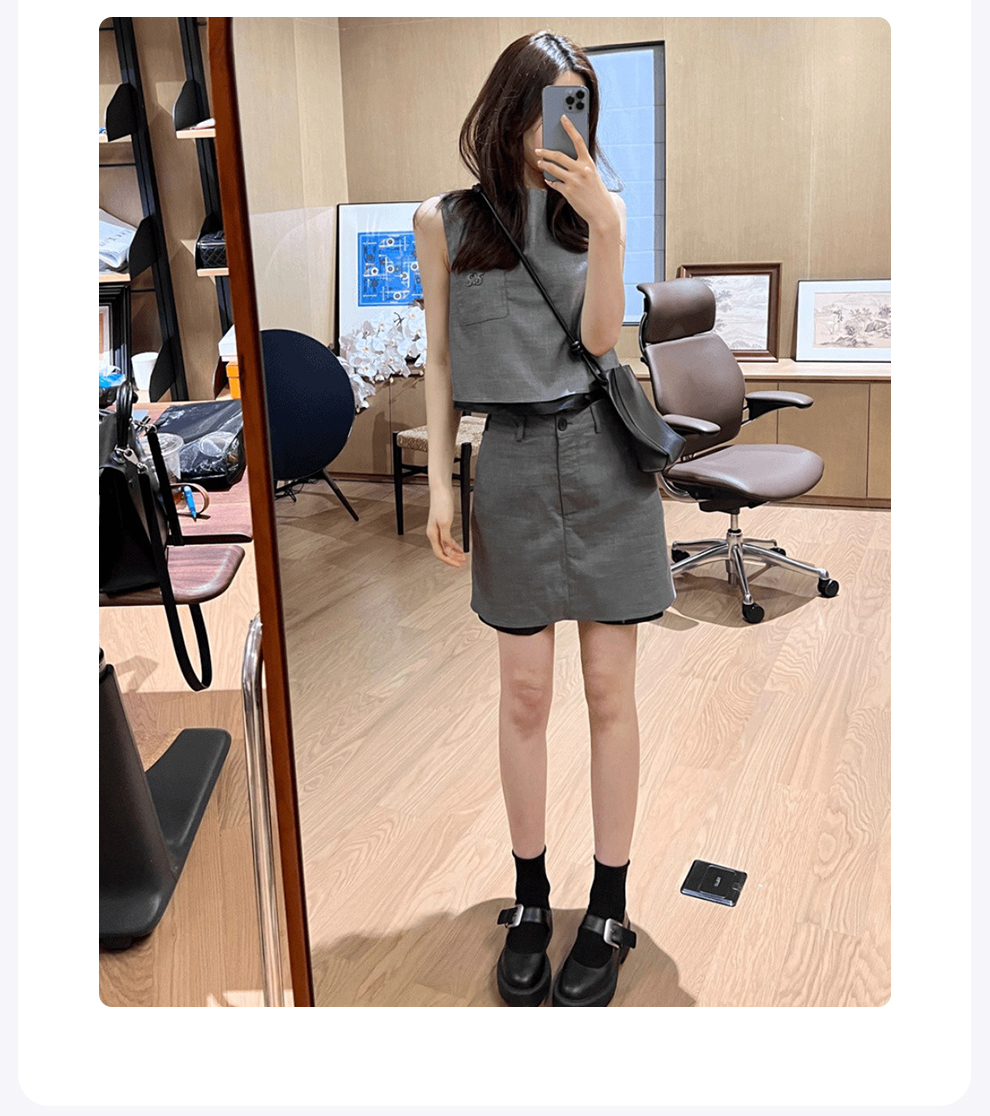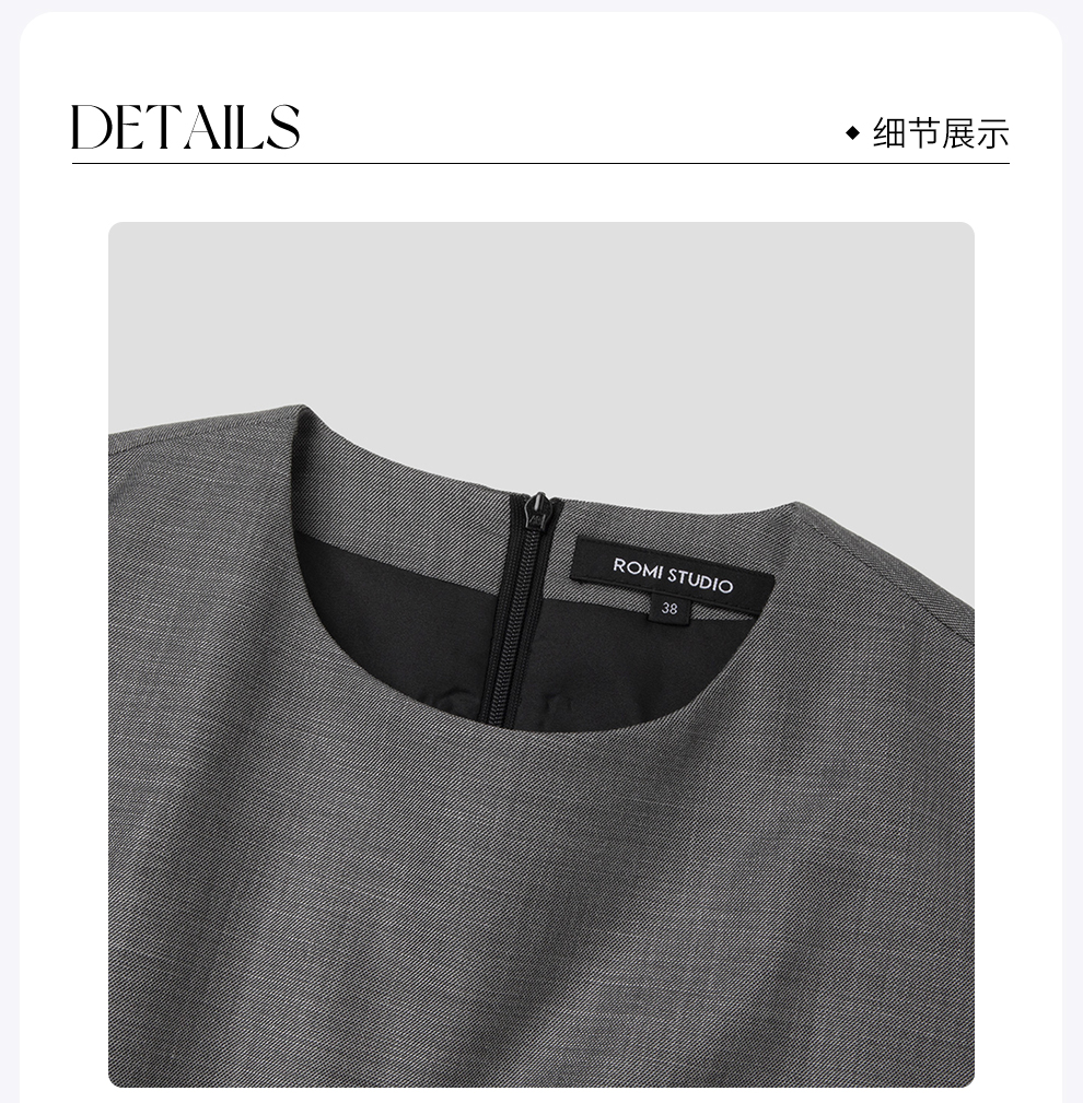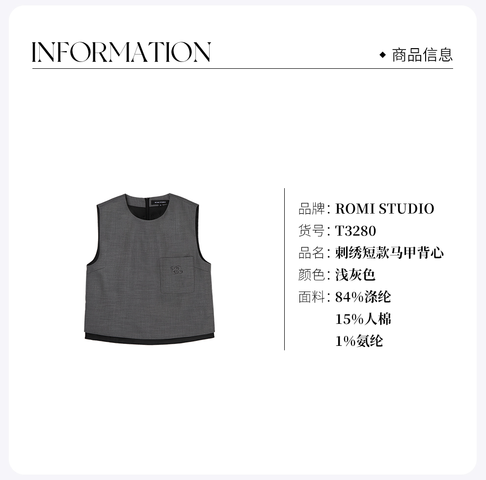ROMI STUDIO"基础优雅"灰色圆领无袖贴袋刺绣短款马甲背心 T3280