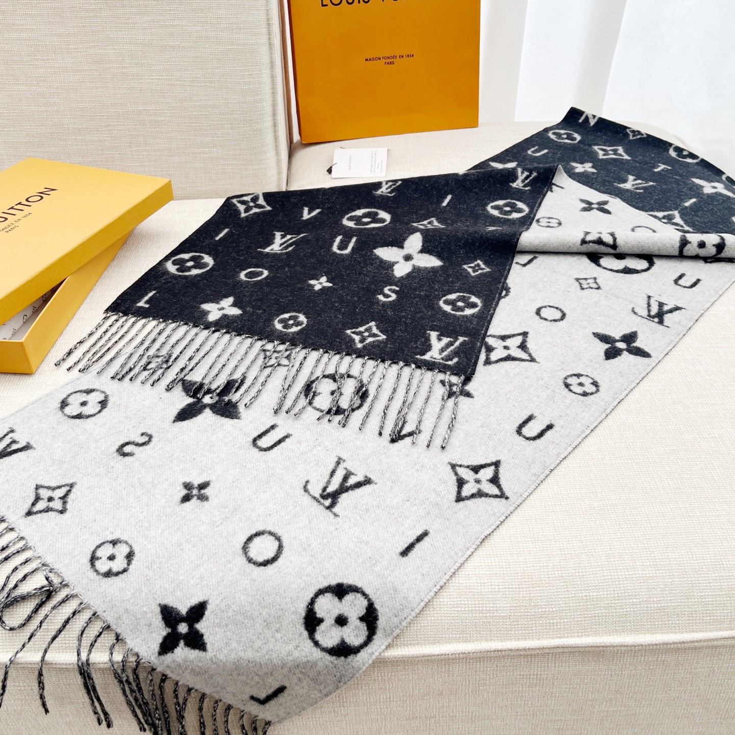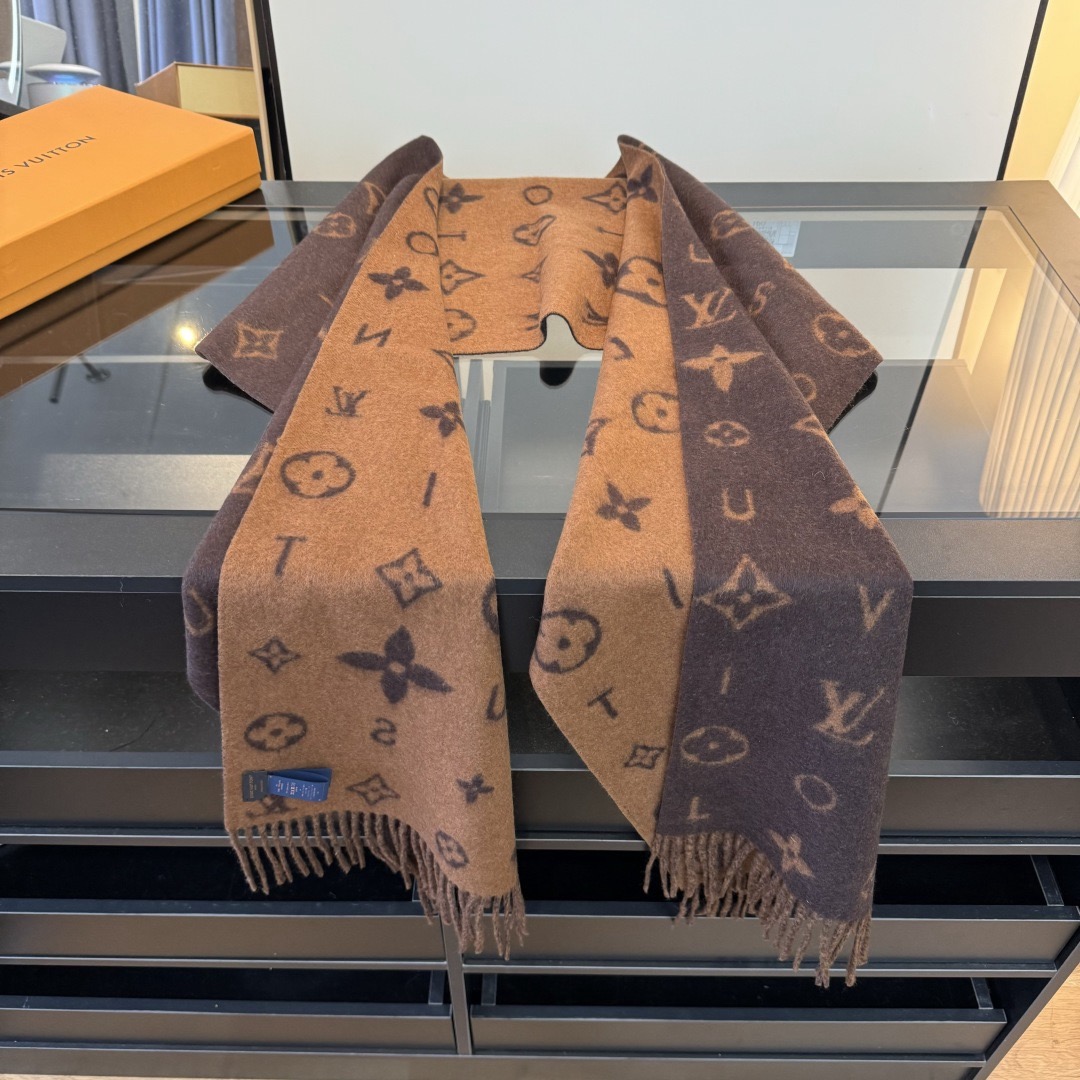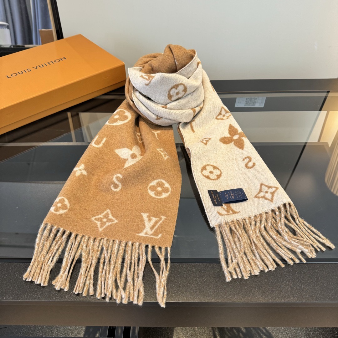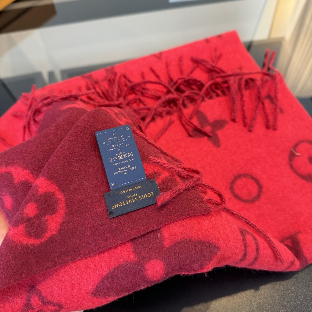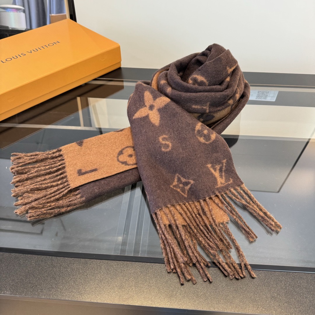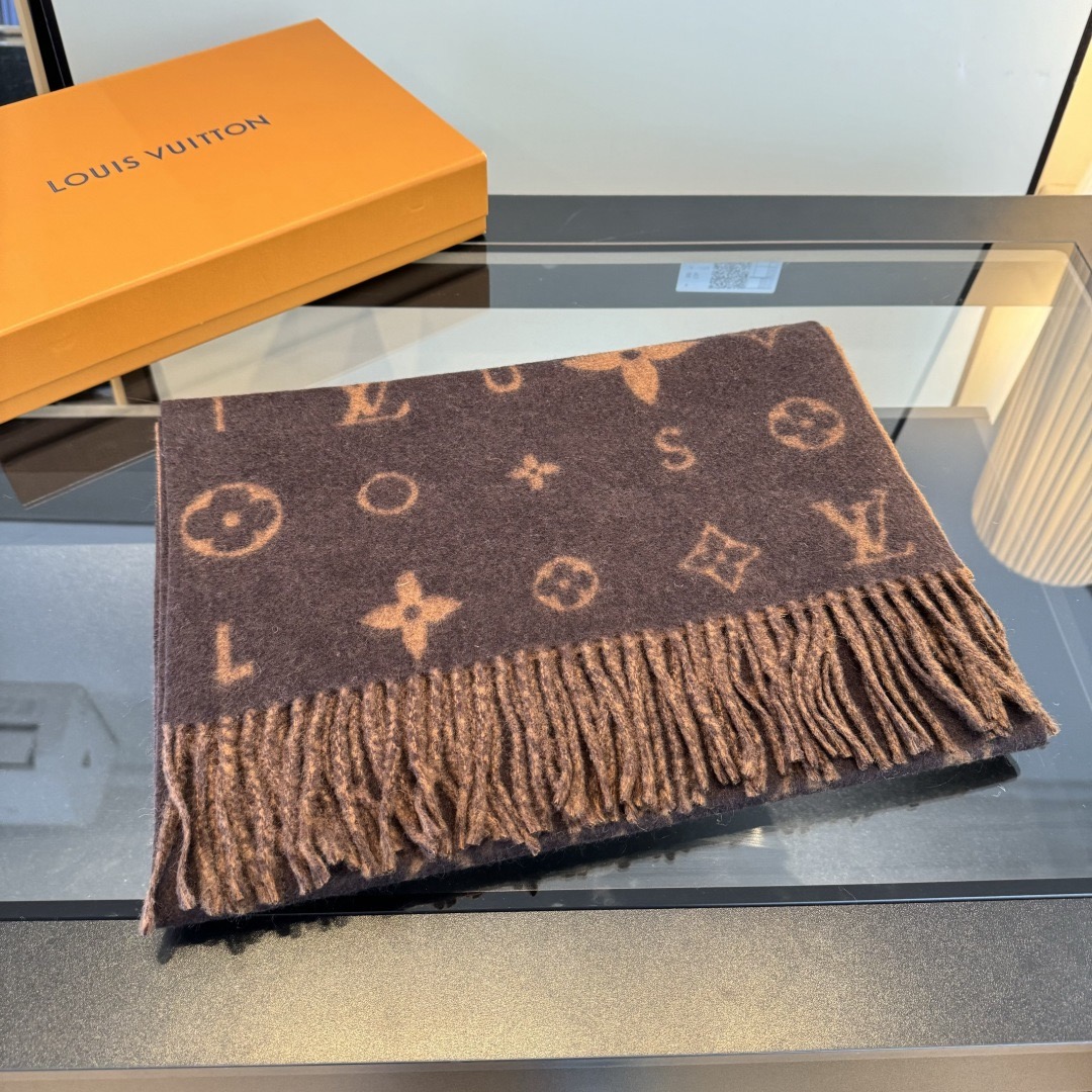 Reykjavik 2.0 围巾为柔软山羊绒标注 Monogram 花卉和 LV 字母,其间点缀品牌名称的单一字母,以摩登风姿焕新经典。加长设计适宜环绕颈部,亦可用作巴拉克拉法帽。 220 x40厘米(不含流苏),100% 山羊绒 Monogram 图案 流苏饰边