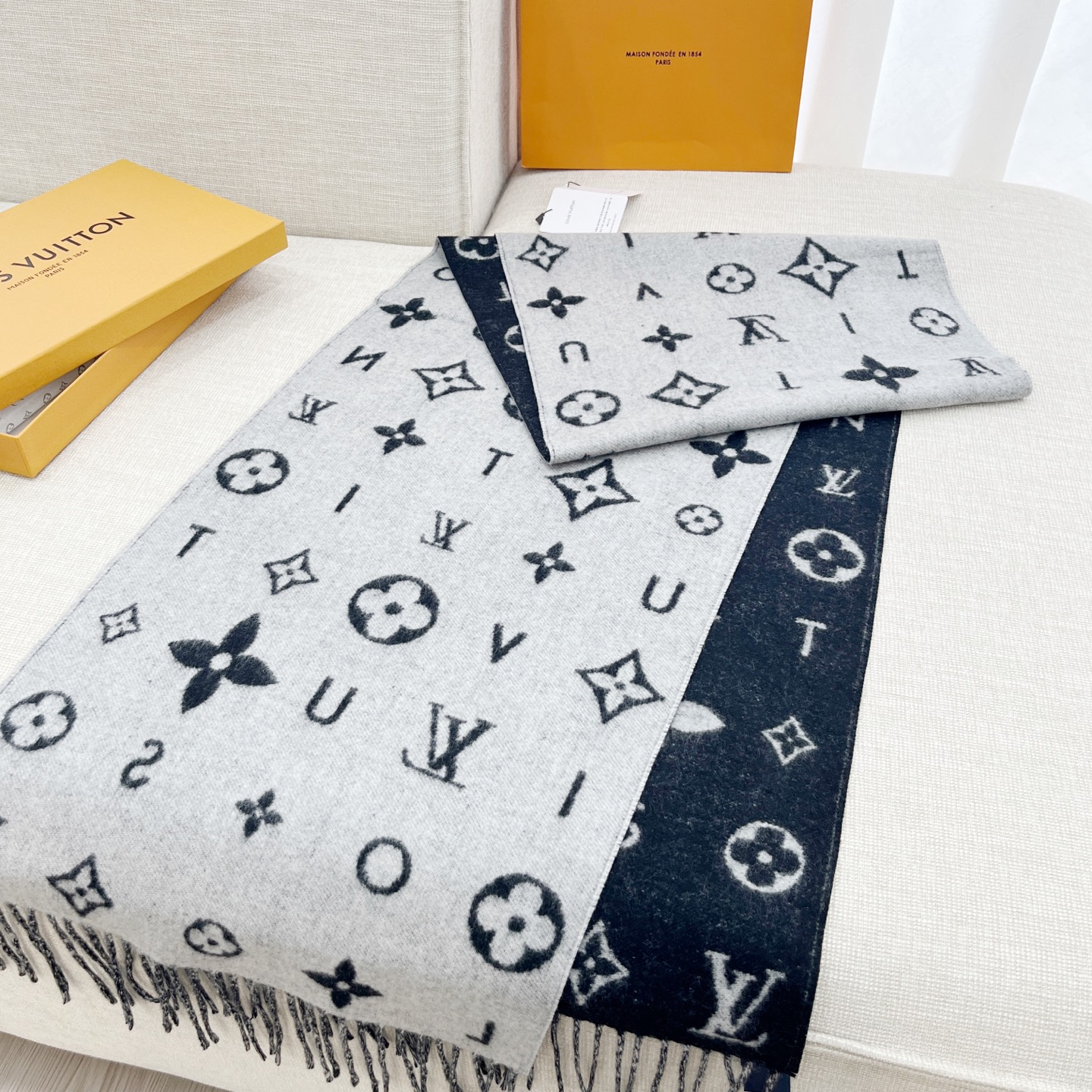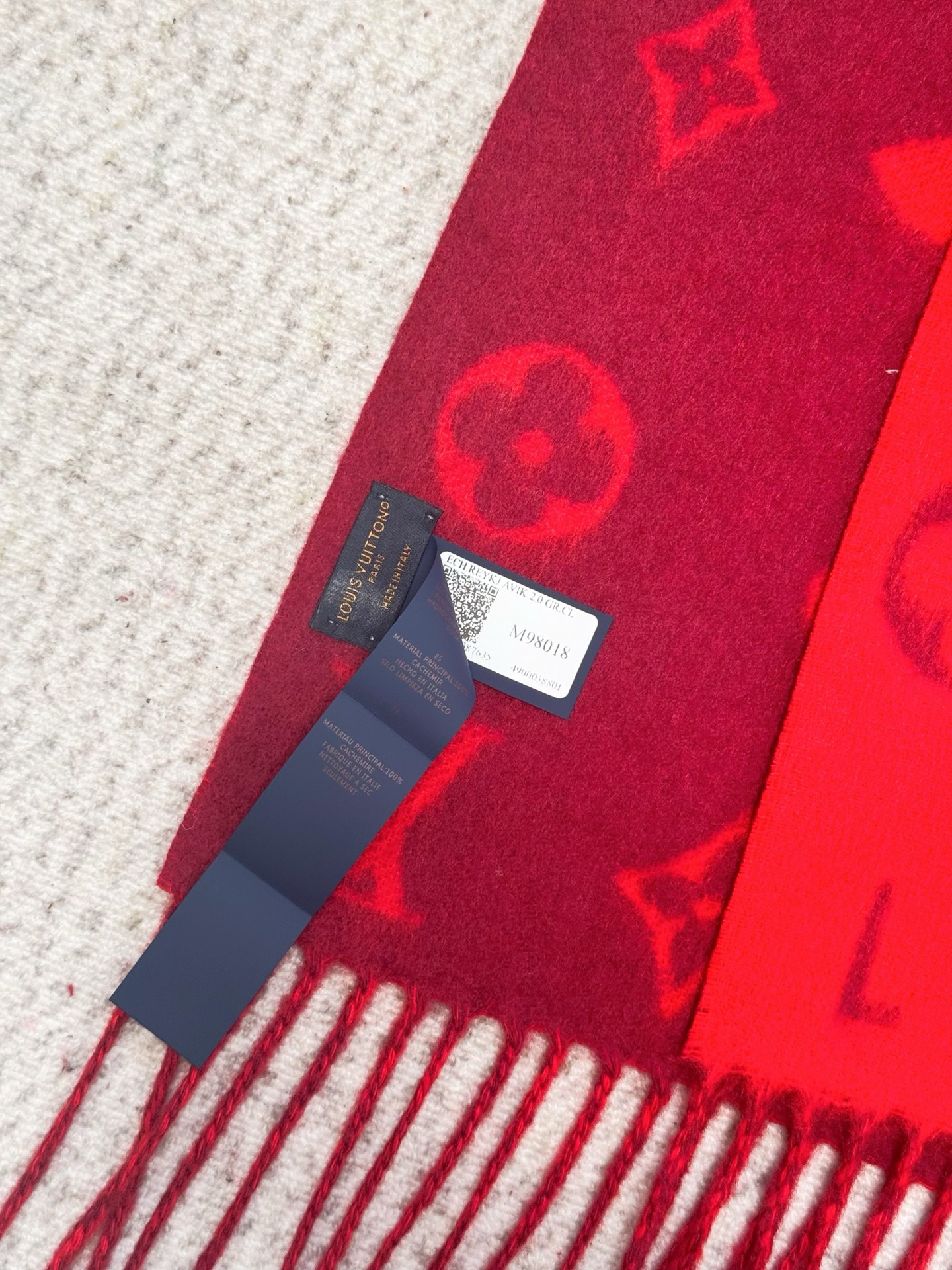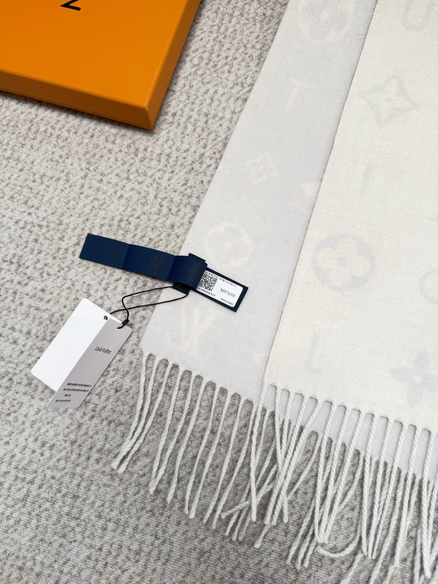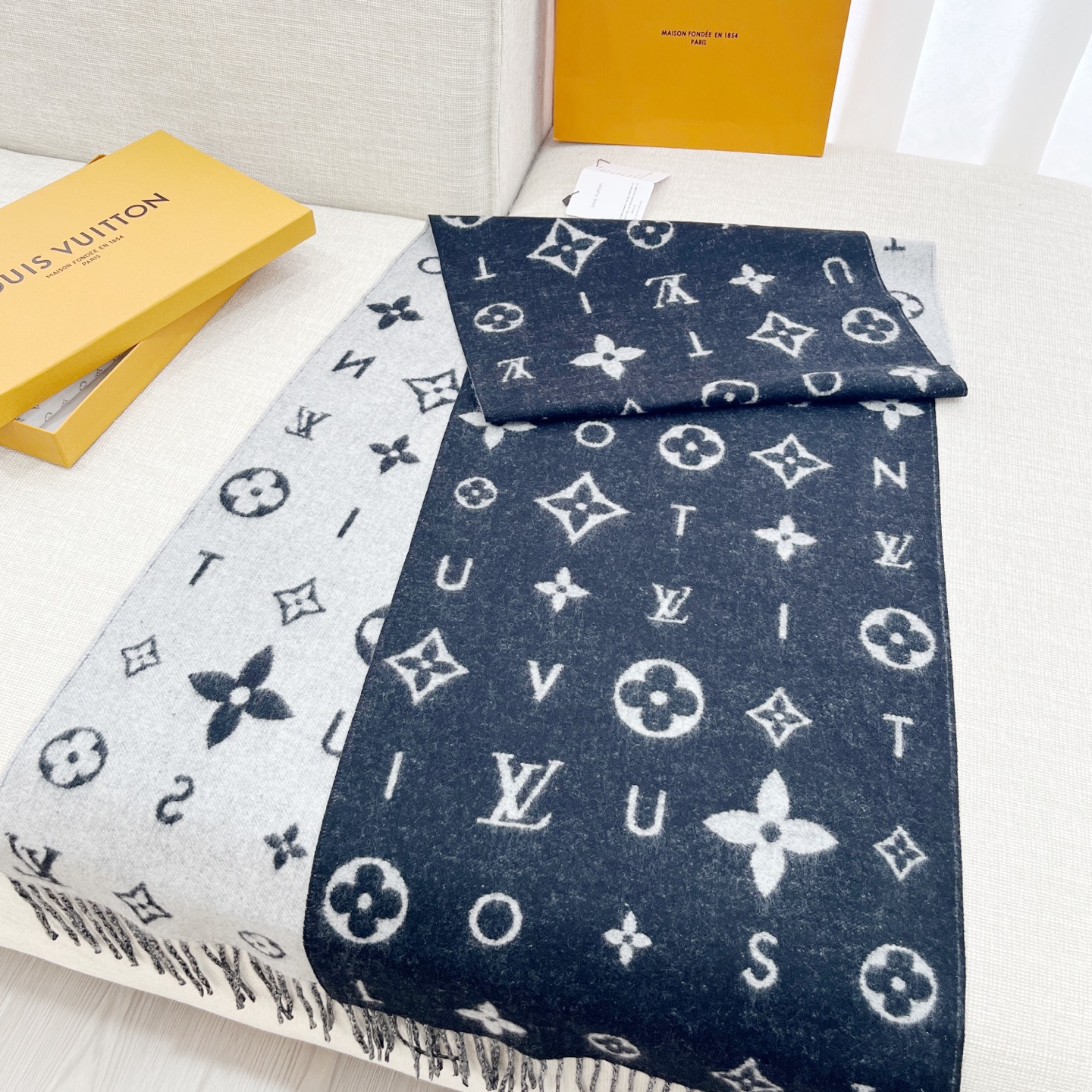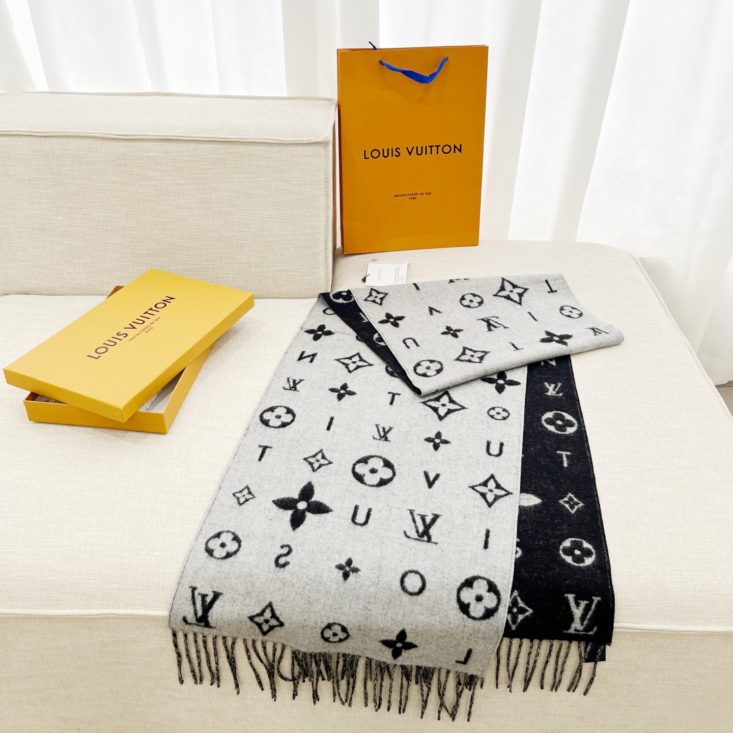 Reykjavik 2.0 围巾为柔软山羊绒标注 Monogram 花卉和 LV 字母,其间点缀品牌名称的单一字母,以摩登风姿焕新经典。加长设计适宜环绕颈部,亦可用作巴拉克拉法帽。 220 x40厘米(不含流苏),100% 山羊绒 Monogram 图案 流苏饰边