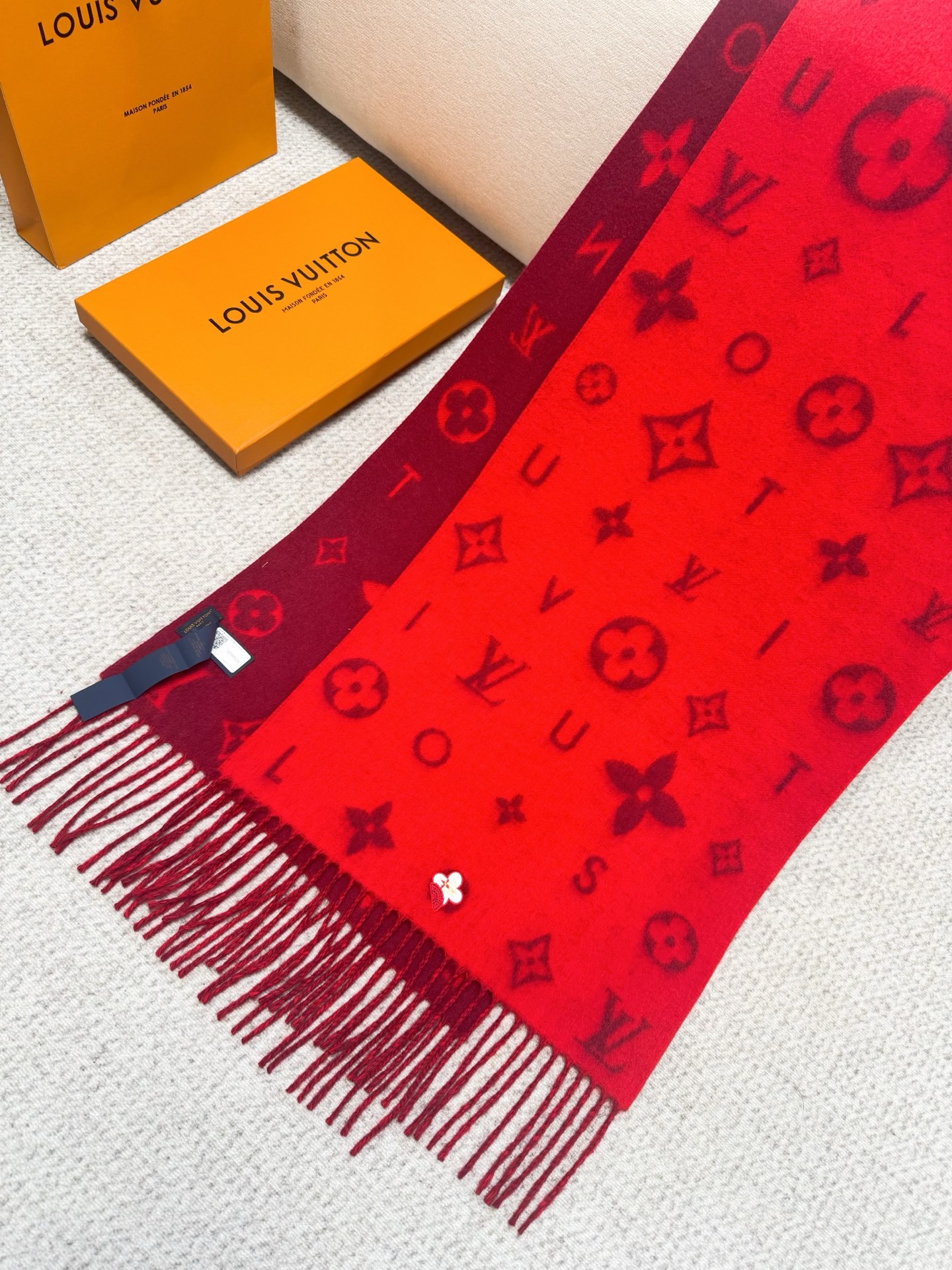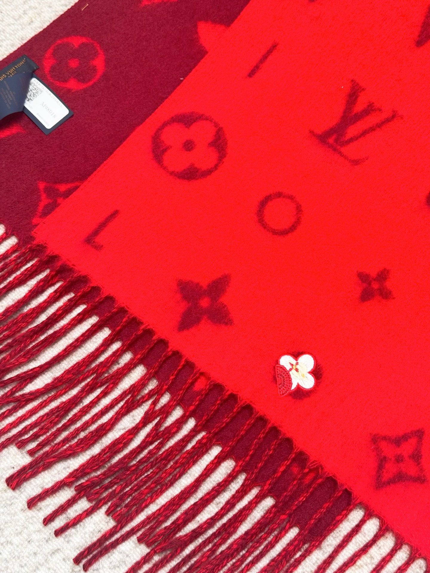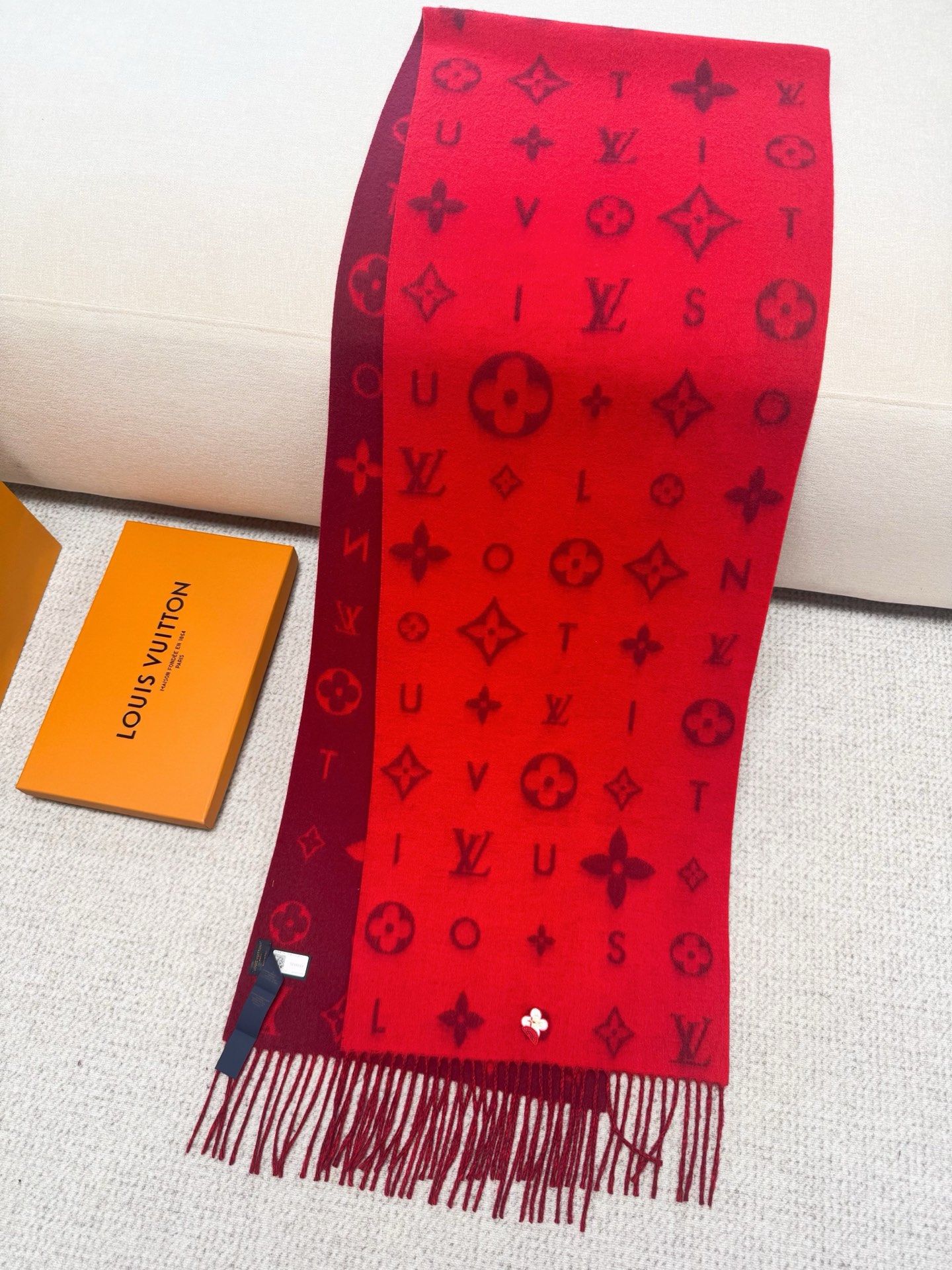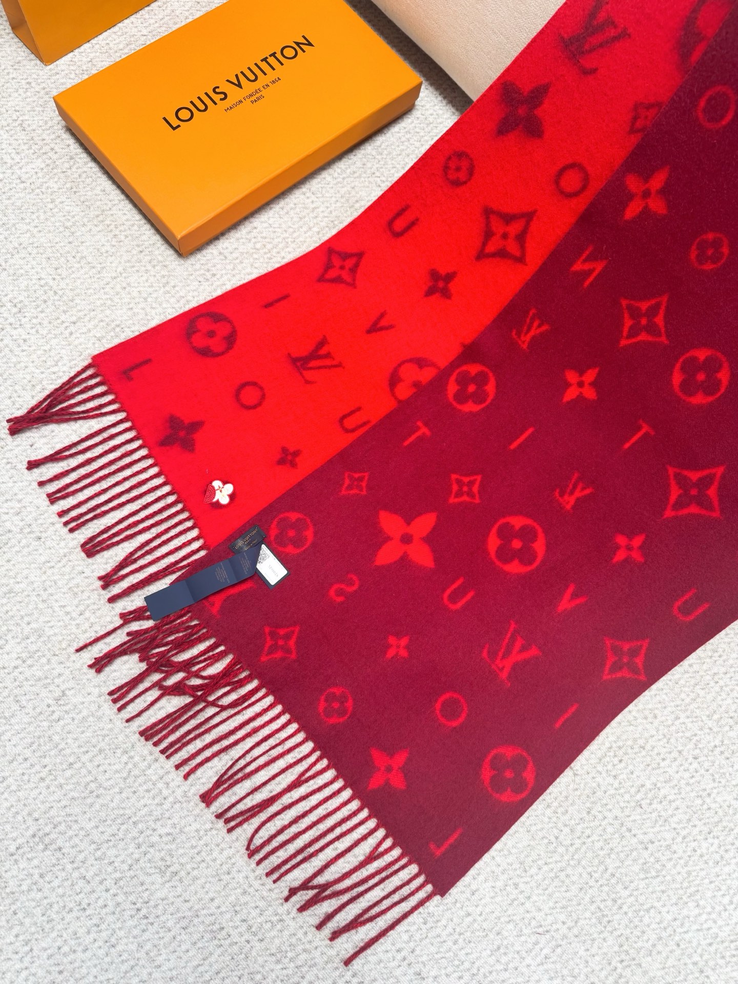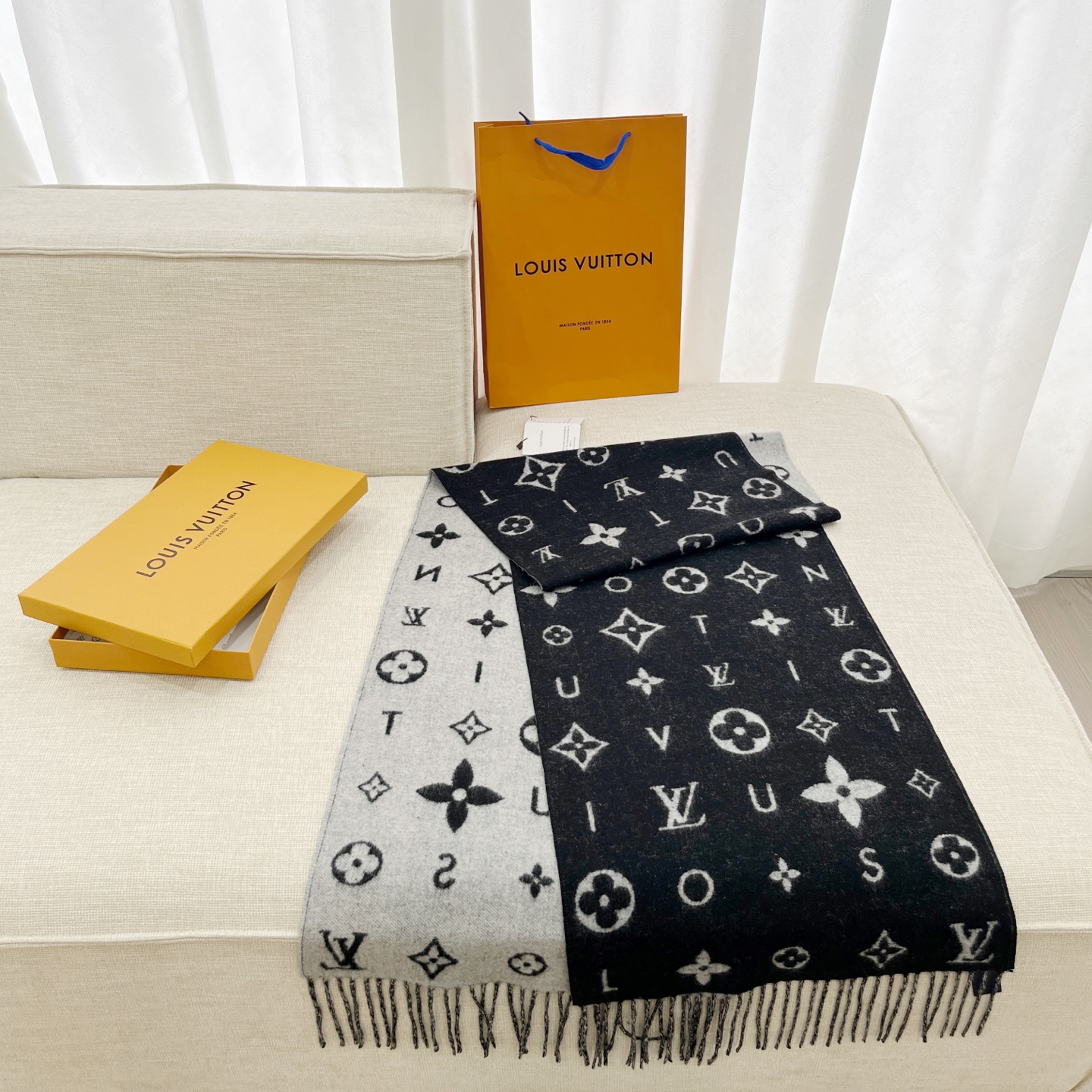 Reykjavik 2.0 围巾为柔软山羊绒标注 Monogram 花卉和 LV 字母,其间点缀品牌名称的单一字母,以摩登风姿焕新经典。加长设计适宜环绕颈部,亦可用作巴拉克拉法帽。 220 x40厘米(不含流苏),100% 山羊绒 Monogram 图案 流苏饰边