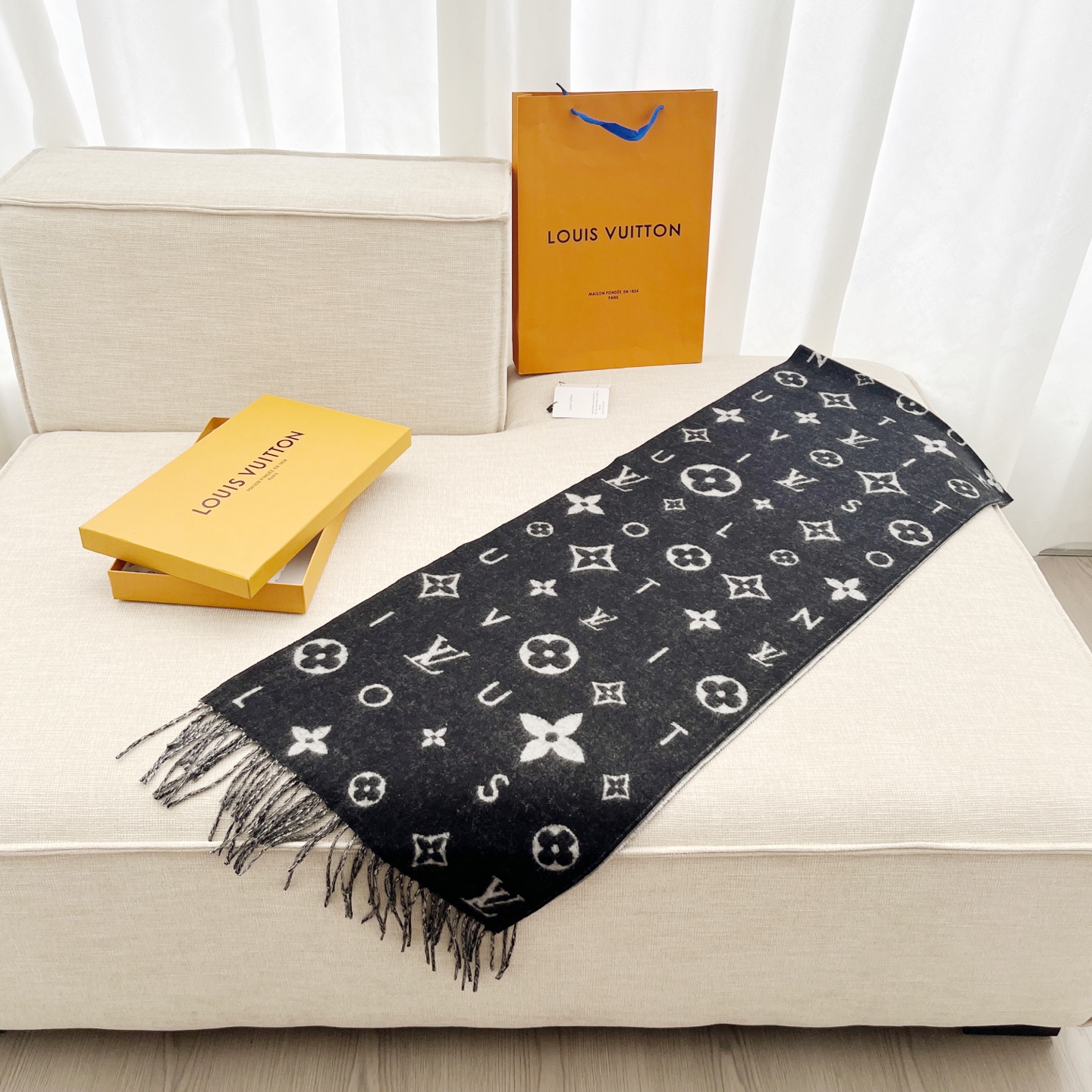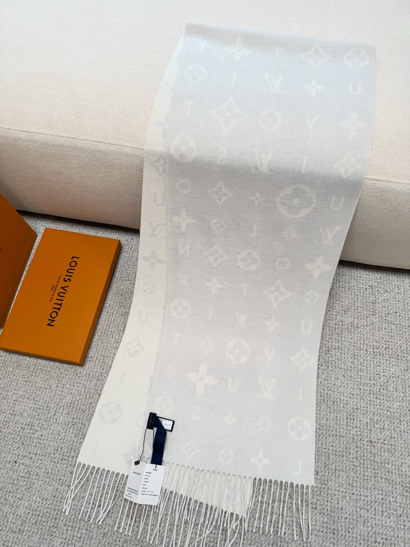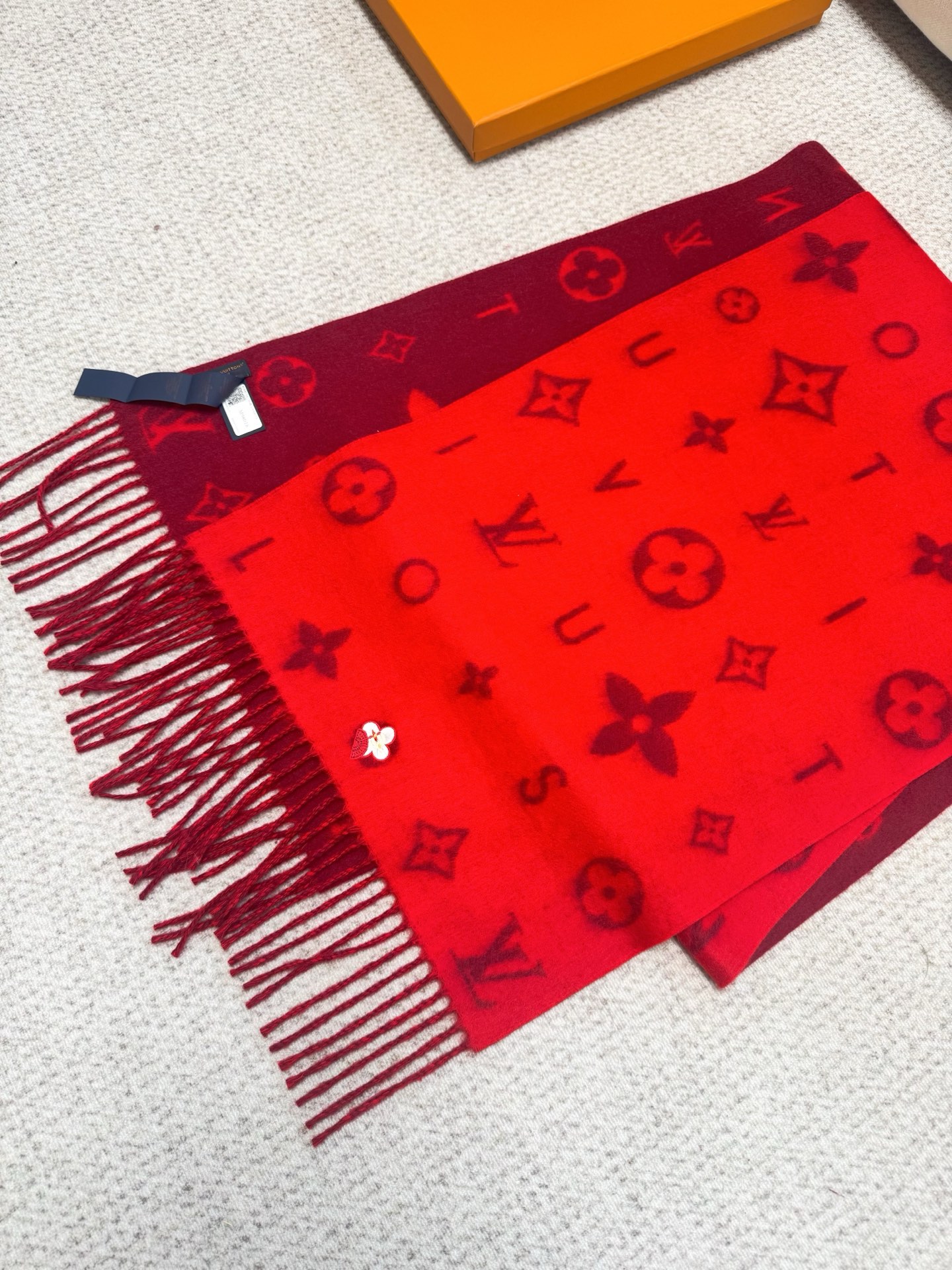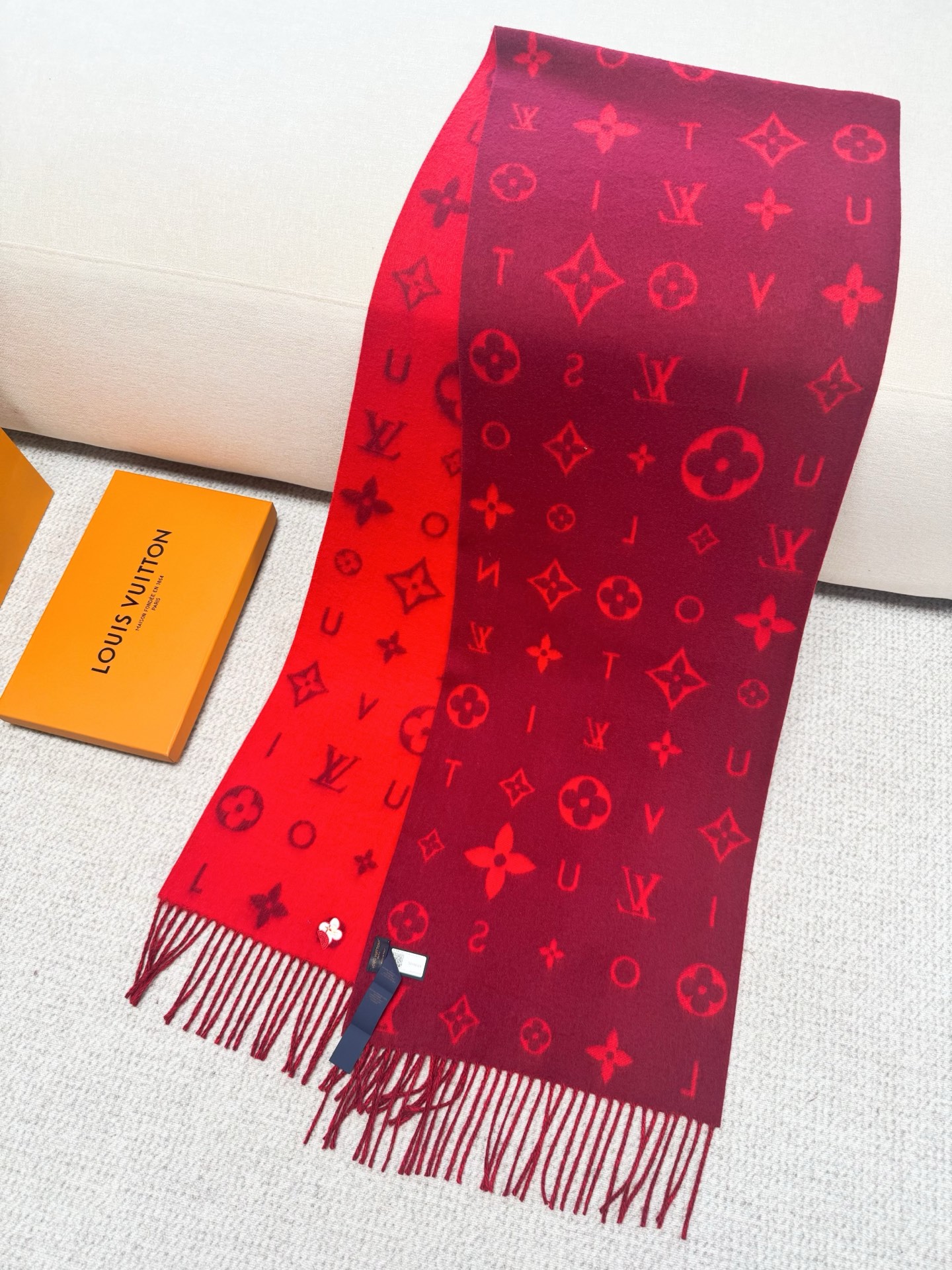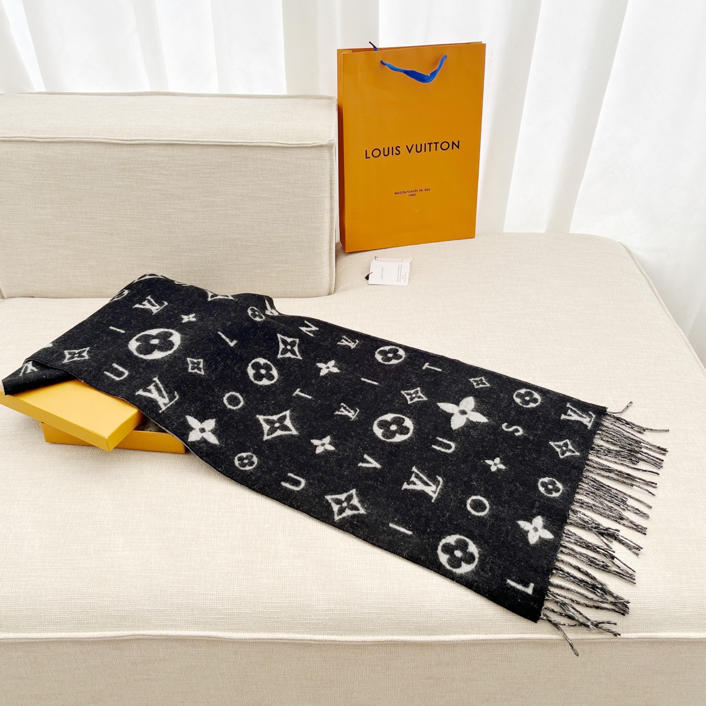 Reykjavik 2.0 围巾为柔软山羊绒标注 Monogram 花卉和 LV 字母,其间点缀品牌名称的单一字母,以摩登风姿焕新经典。加长设计适宜环绕颈部,亦可用作巴拉克拉法帽。 220 x40厘米(不含流苏),100% 山羊绒 Monogram 图案 流苏饰边