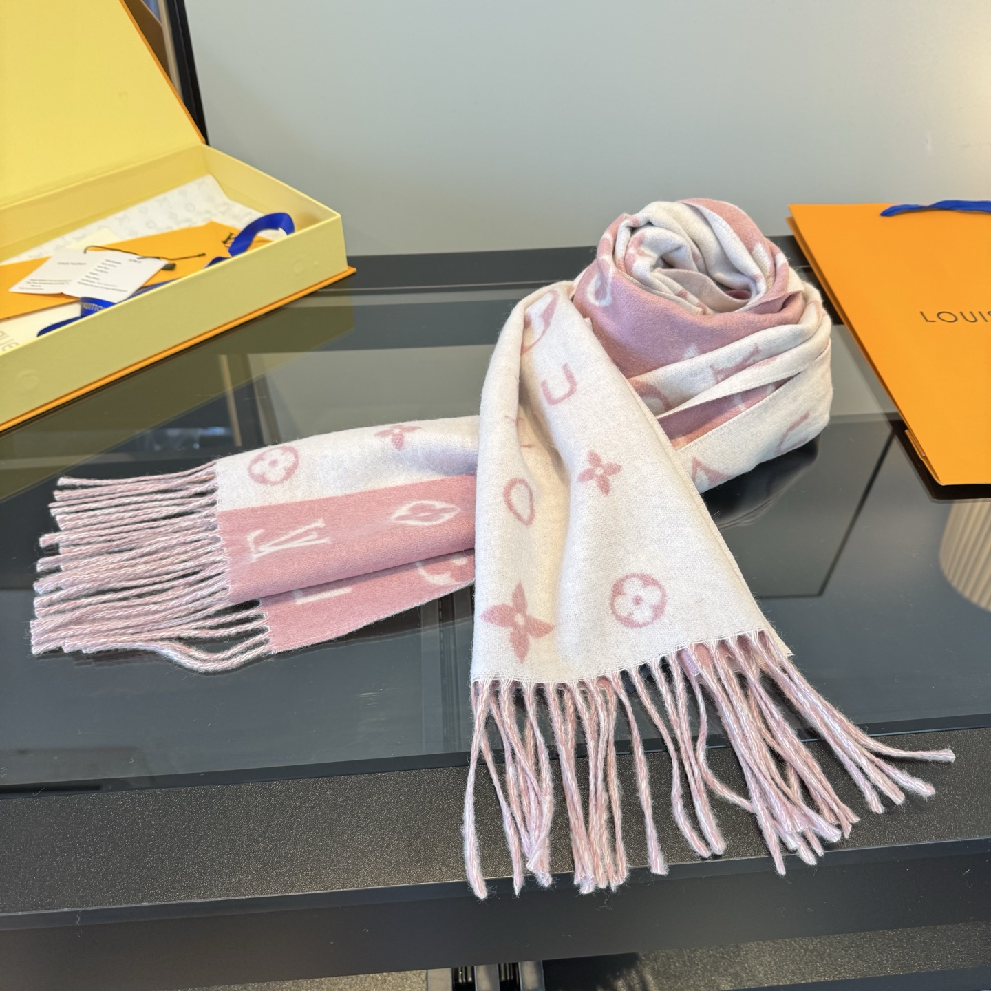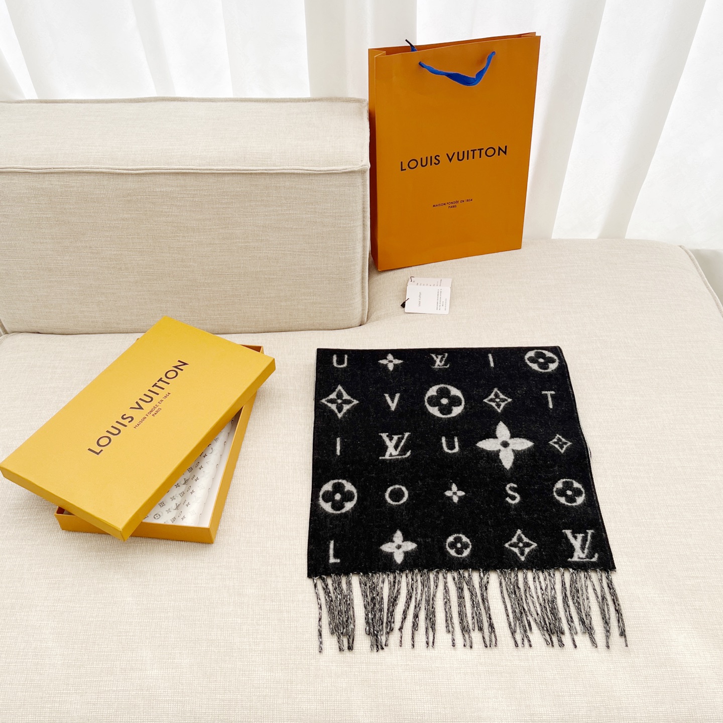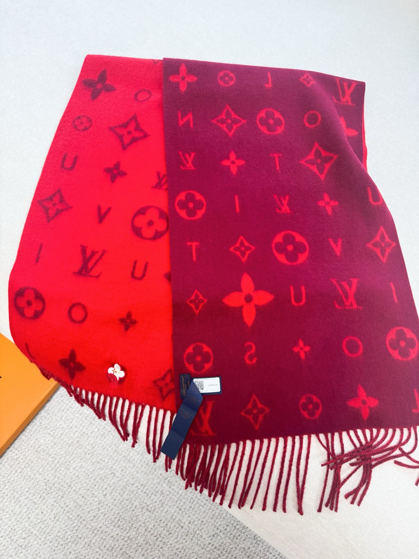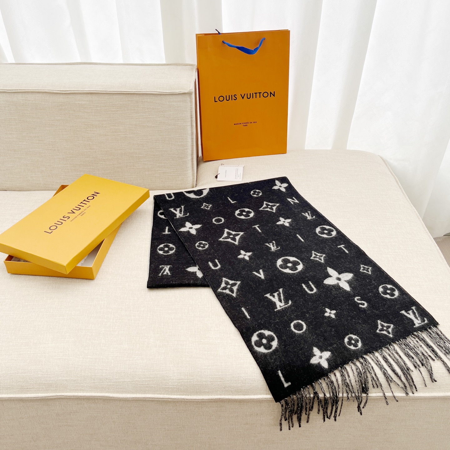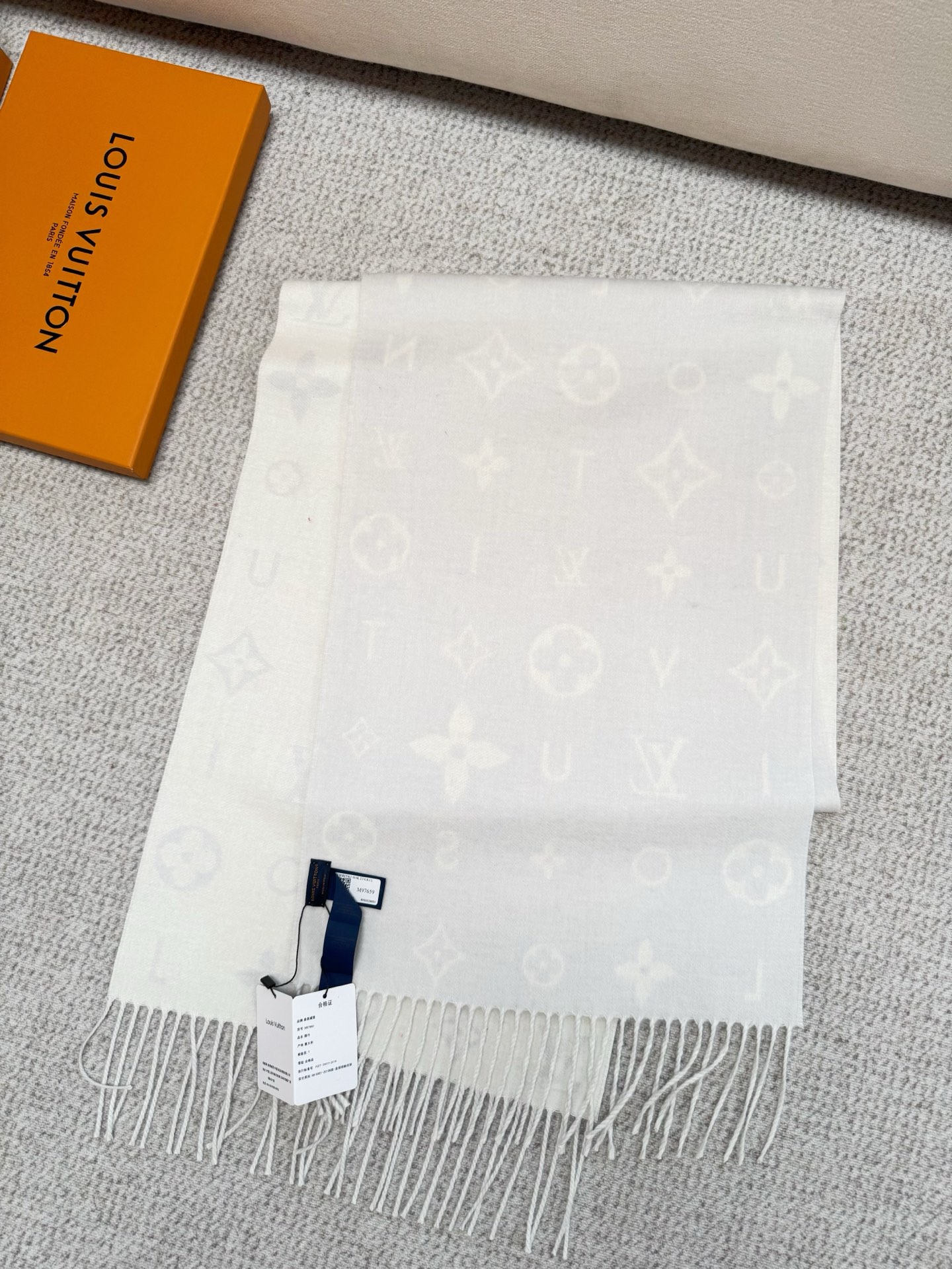 Reykjavik 2.0 围巾为柔软山羊绒标注 Monogram 花卉和 LV 字母,其间点缀品牌名称的单一字母,以摩登风姿焕新经典。加长设计适宜环绕颈部,亦可用作巴拉克拉法帽。 220 x40厘米(不含流苏),100% 山羊绒 Monogram 图案 流苏饰边