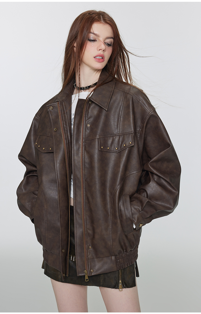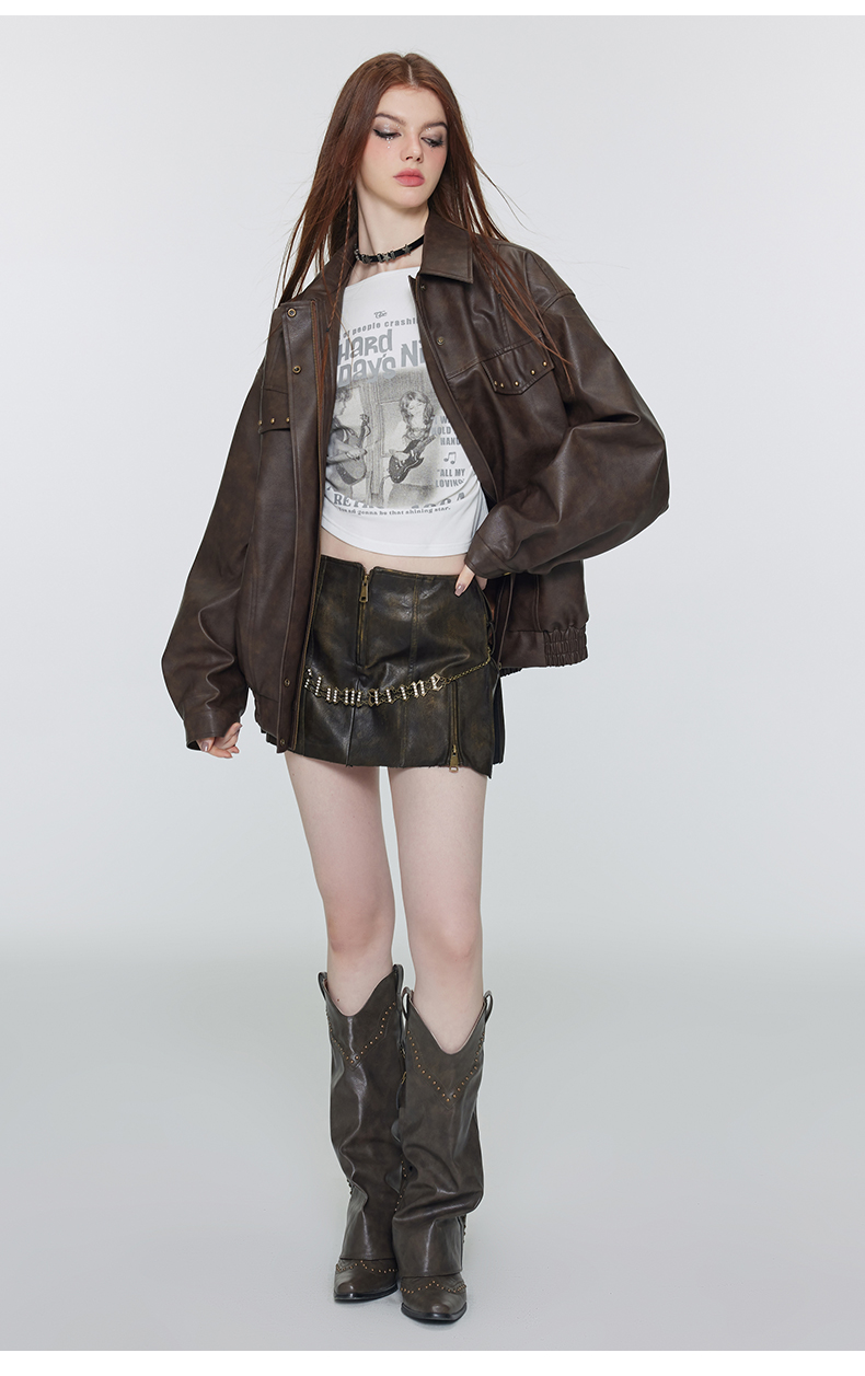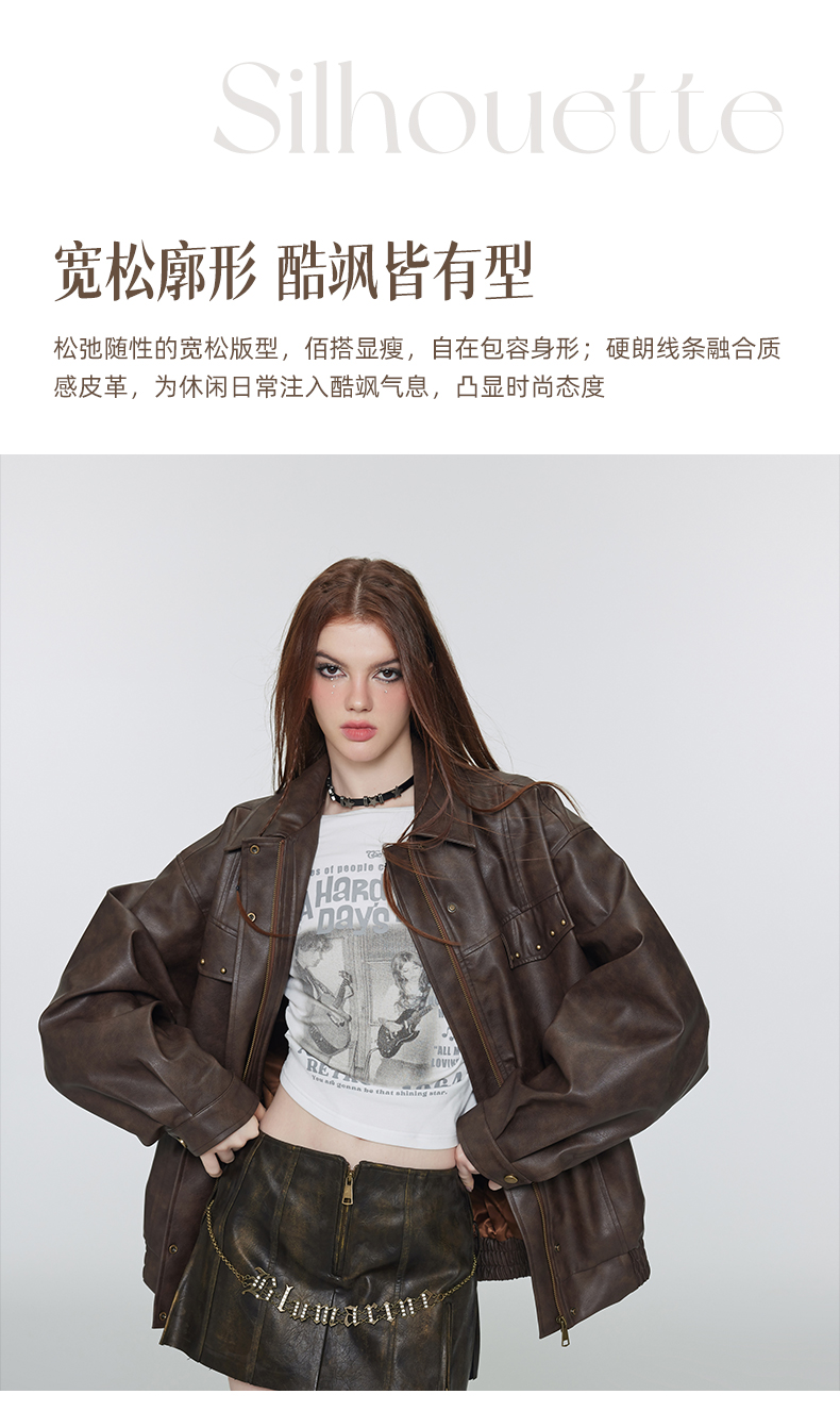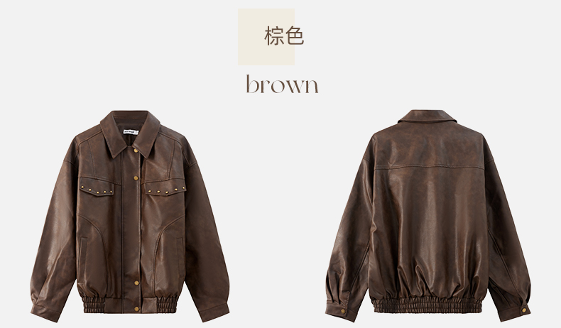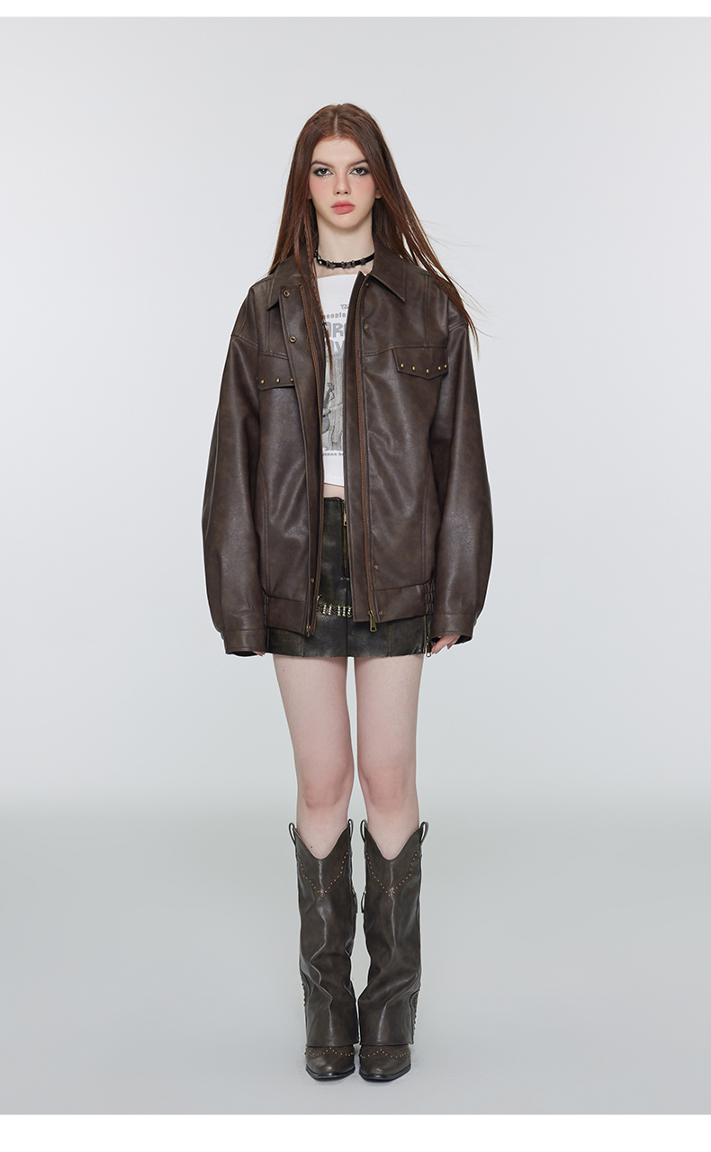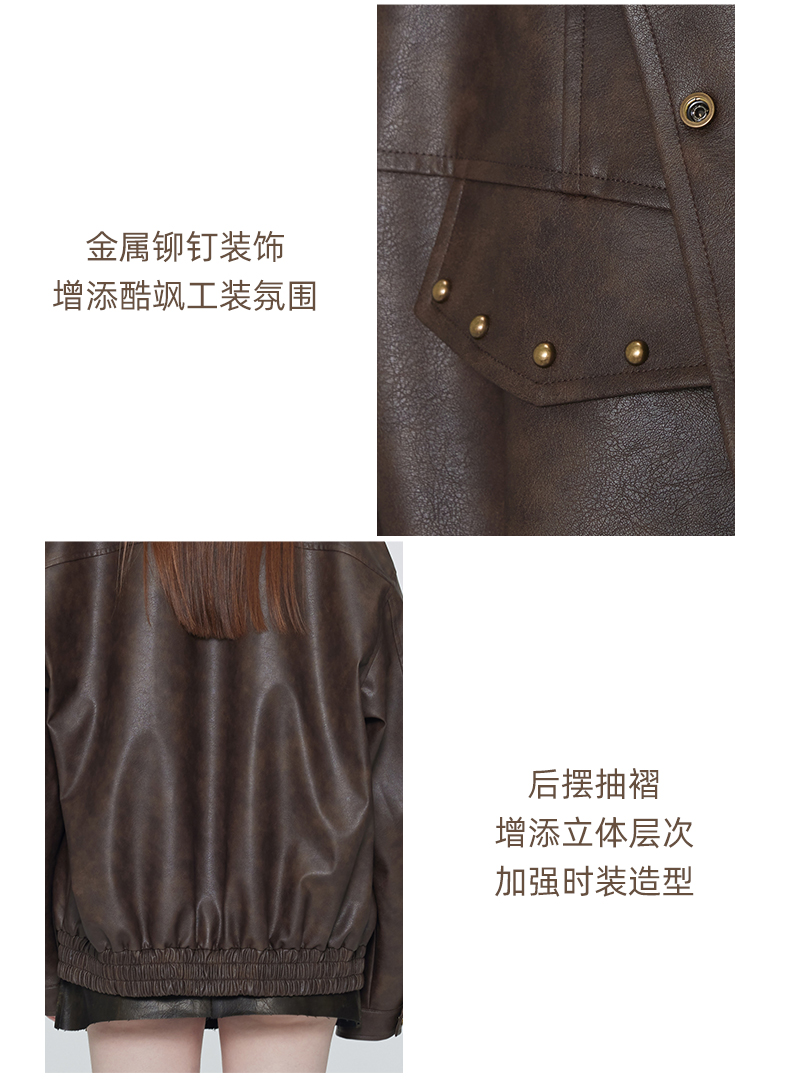 IC 美拉德柳钉短外套上衣秋冬新款美式复古皮衣女短款皮夹克