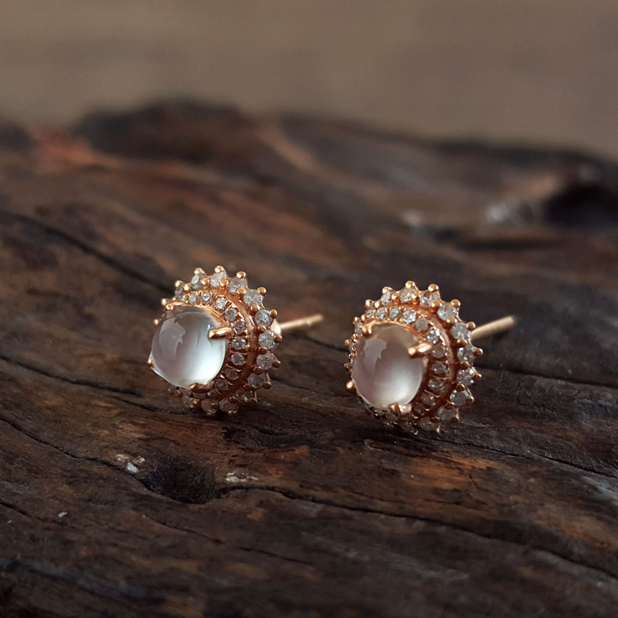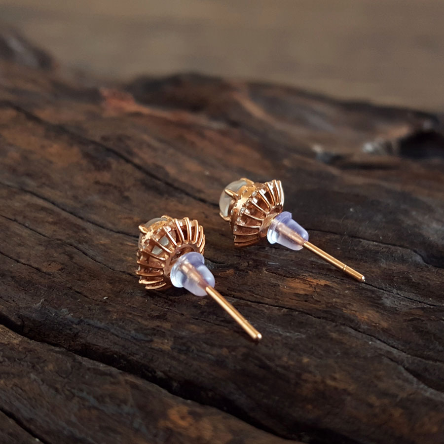 名称 | AU750玫瑰金镶钻镶天然细腻白色高冰种蛋面翡翠耳钉 |