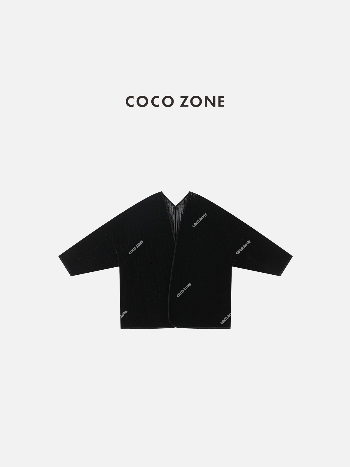 COCO ZONE 黑色丝绒奶奶服外套V斜领长袖宽松显瘦 23C19406