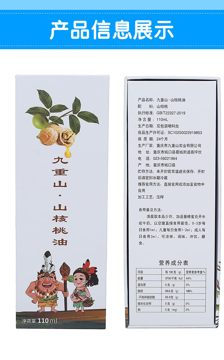 九重山 山核桃油孕妇儿童老人食用油 山核桃油250ml*2瓶/盒 *山核桃物理压榨