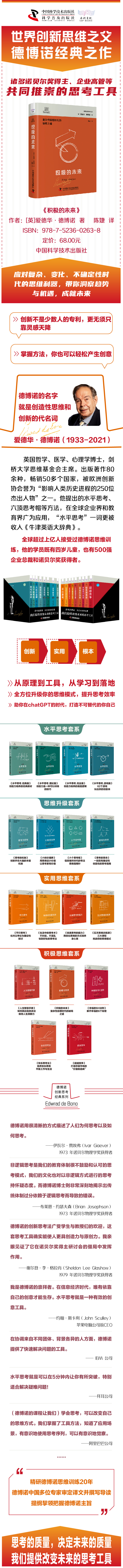 爱德华?6?1德博诺,英国哲学、医学、心理学博士,剑桥大学思维基金会主席。出版著作80余种,畅销50多个国家,被欧洲创新协会誉为“影响人类历史进程的250位杰出人物”之一。他提出的水平思考、六顶思考帽等方法,在全球企业界和教育界广为应用,“水平思考”一词更被收入《牛津英语大辞典》。他的名字已成为创造性思维和创新的代表。