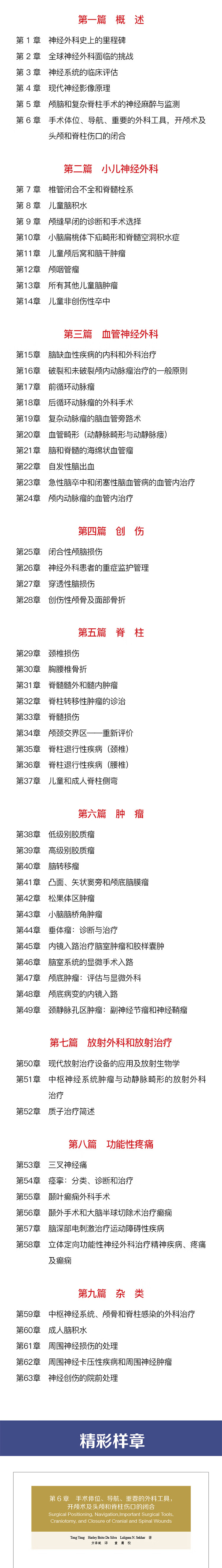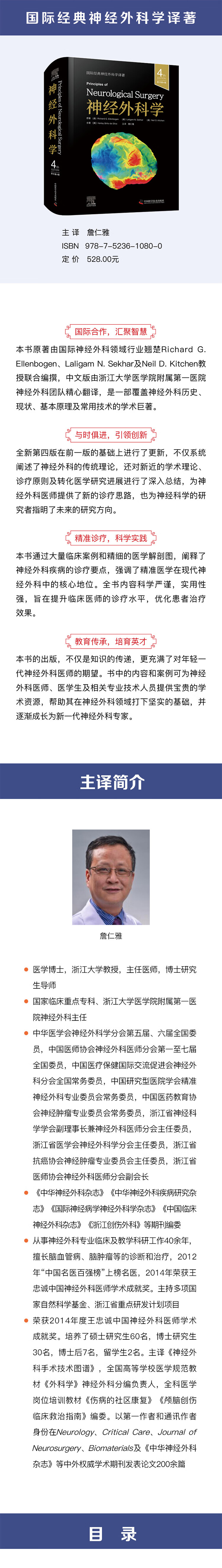 Laligam·N.Sekhar,医学博士,美国华盛顿大学医学院神经外科教授,对脑血管疾病和颅底外科均有较深的造诣,已发表论文三百余篇,参编Surgery of Cranial Base Tumors》等多部著作。詹仁雅,医学博士,浙江大学医学院附属第一医院神经外科主任,主任医师,教授,博士生导师。中华医学会神经外科分会全国委员,中国医师协会神经外科委员会全国委员,中国老年协会心脑血管病委员会常委。长期从事颅脑外伤、脑肿瘤、脑血管疾病、脊髓肿瘤,以及功能神经外科疾病的诊治。主持国家临床重点专科建设项目、国家自然科学基金等十余项各级课题,获得中华医学会科技进步奖、浙江省科技进步奖、浙江省医药卫生创新奖。以第一作者或通讯作者论著100余篇,主编、主译多部现代神经外科专著。