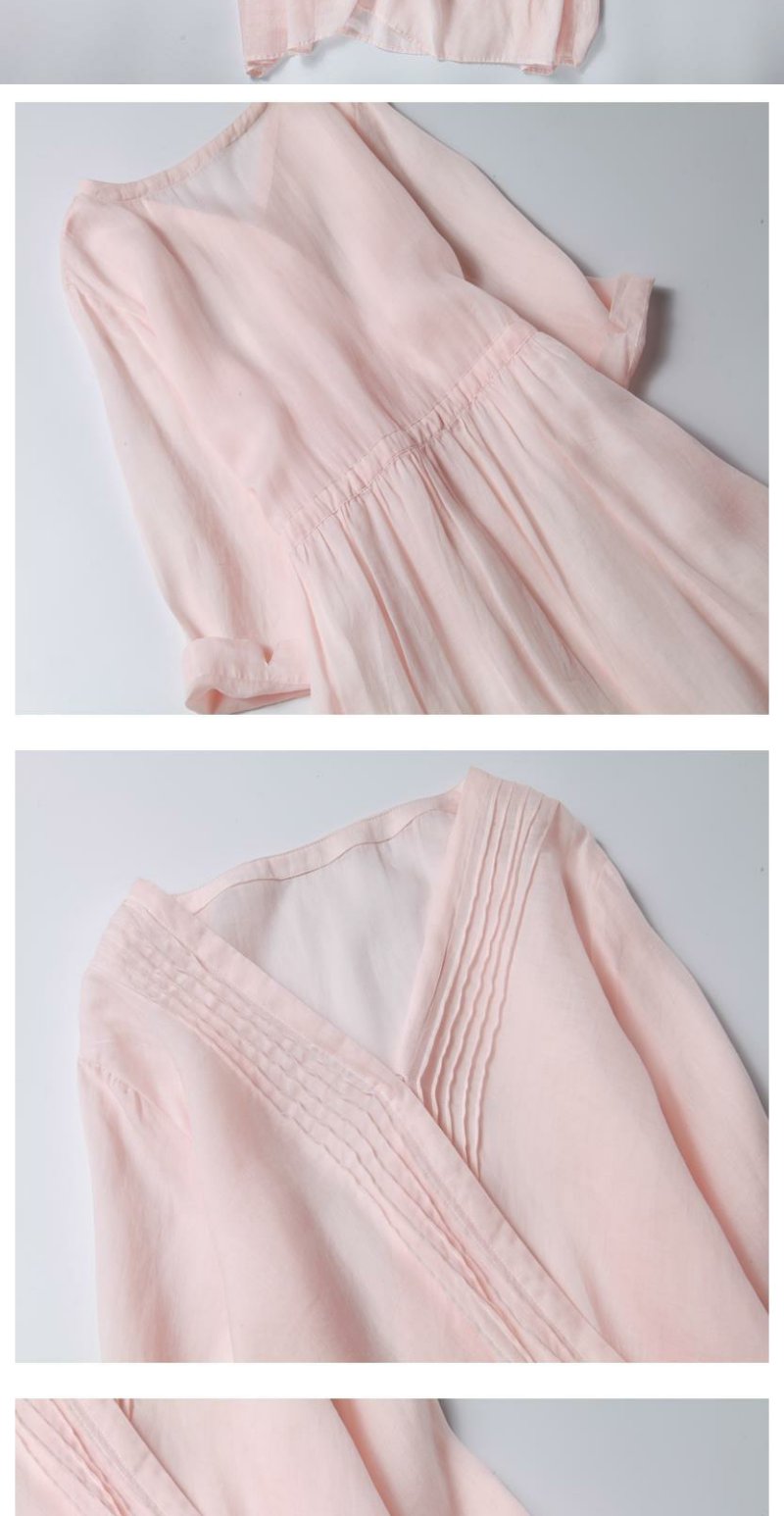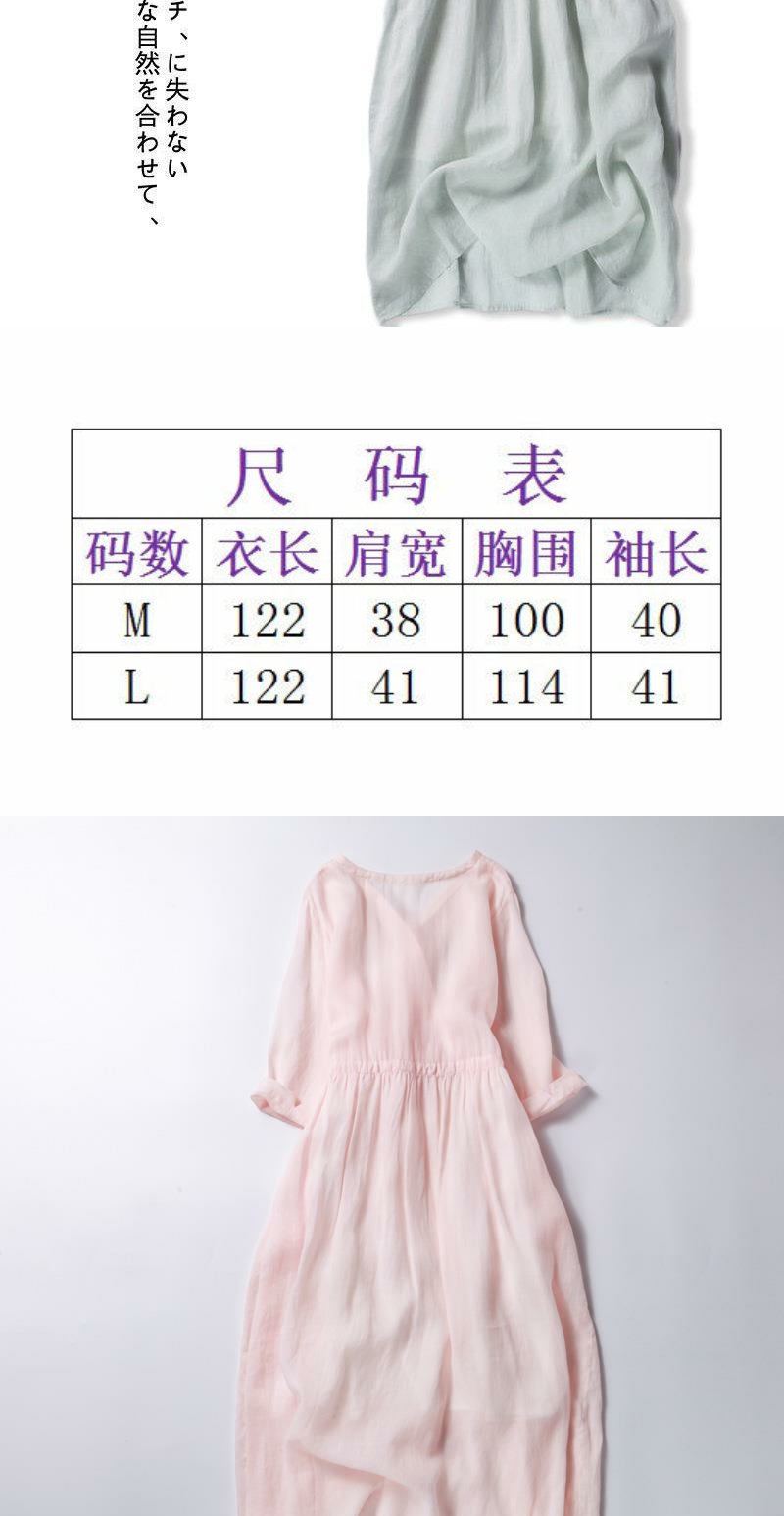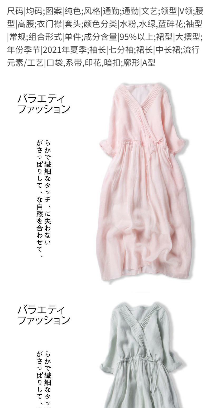 夏季仿苎麻宽松文艺V领七分袖大摆裙高腰显瘦系带纯色中长裙