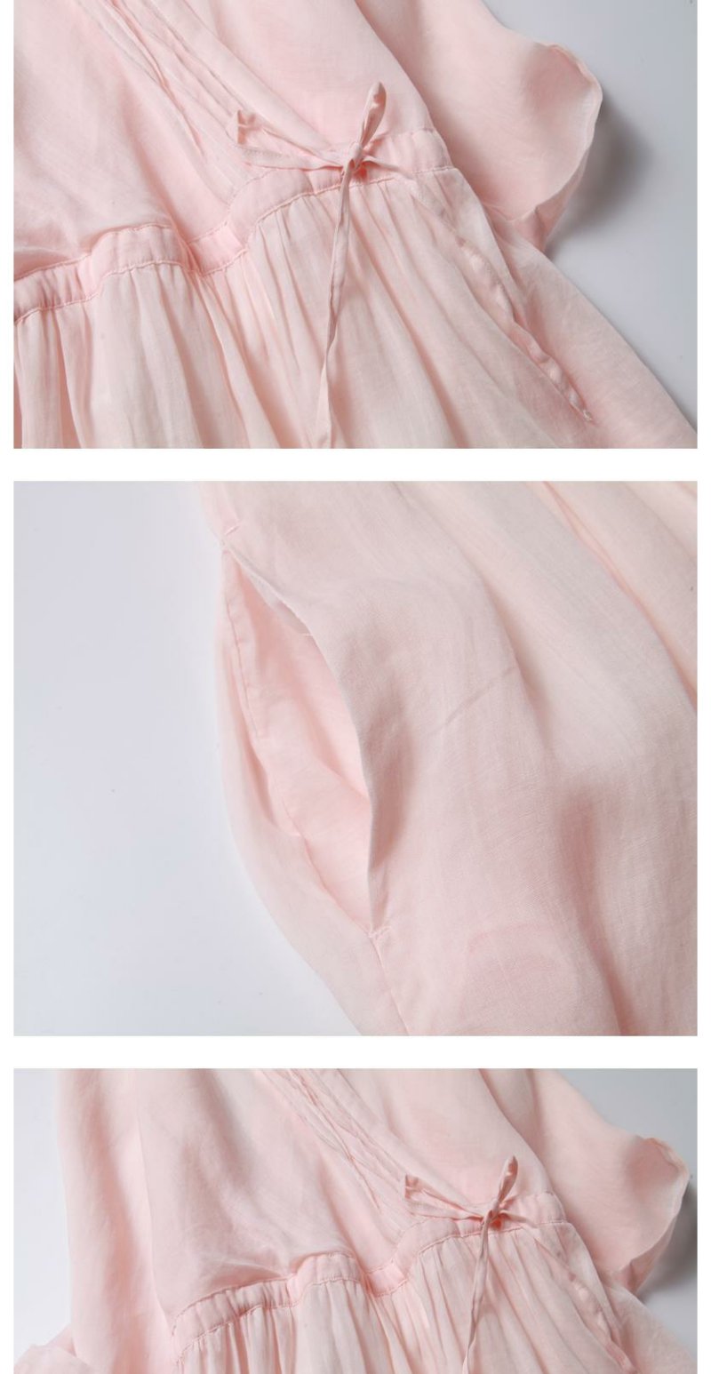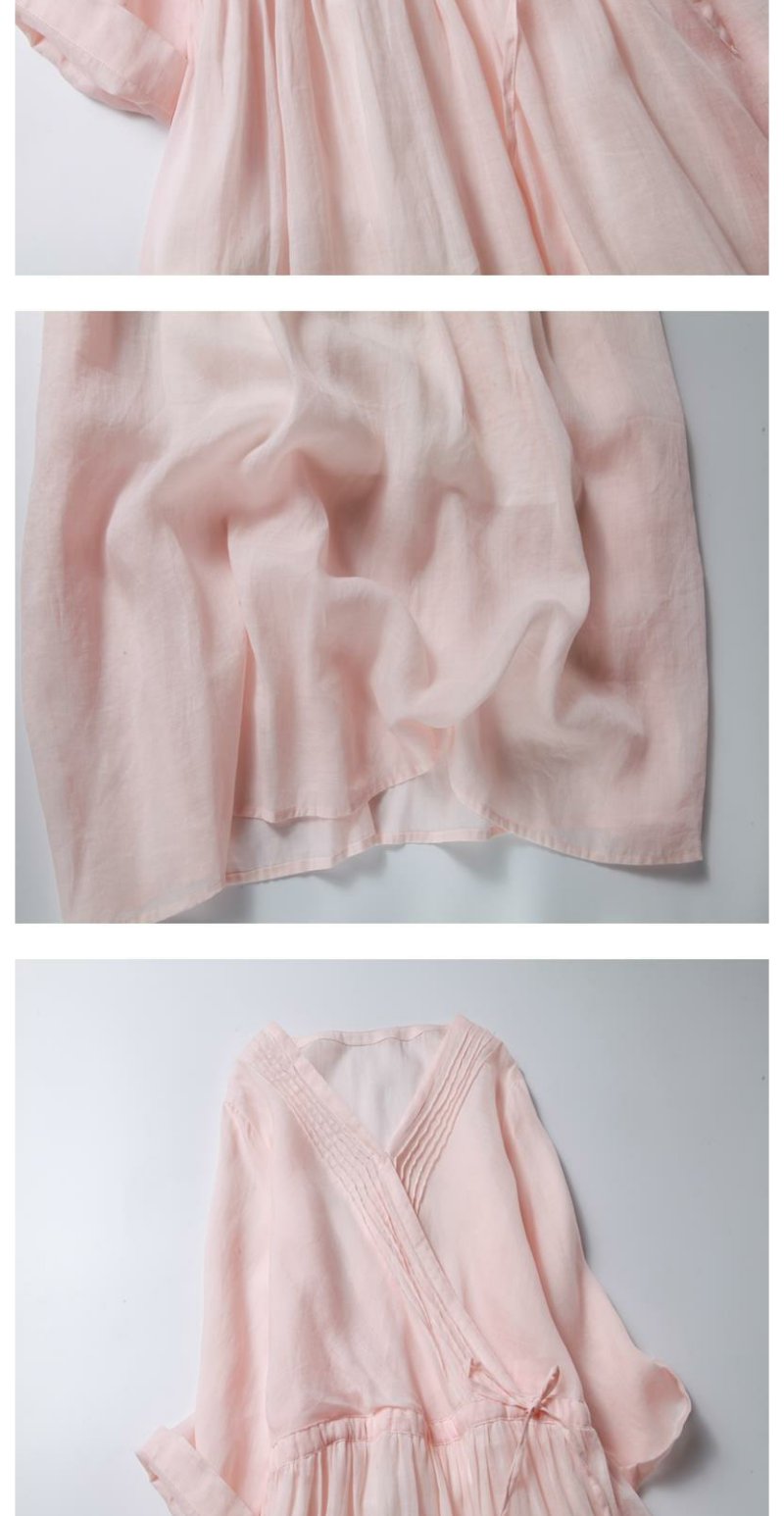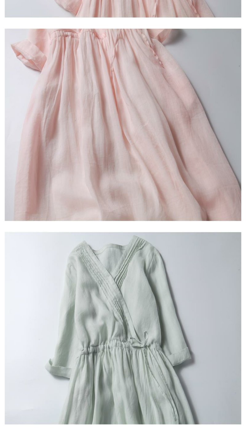 夏季仿苎麻宽松文艺V领七分袖大摆裙高腰显瘦系带纯色中长裙