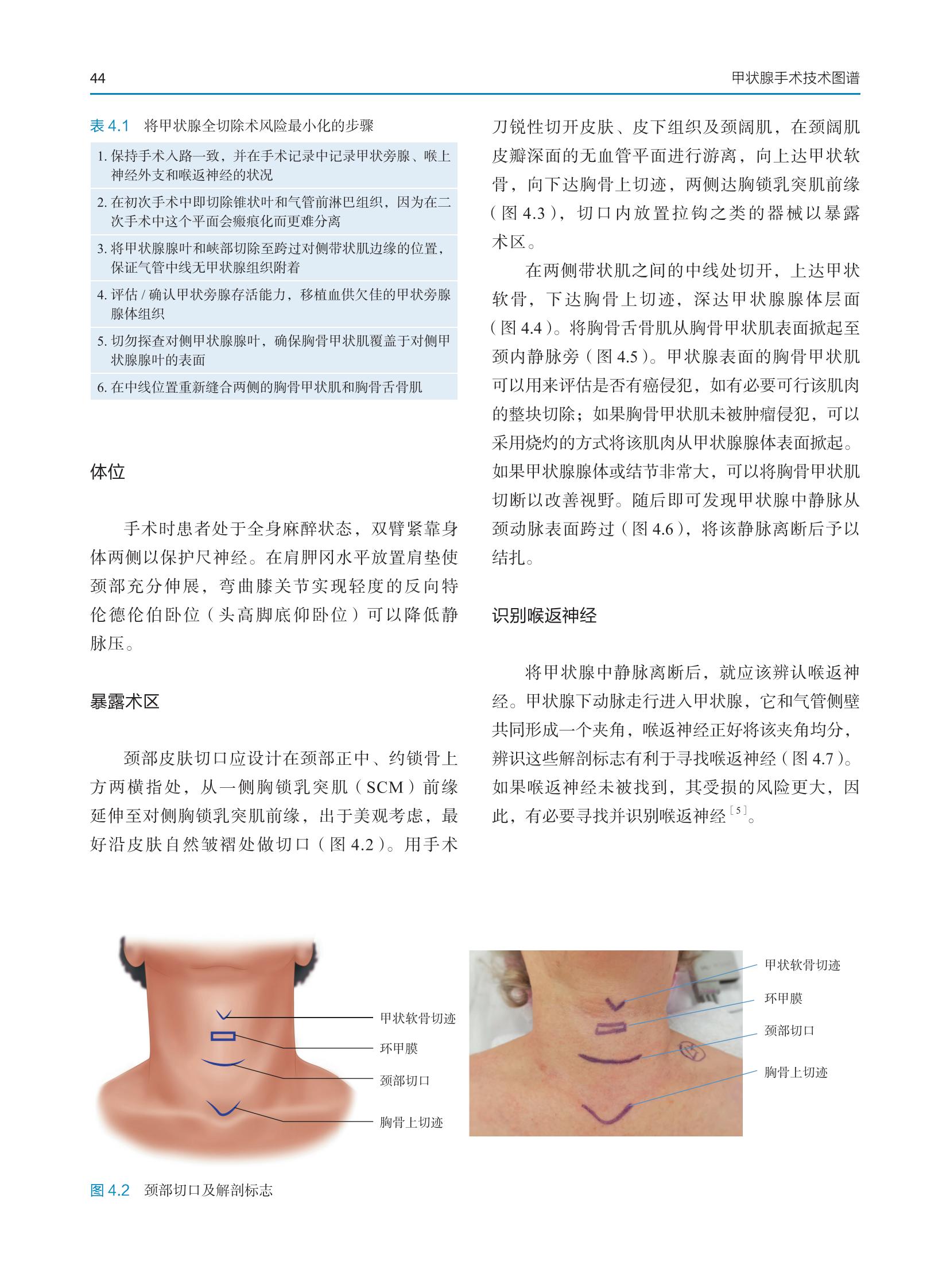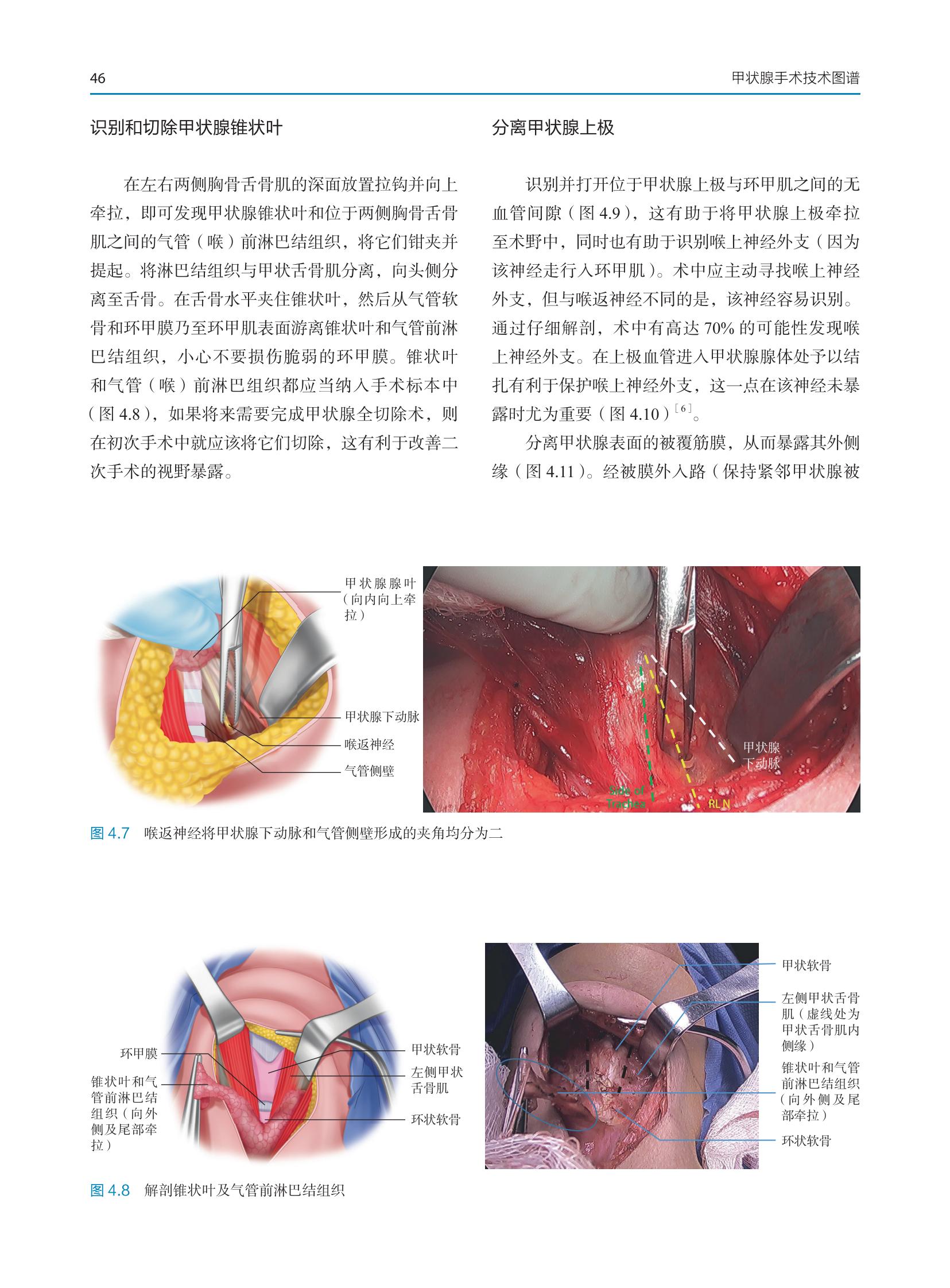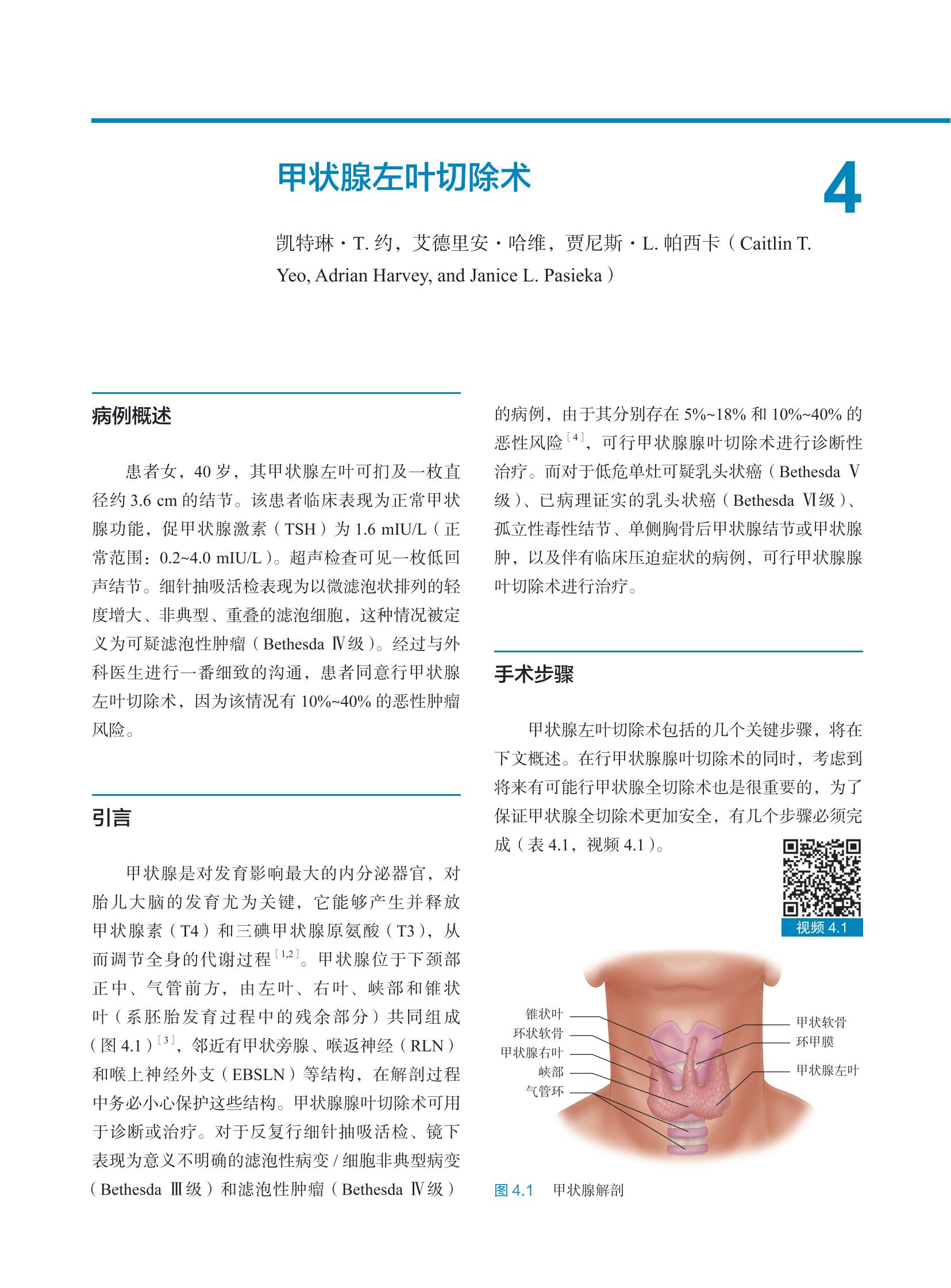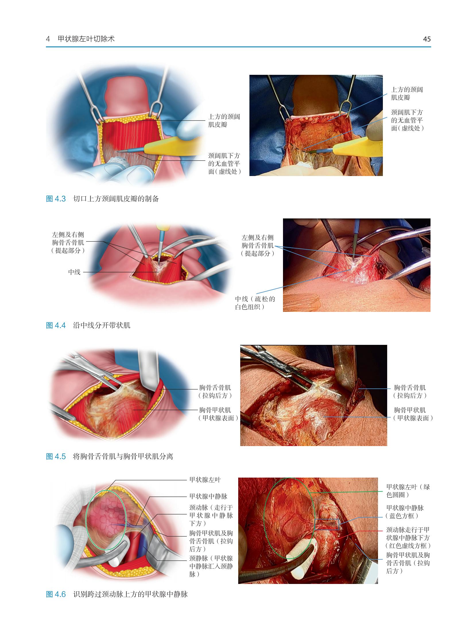 这本手术图谱展示了世界著名外科医生各种成功的甲状腺手术技术。介绍的手术方法包括甲状腺全切除术、甲状腺右叶切除术、左叶甲状腺切除术、微创甲状腺切除术,视频辅助甲状腺切除术和内镜手术,如 经腋下入路、双侧腋下乳房入路(BABA)和经口甲状腺手术(TOEVA)。由于甲状腺切除术是最常见的颈部手术之一,因此与其他手术的出版物相比,图谱的读者范围更广。本书将帮助所有照顾甲状腺疾病患 者的外科医生将并发症降至最低,并成功完成甲状腺切除术。