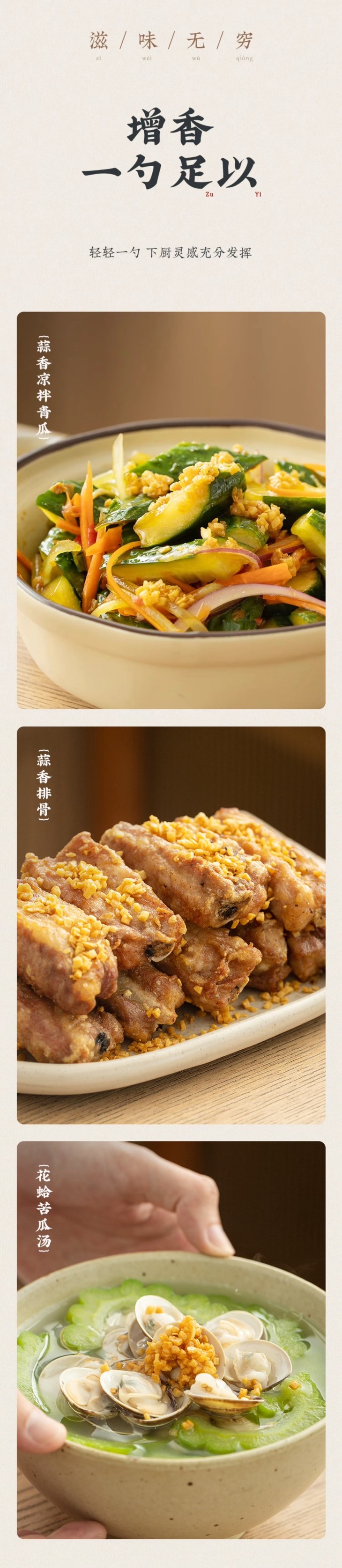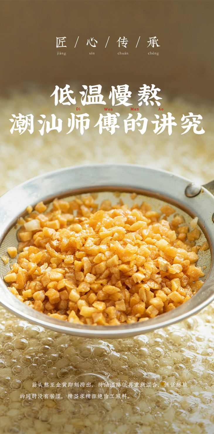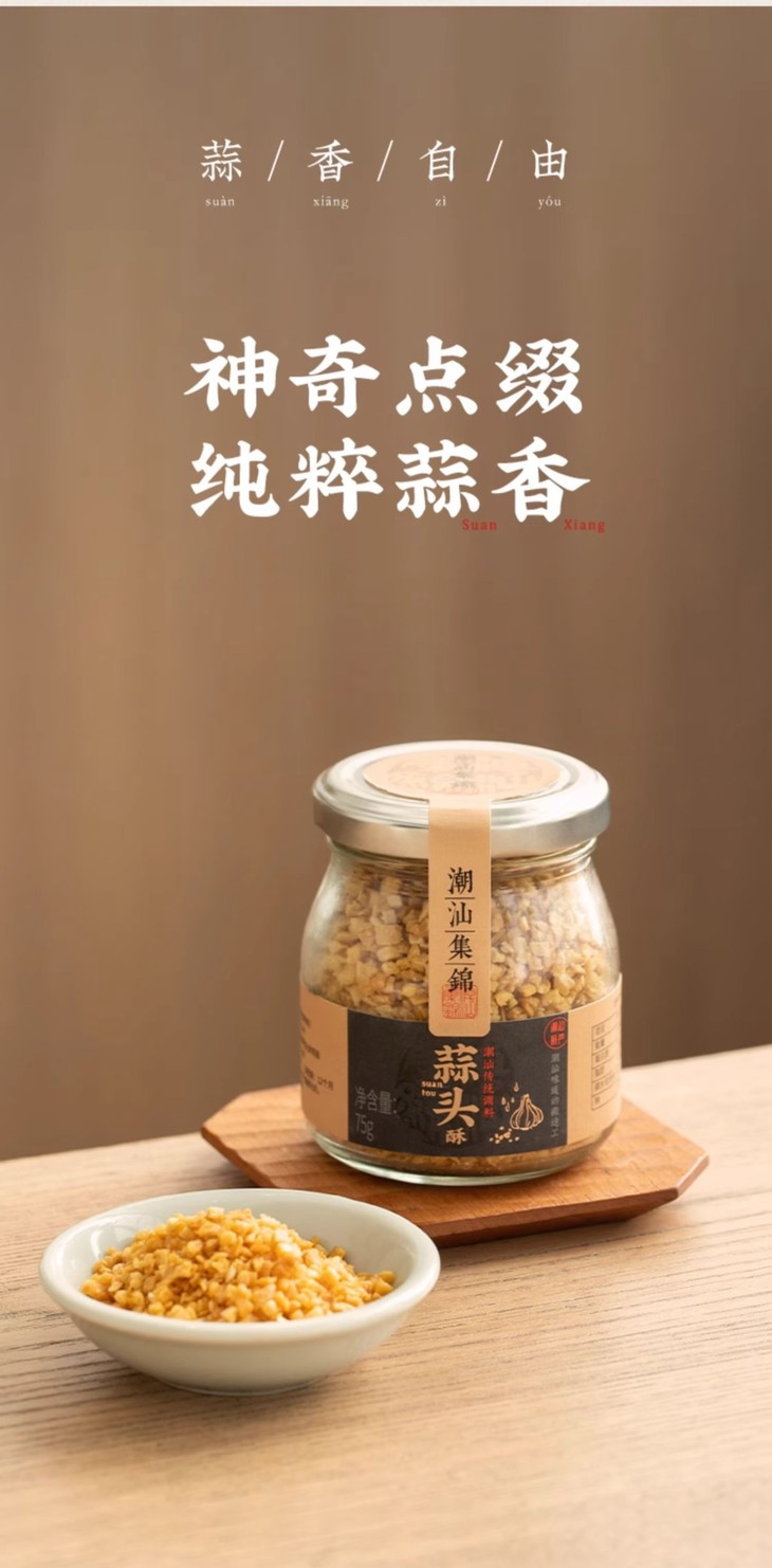 而蒜头酥,则是潮汕人对蒜香风味极致追求的又一力作,它不仅继承了蒜头油的浓郁香气,更添一抹轻盈酥脆的口感,成为餐桌上不可或缺的调味精灵。无论是炒菜时的爆香,煮汤时的提味,还是烧烤、蘸料中的点睛,蒜头酥总能以其独特的魅力,为每一餐增添一抹不可言喻的风味。大蒜独有的香韵在口中化作脆香交织的美妙体验,令人一试难忘,回味无穷。即便是日常的白灼青菜,或是简单的一碗汤粉,有了蒜头酥的点缀,也能瞬间焕发非凡美味!