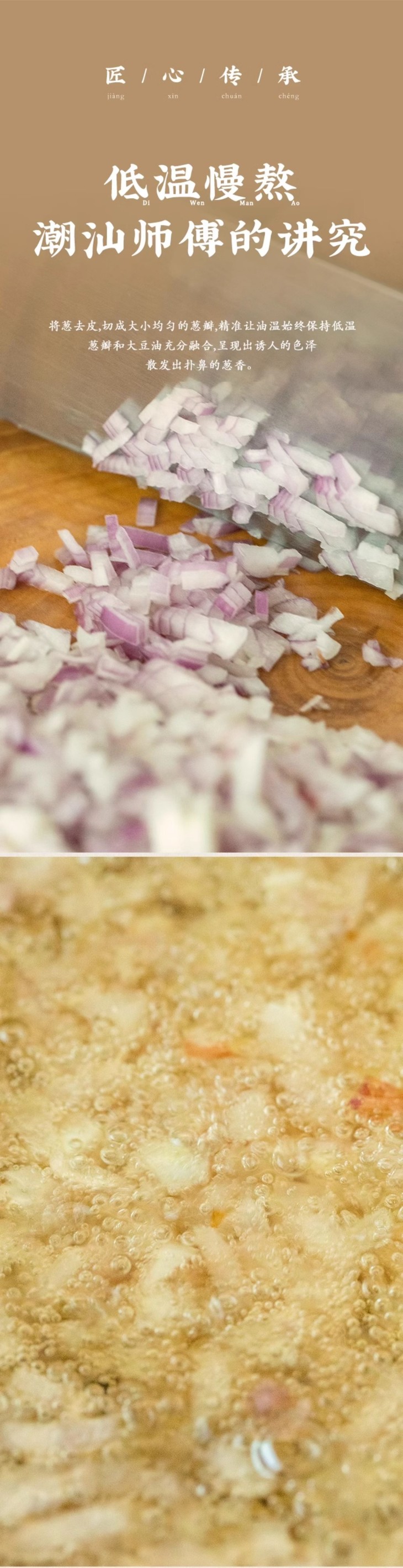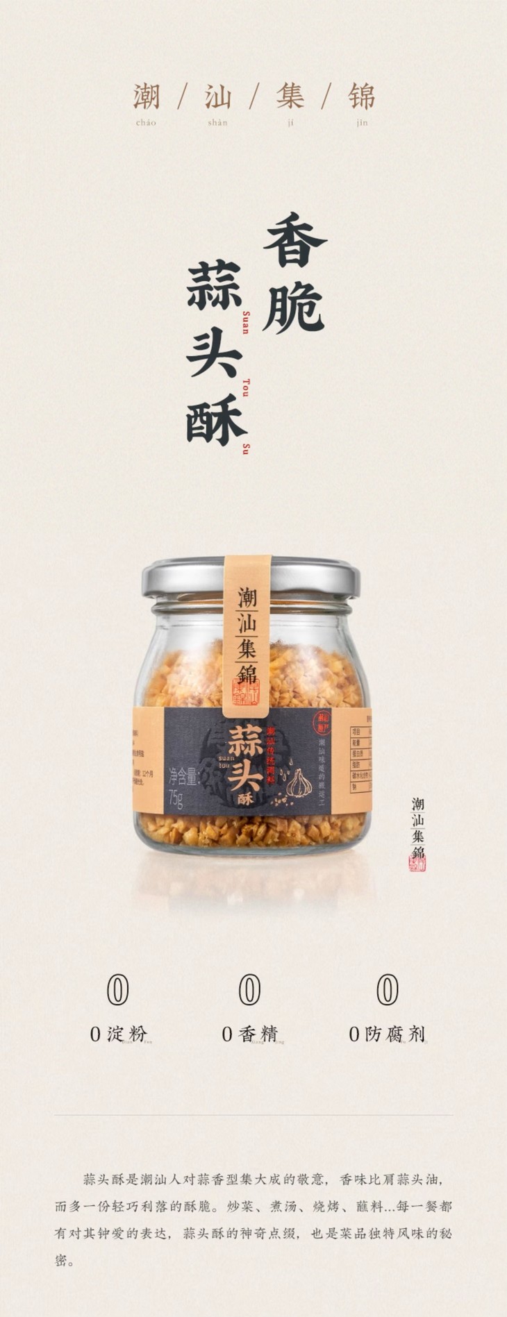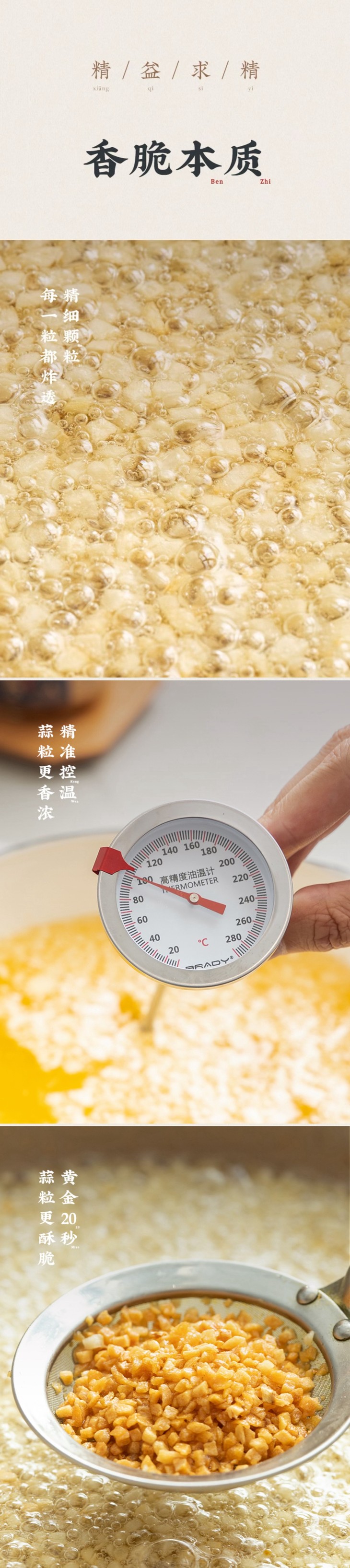 而蒜头酥,则是潮汕人对蒜香风味极致追求的又一力作,它不仅继承了蒜头油的浓郁香气,更添一抹轻盈酥脆的口感,成为餐桌上不可或缺的调味精灵。无论是炒菜时的爆香,煮汤时的提味,还是烧烤、蘸料中的点睛,蒜头酥总能以其独特的魅力,为每一餐增添一抹不可言喻的风味。大蒜独有的香韵在口中化作脆香交织的美妙体验,令人一试难忘,回味无穷。即便是日常的白灼青菜,或是简单的一碗汤粉,有了蒜头酥的点缀,也能瞬间焕发非凡美味!