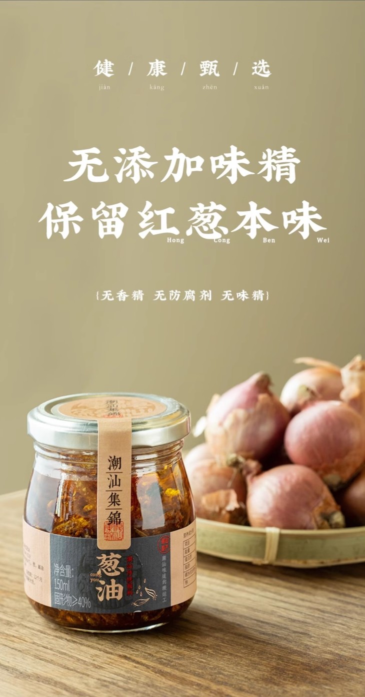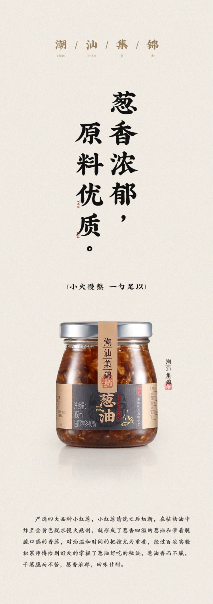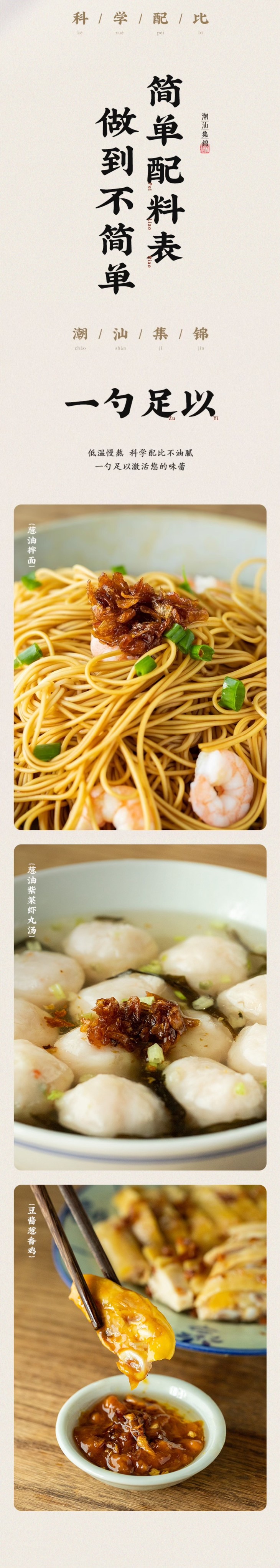 蒜头油、蒜酥、葱油,每瓶都是150ml,虽然很mini,但每次只要一点点,也是能吃好久了!其实不是只限潮汕菜,我平时做什么菜都会随手来一点,非常点睛,尤其是拌面浇汁蘸料,就算厨艺不佳,只要把它们加到黄豆酱、酱油和醋里,就完全不会出错,来点香菜、小米辣更佳!