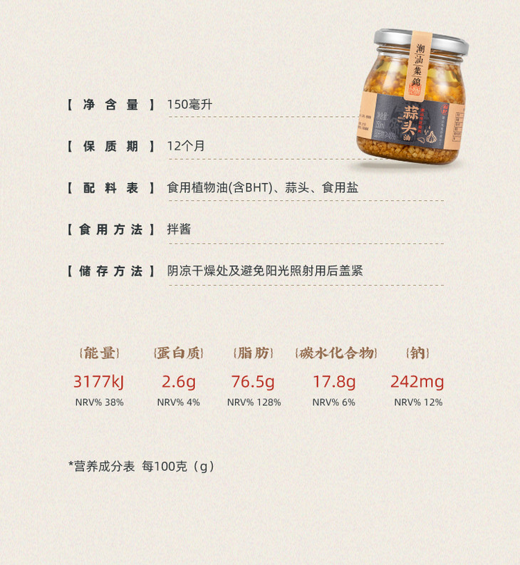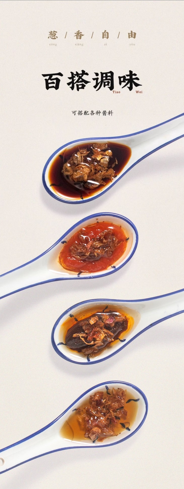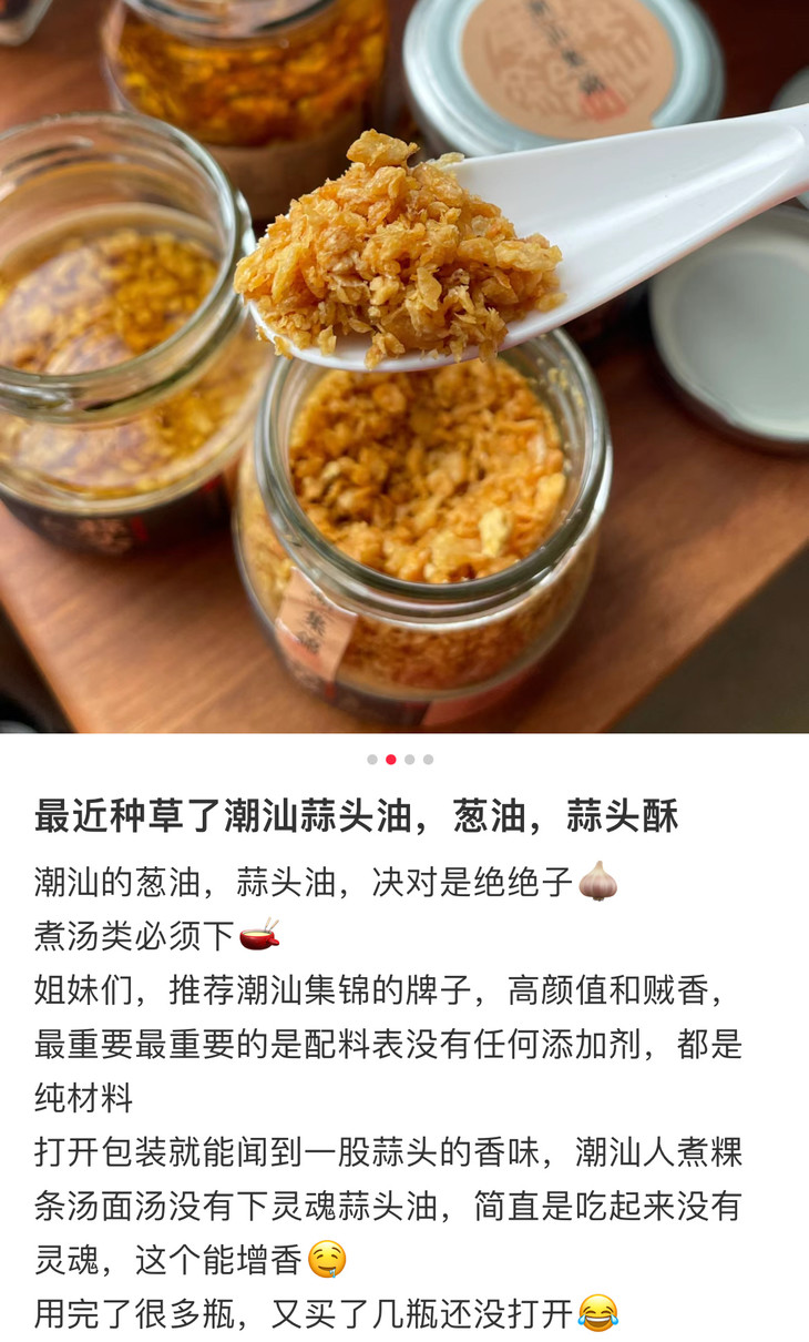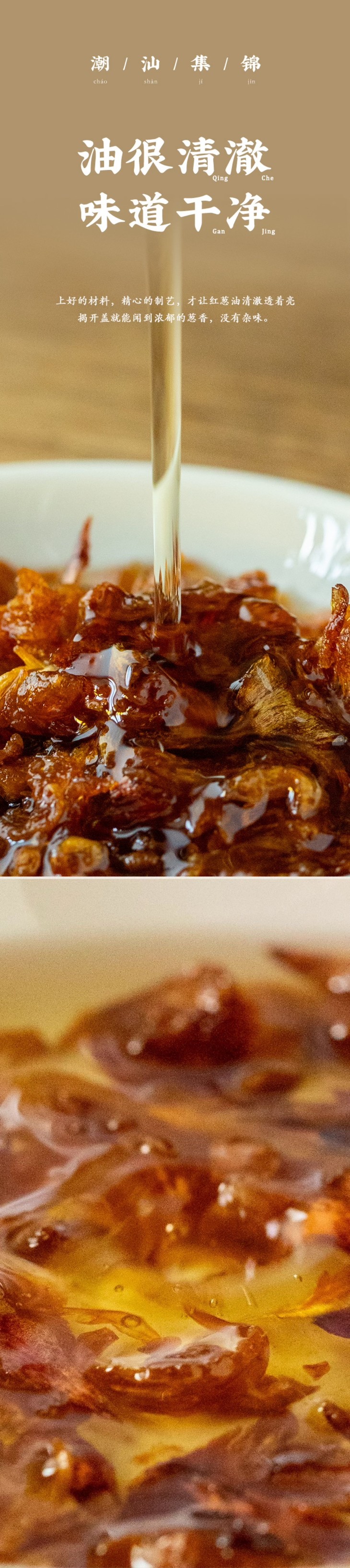 蒜头油、蒜酥、葱油,每瓶都是150ml,虽然很mini,但每次只要一点点,也是能吃好久了!其实不是只限潮汕菜,我平时做什么菜都会随手来一点,非常点睛,尤其是拌面浇汁蘸料,就算厨艺不佳,只要把它们加到黄豆酱、酱油和醋里,就完全不会出错,来点香菜、小米辣更佳!