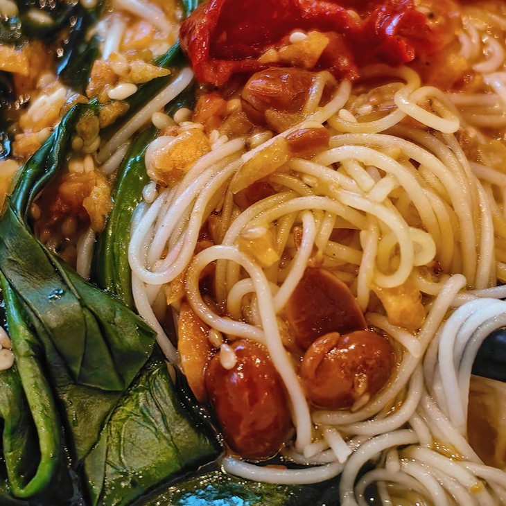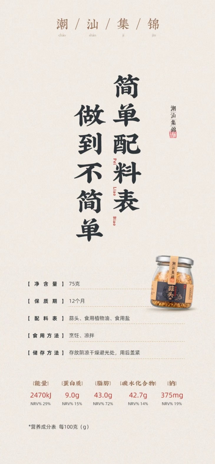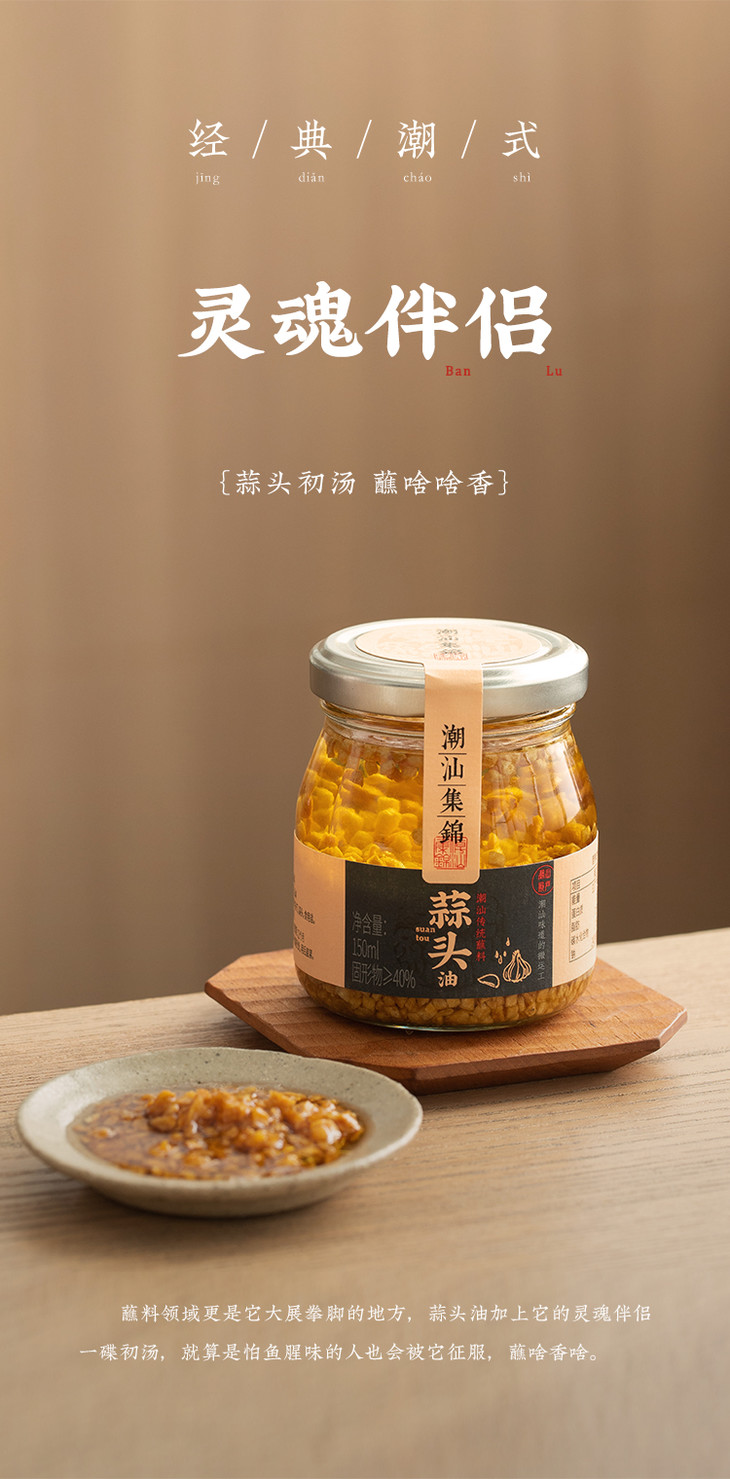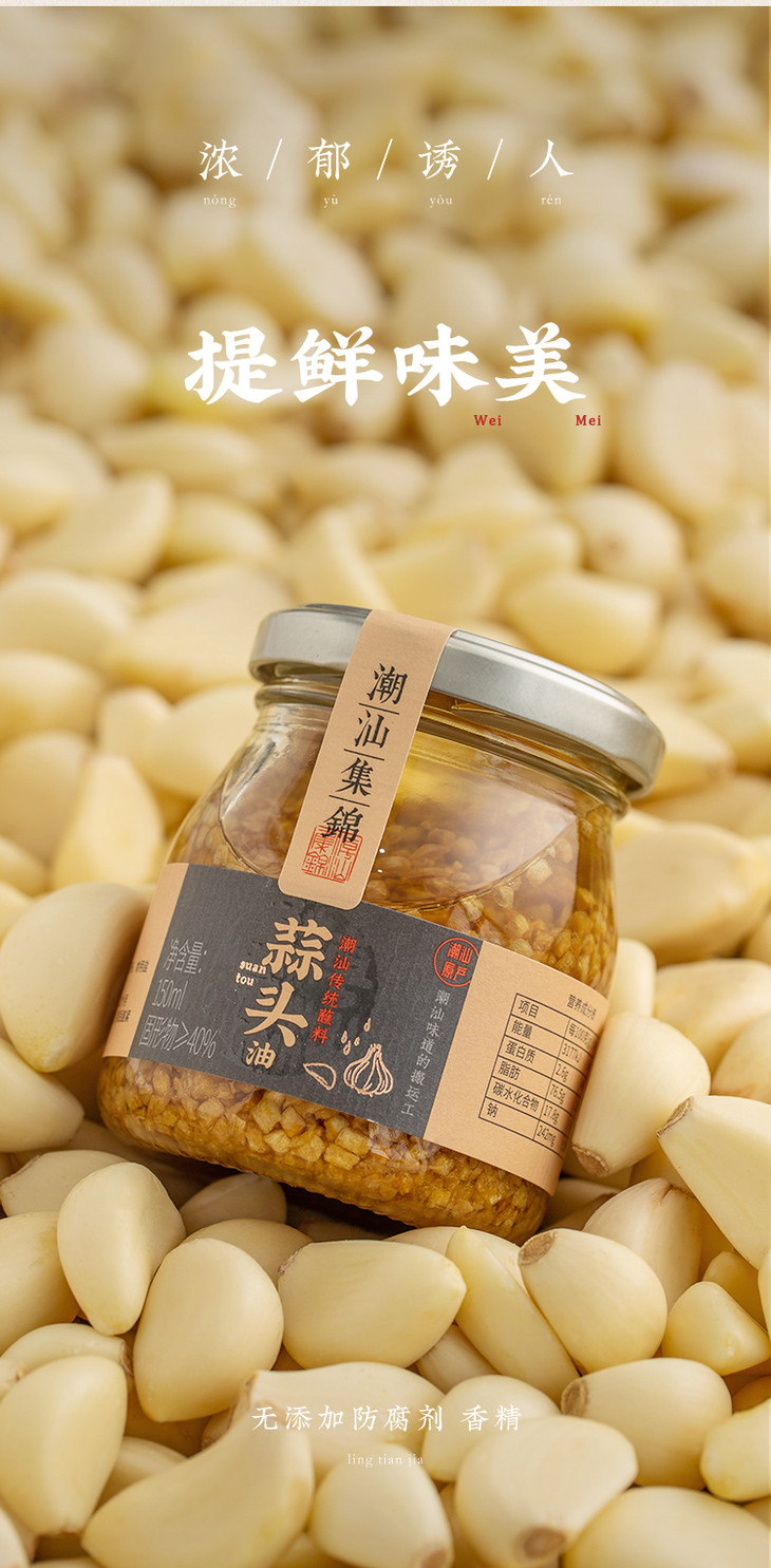 在潮汕美食的璀璨星河中,蒜头油无疑占据着“黄金配角”的显赫地位,蕴含着醇厚馥郁的蒜香,为各式佳肴添上一抹不可复制的升华。潮汕集锦的蒜头油,精选上乘鲜蒜与优质大豆油,无防腐剂、无味精,颗颗饱满晶莹,蒜香扑鼻,再加上优质大豆油的完美融合,在潮汕大厨的低温慢熬工艺下,成就了一抹无论搭配何种酱料都能成为点睛妙笔的神奇存在。煮一锅香气四溢的牛肉丸汤,或是简单白灼的蔬菜,只需轻轻一勺蒜头油,便能瞬间唤醒食材的本真鲜味。即便是白切等需蘸酱的料理,蒜头油的加入也是点睛之笔,让风味更上一层楼!我还很喜欢自己加白芝麻拌上,更香!