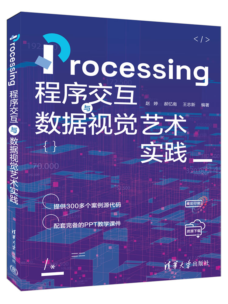 【前言】在当今大数据与数字媒体盛行的时代,数据信息视觉化对于大多数人来说并不陌生。它涵盖了统计图表、流程图、分组信息图、地图演示等多种形式,并涉及版面设计、色彩设计、图形设计及交互设计等多个艺术领域,是一个融合了多学科知识的视觉设计范畴。艺术与科技的紧密结合,正是推动数据视觉艺术设计不断创新和发展的源泉与动力。在向观众展示数据视觉艺术作品时,如何进行有效展示成为关键问题。当前市场上,关于数据视觉化设计的书籍大多侧重于学术论文的形式,鲜有作品深入剖析实际构建和表达的具体过程。尽管设计领域的书籍为数据视觉艺术设计提供了一定的指导,但它们往往只停留在静态展示层面,忽略了动态展示的重要性,以及基于软件的视觉化解决方案的可实施性。《Processing程序交互与数据视觉艺术实践》旨在为有意创作个人数据视觉艺术作品的读者提供宝贵的实践经验与实用技巧,为其顺利踏入这一复杂而富有创造性的领域提供助力。具体而言,本书着重将创意理念从理论层面转化为实际操作,而非局限于学术性的探讨。书中详尽阐述了从数据收集到深入解析的每一步流程,并采用直观易懂、互动性强的方法来高效呈现海量信息,为视觉化设计工作搭建一套全面且系统的框架。书中选用了Processing这一简单易学的编程环境,使读者能够轻松学习编程,并迅速编写代码以生成视觉图像。Processing作为一款方便灵活且富有创意的编程工具,以其简洁明了的语法,使用户能够高效地创作出丰富多样的图形交互和数据视觉艺术作品。作为一款免费下载和开源的程序,Processing具备使用成本低、操作简便,以及执行效率高等显著特点。《Processing程序交互与数据视觉艺术实践》高度重视设计思维与创作实践的深度融合,通过一系列丰富的编程实例,引领读者从数据视觉化的基础知识、图形绘制技巧开始,逐步深入生成艺术和动态视觉效果的创作领域,进而探讨数据的视觉表达、获取与应用之道,旨在帮助读者掌握生成多种实时互动数据可视化样式的方法,最终实现个性化用户界面的定制目标。书中特别强调利用Processing编程,从文本、表格、网络、传感器、摄像头等多种渠道获取数据,并通过实时交互的方式,将这些数据创造性地映射为图像或声音,展现出数据的无限魅力。《Processing程序交互与数据视觉艺术实践》汇集了众多一线专业教师提供的经典案例与创新教学经验,这些宝贵资源也是河北师范大学2023年度教学改革研究与实践项目;数字媒体艺术专业交互设计课程教学改革研究的核心成果。书中的大部分示例代码均独立编写,从零基础出发,不依赖任何预制图表工具包,而是深入展示了如何利用点、线、图形及文本等基础元素,创造性地构建个性化的数据可视化作品。此外,书中还阐述了数据如何通过多种创新形式进行展现,每一种形式都独具展示魅力和交互体验,为读者提供了丰富的学习资源与实践路径。除了利用官网提供的丰富学习资料,读者还可以通过阅读编者所著的另外两本书籍来深化学习,即由清华大学出版社出版的《Processing创意编程与交互设计》和《Processing程序交互与动态视觉设计实战》。前者专注于引导读者迅速掌握Processing编程的基础知识,为创意设计与交互实现打下坚实基础;后者则通过丰富的实践应用案例,将理论知识巧妙融入实际项目中,让读者在动手实践中充分领略动态视觉设计的魅力与无限可能。本书提供了330多个精心设计的代码示例,这些示例与各章节内容紧密结合,旨在帮助读者循序渐进地学习和提升技能。读者也可在此基础上进行拓展,创作出更多的数据视觉艺术作品。为便于学生学习和教师开展教学工作,本书还提供了教学课件。读者可扫描右侧的二维码,将学习资源推送到自己的邮箱后即可下载获取。本书由赵婷、郝忆南、王志新编著。由于编者水平所限,书中难免有疏漏和不足之处,恳请广大读者批评指正,提出宝贵的意见和建议。