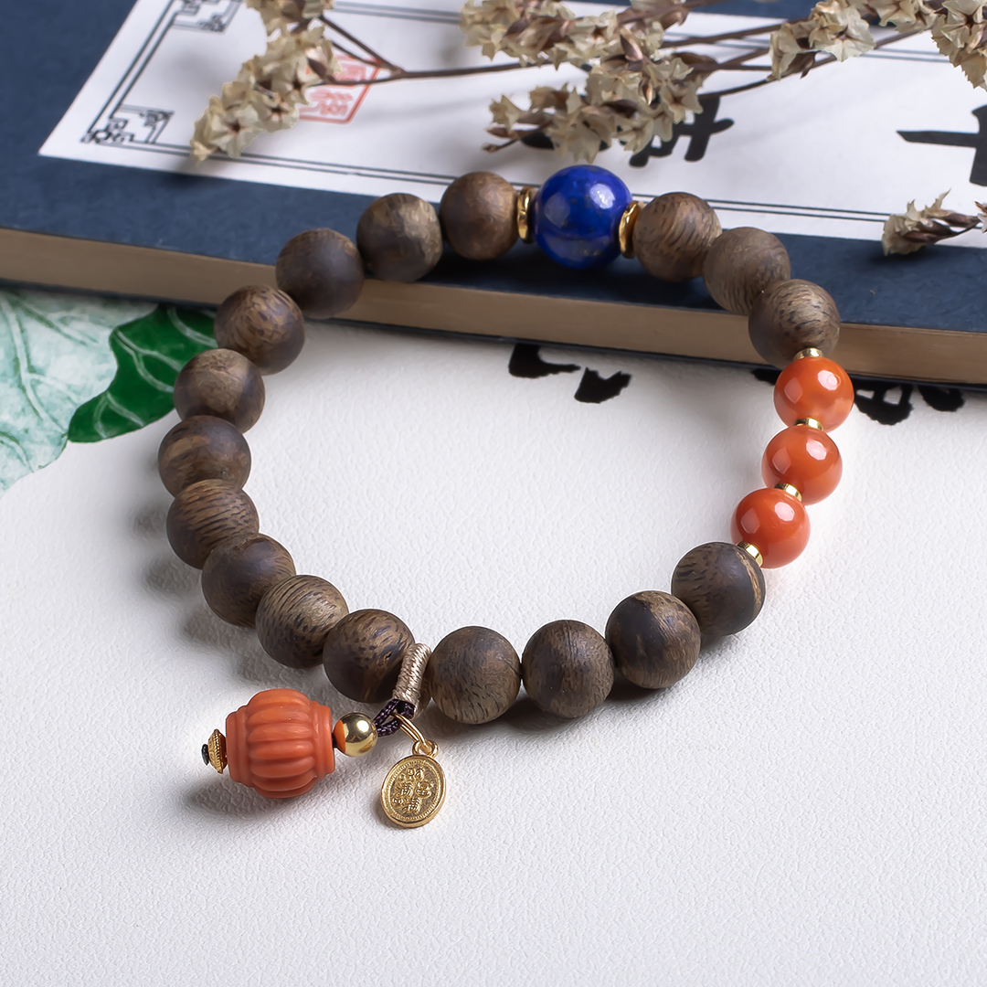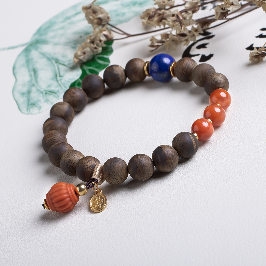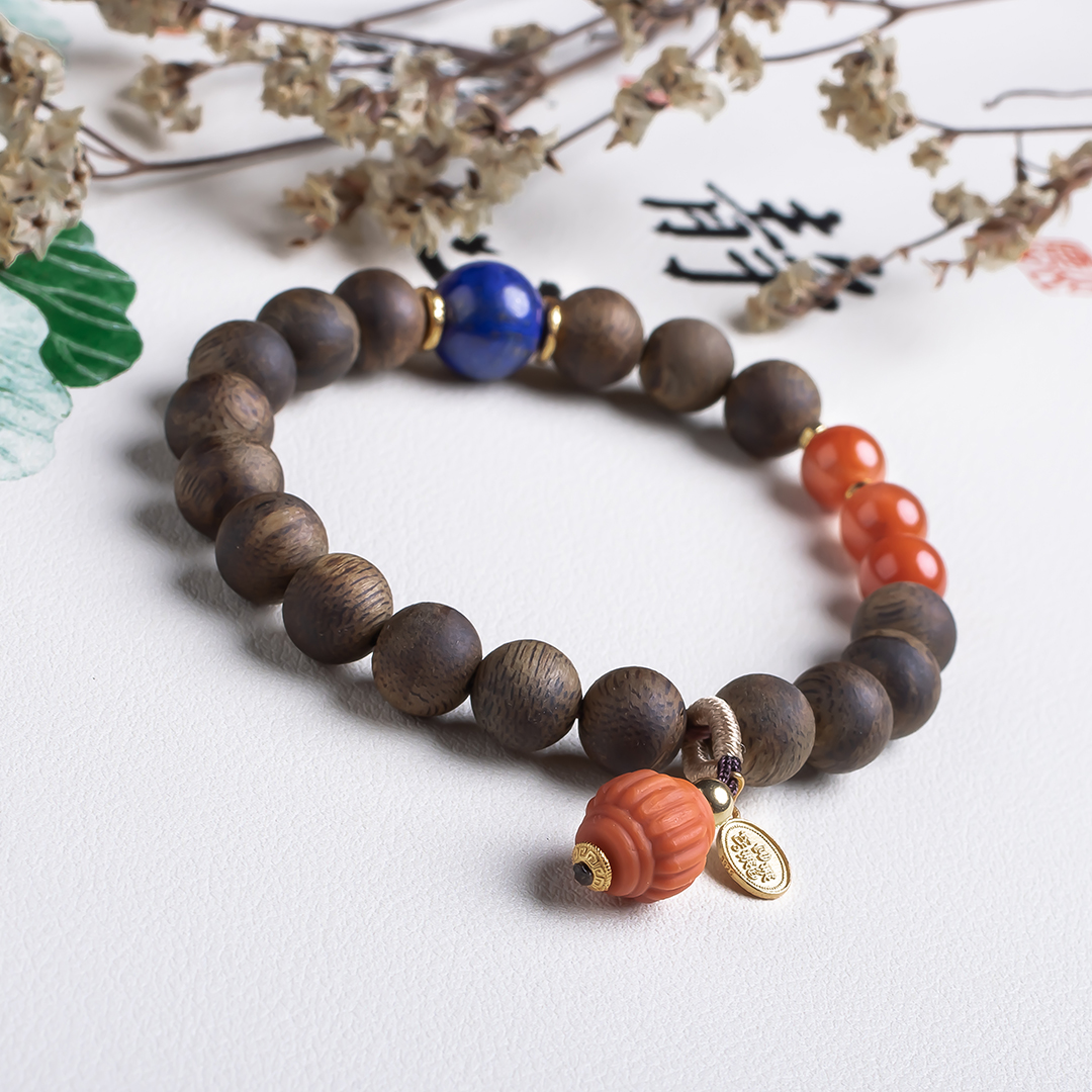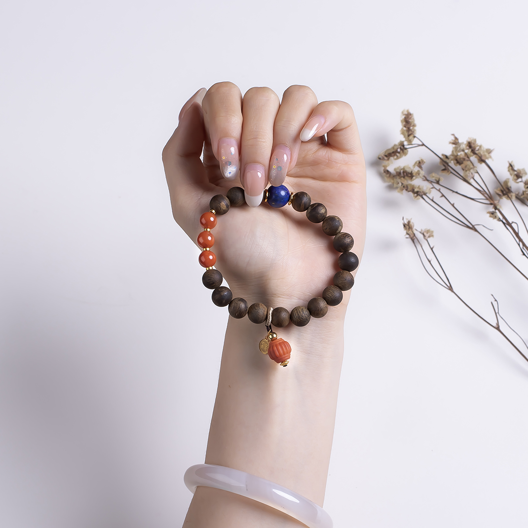 xy0537沉香+青金石南红国风手串.银,天然沉香约9mm,原色原味,香味自然清甜,青金石搭三颗满色肉的南红圆珠,一枚平安多财提溜加一颗满色肉南红灯笼珠,喜庆吉祥、好运。