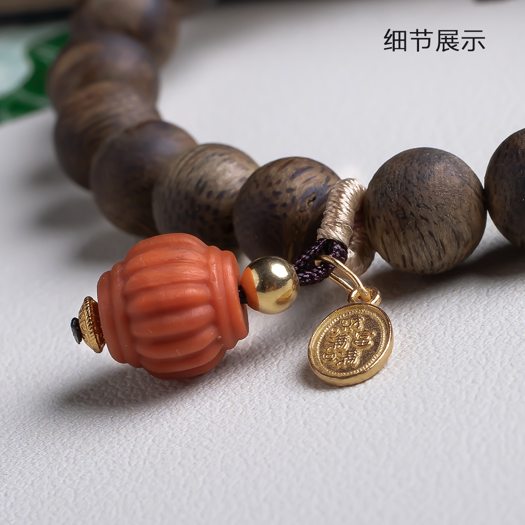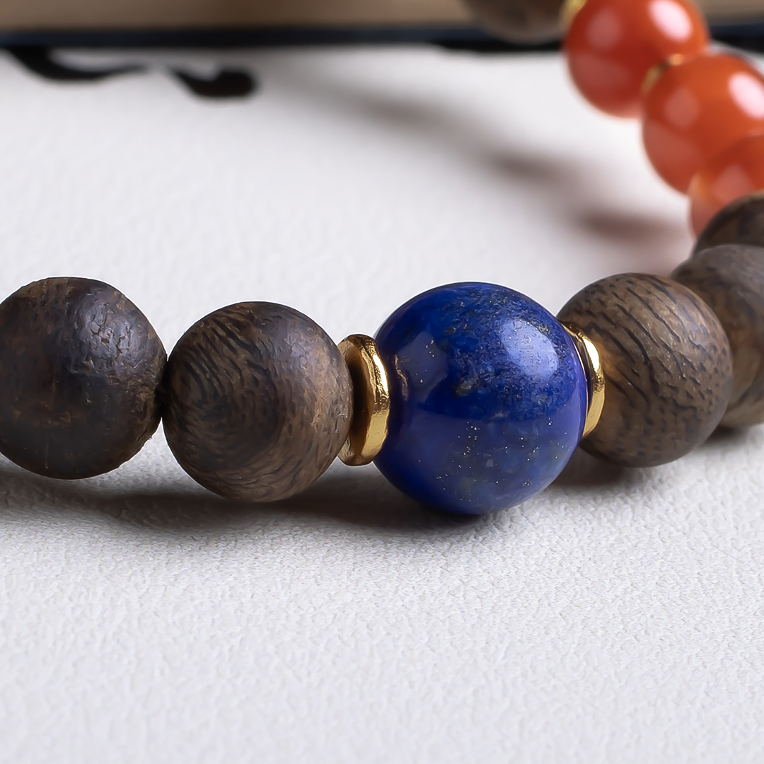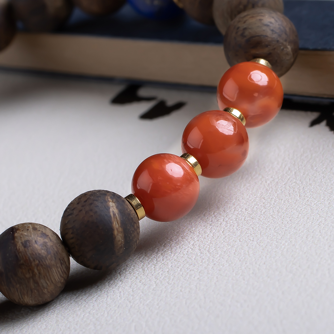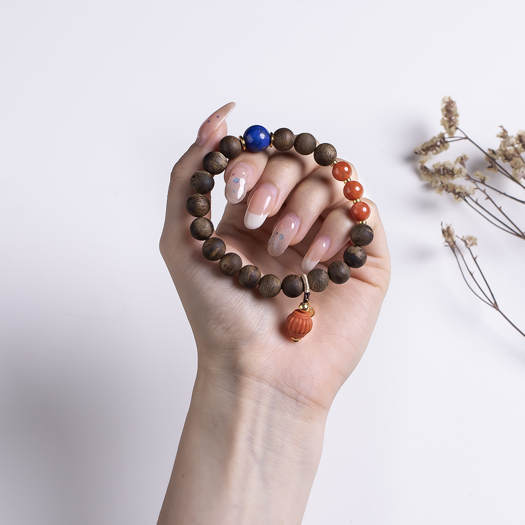 xy0537沉香+青金石南红国风手串.银,天然沉香约9mm,原色原味,香味自然清甜,青金石搭三颗满色肉的南红圆珠,一枚平安多财提溜加一颗满色肉南红灯笼珠,喜庆吉祥、好运。